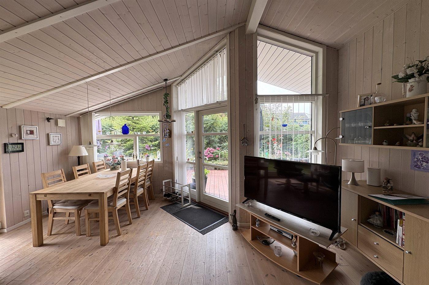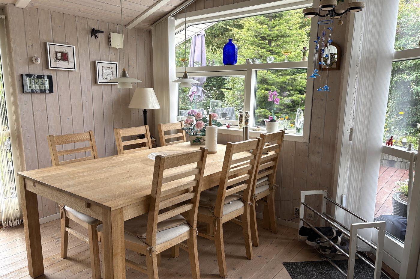 Das Haus ist mit einem gemütlichen Wohnzimmer mit Essplatz und Zugang zur Terrasse, die teilweise überdacht ist, eingerichtet. Von der Küche aus gelangst du auf eine weitere Terrasse mit Blick in den Garten.