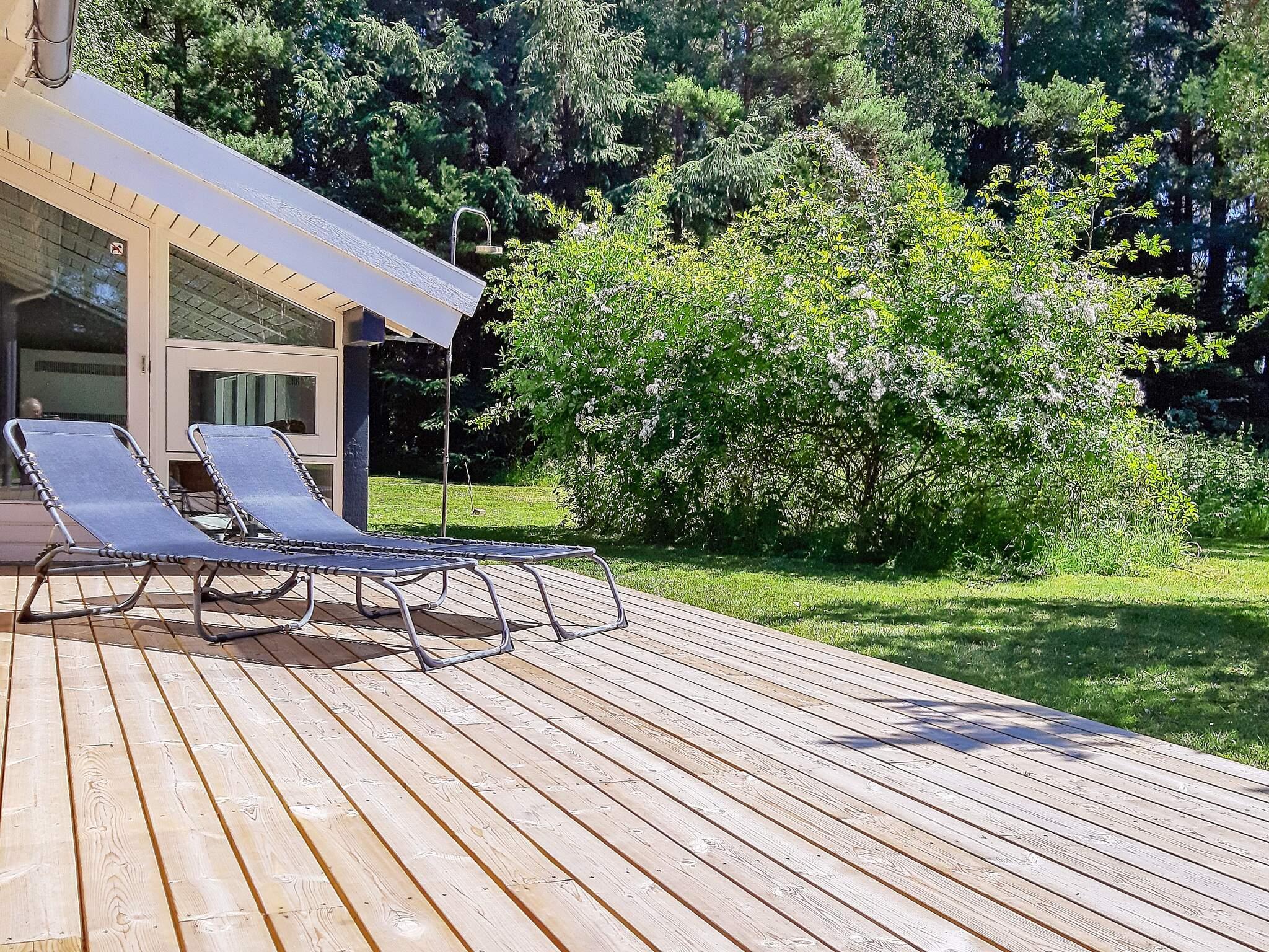 Draußen auf dem schönen Naturgrundstück mit Rasen und Tor für Ballspiele sowie Sandkasten und Schaukel steht auch eine Feuerstelle für ein gemütliches Lagerfeuer bereit. Praktische Außendusche z.B. für sandige Füße oder eine Erfrischung zwischendrin. Auf der kleineren Terrasse nach Osten können Sie das Frühstück genießen. Vom Wohnbereich aus hat man zudem Zutritt zu einer größeren, teils überdachten Terrasse, die sich u.a. für Grillabende anbietet. Das weitläufige Naturgrundstück ist schön abgeschirmt.