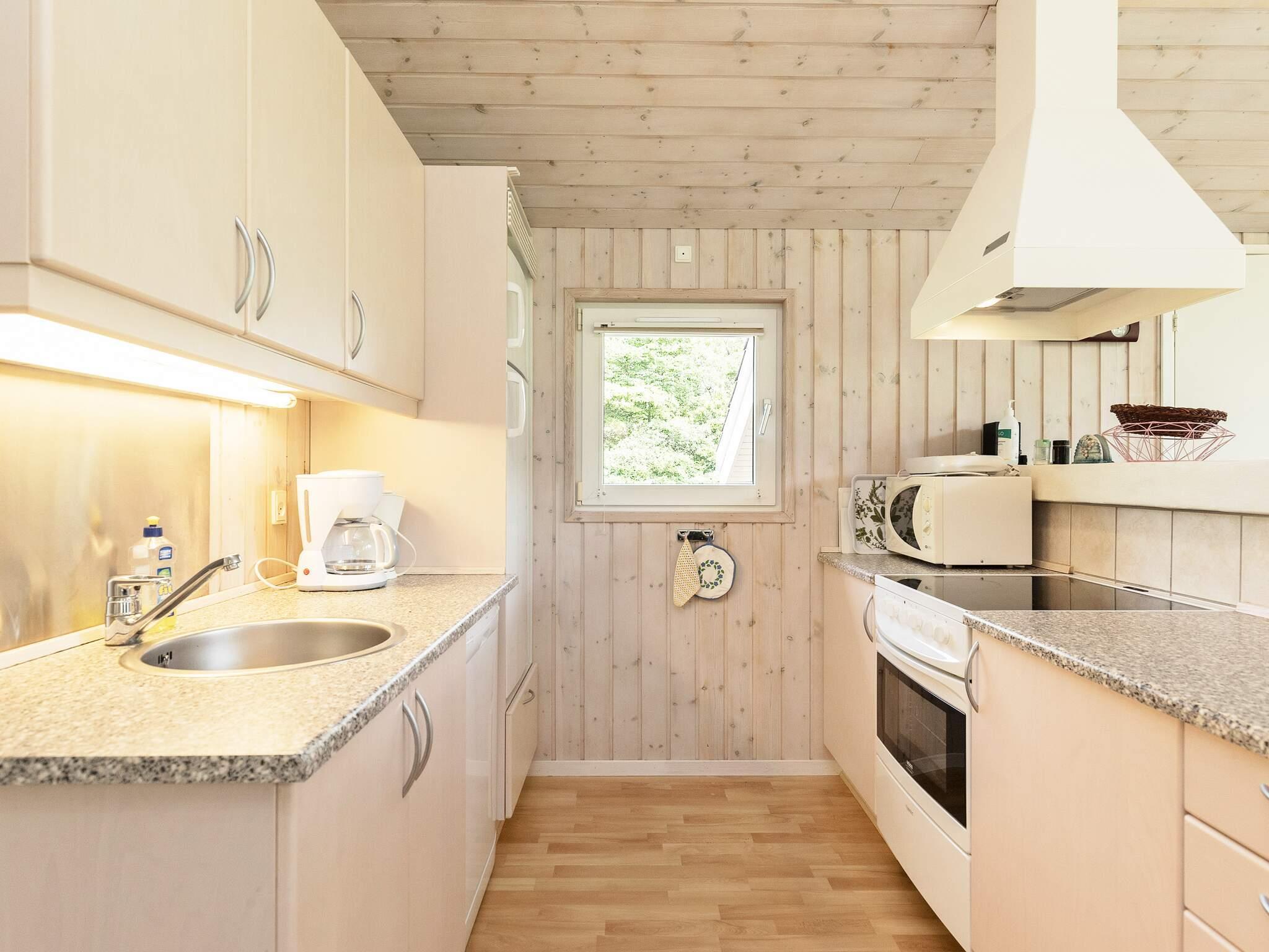 Außerdem heller, offener Küchen-/Wohnbereich mit Essecke vor dem Fenster und gemütlicher Sitzecke. Von hier hat man Zugang zur teilweise überdachten Holzterrasse mit Sitzgelegenheiten. Für Kinder gibt es Sandkasten und Schaukel auf dem Naturgrundstück.