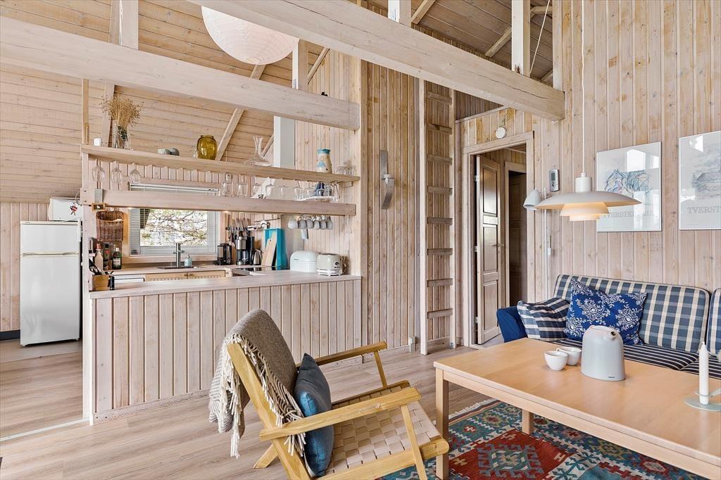 Innen empfängt dich das Ferienhaus mit einer hellen und freundlichen Einrichtung. Dank des offenen Giebeldachs und der großen Fensterfront fällt viel Tageslicht in das Wohnzimmer. Hier könnt ihr euch zu gemütlichen Mahlzeiten am Esstisch versammeln oder euch für einen entspannten Abend aufs Sofa zurückziehen, während die Farben der Natur und der Wechsel der Jahreszeiten den Hintergrund gestalten. Die offene Küche sorgt für ein schönes Gemeinschaftsgefühl, sodass ihr euch unterhalten könnt, während das Essen zubereitet wird. Ein zusätzliches Highlight ist das separate Gästehaus mit Doppelbett, eigenem Bad und WC – perfekt für alle, die etwas Privatsphäre genießen möchten und dennoch nah am gemeinsamen Urlaubsgeschehen sein wollen.