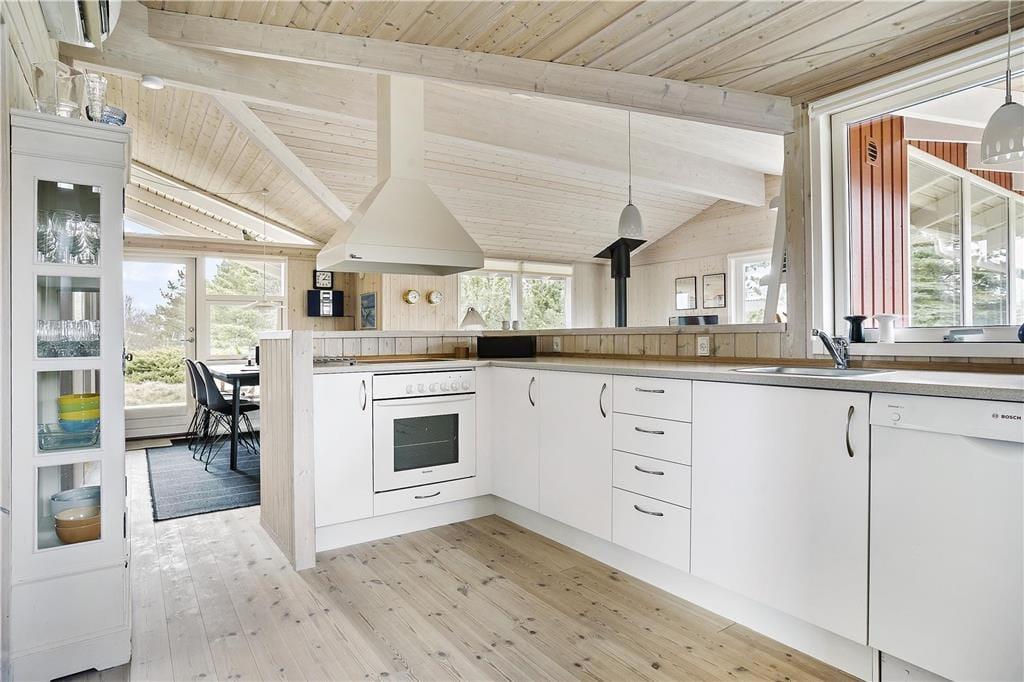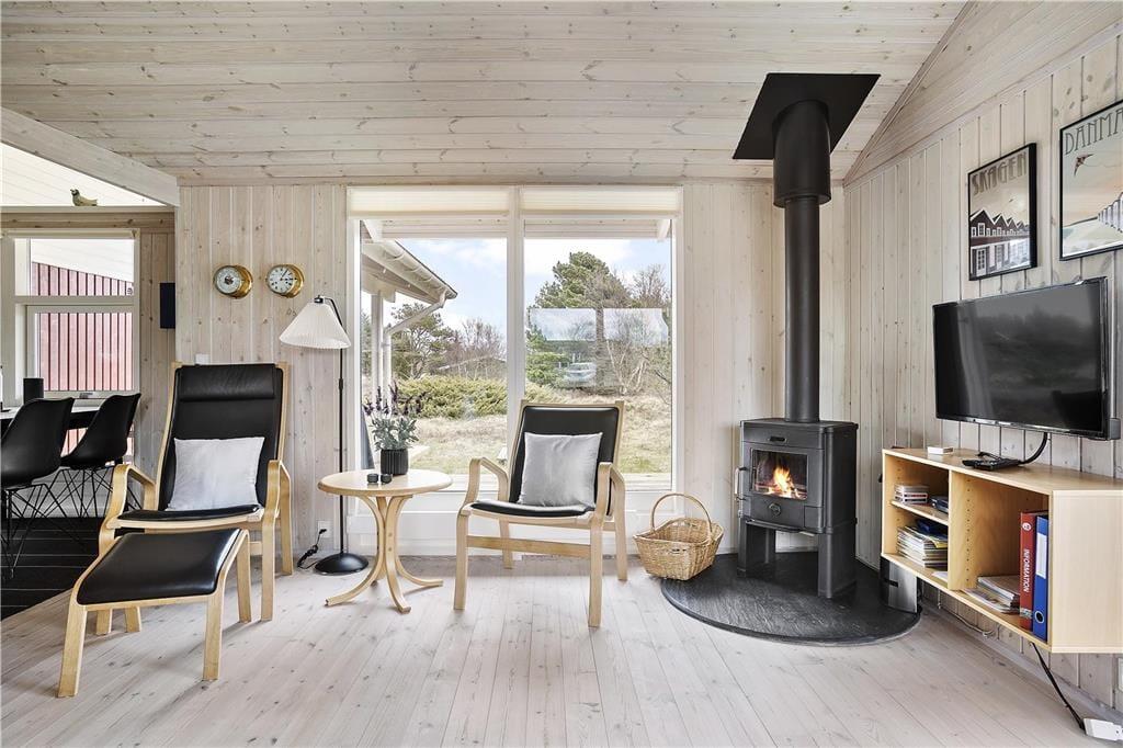 Beim Betreten des Ferienhauses empfängt dich ein helles und einladendes Interieur, bei dem jede Kleinigkeit bedacht wurde, um eine gemütliche und angenehme Atmosphäre zu schaffen. Der offene Wohnbereich verbindet Wohnzimmer und Küche und bildet einen natürlichen Treffpunkt für die ganze Familie. Große Fenster bieten nicht nur einen schönen Ausblick auf die umliegende Natur, sondern lassen auch viel Tageslicht herein, das den Raum leicht und luftig wirken lässt. Am Abend kannst du dich in den bequemen Möbeln entspannen, ein gutes Buch genießen oder einen Film auf dem Flachbildfernseher schauen, während der Kamin Wärme und Gemütlichkeit verbreitet.