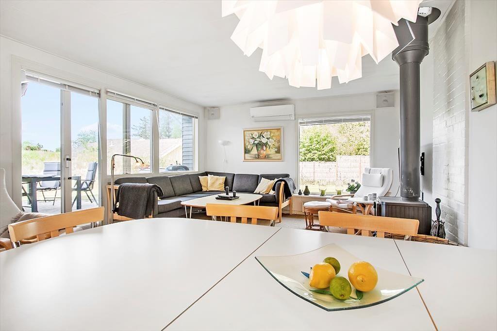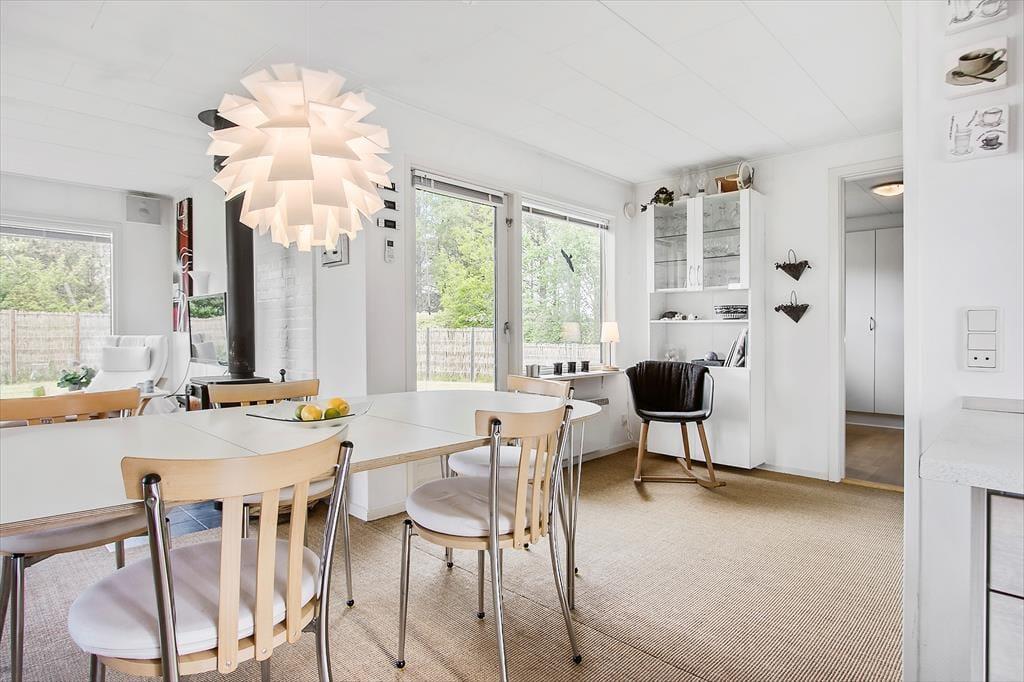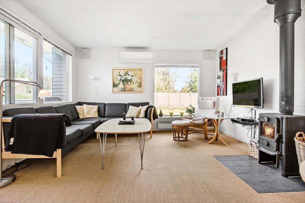 Sobald du das Ferienhaus betrittst, wirst du von einem hellen und geräumigen Wohnzimmer empfangen, in dem die offene Verbindung zur gut ausgestatteten Küche eine gemütliche und soziale Atmosphäre schafft. Hier kann sich die ganze Familie um den Esstisch versammeln oder sich auf der Couch entspannen, um einen guten Film zu sehen. Wenn das Wetter nicht zu Outdoor-Aktivitäten einlädt, kannst du die Wärme des Kamins genießen, der die perfekte Stimmung zum Entspannen schafft. Die großen Fenster lassen viel schönes Licht herein, und die gut ausgestattete Küche macht es einfach, sowohl kleine Mahlzeiten als auch Festessen vorzubereiten. Im Hauswirtschaftsraum findest du praktischen Platz für Waschmaschine und Aufbewahrung. Mit mehreren schönen Schlafzimmern gibt es ausreichend Platz, sodass sowohl Große als auch Kleine eine erholsame Nachtruhe finden und bereit für neue Abenteuer sind.