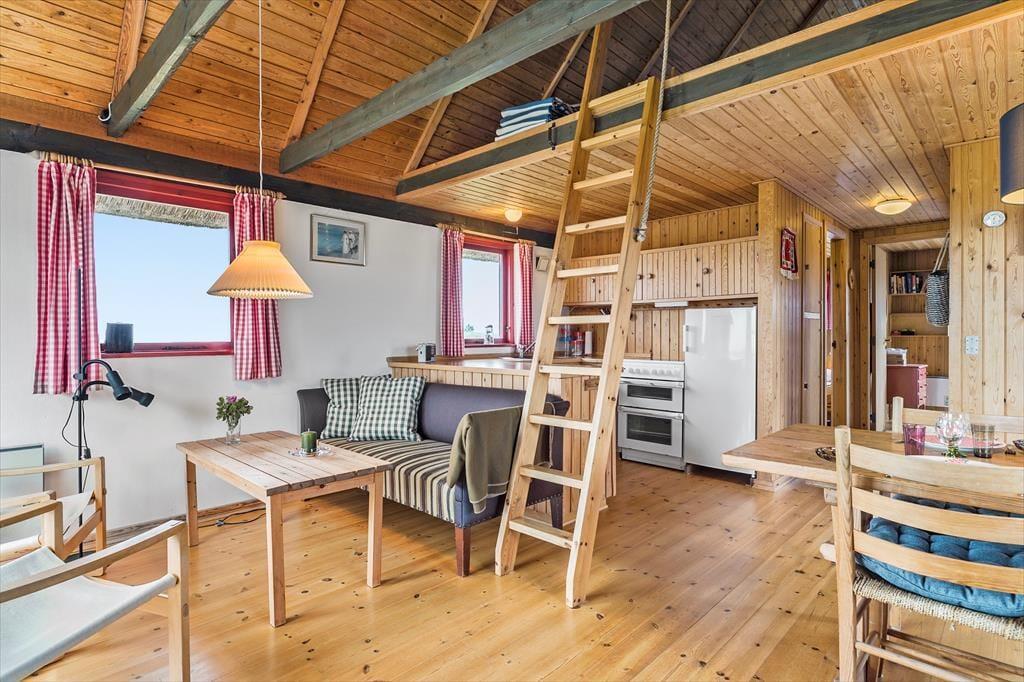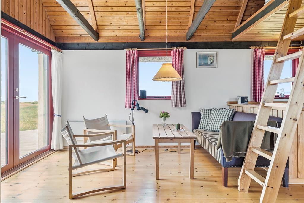 Innen erwartet dich eine helle und einladende Atmosphäre, die den perfekten Rahmen für deinen Urlaub schafft. Die großen Fenster im Wohnzimmer lassen viel Licht herein und öffnen sich zur wunderschönen Natur draußen, sodass du den Meerblick und das Geräusch der Wellen genießen kannst, selbst wenn du drinnen sitzt. Im Wohnzimmer findest du einen gemütlichen Kamin, der es besonders angenehm macht, abends zu entspannen, wenn du einen langen Tag mit Strandbesuchen und Ausflügen hinter dir hast. Die offene Küche erleichtert es, leckere Mahlzeiten zuzubereiten, und wenn du am Esstisch sitzt, kannst du die idyllische Natur bewundern, die das Ferienhaus umgibt.