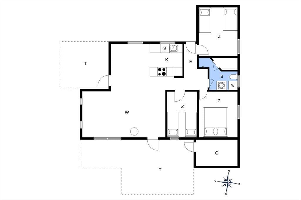 Die gemütlichen Momente des Urlaubs können auch draußen im Freien stattfinden, wo Sie mehrere schöne Terrassenbereiche zur Auswahl haben. Es gibt eine kleine offene Morgenterrasse auf der Ostseite des Hauses und eine teilweise überdachte Westterrasse, aber wahrscheinlich wird die Südterrasse die erste Wahl sein, denn sie ist groß, schön sonnig und gut abgeschirmt – und sie bietet sogar einen schönen Blick auf den hübschen See, der sich zwischen den Sommerhäusern der Gegend erstreckt. Der Gasgrill des Sommerhauses macht es einfach, das Abendessen im Freien zuzubereiten, wenn Sie nicht mit der Familie ins Zentrum von Tversted gehen und in einem Restaurant essen möchten.