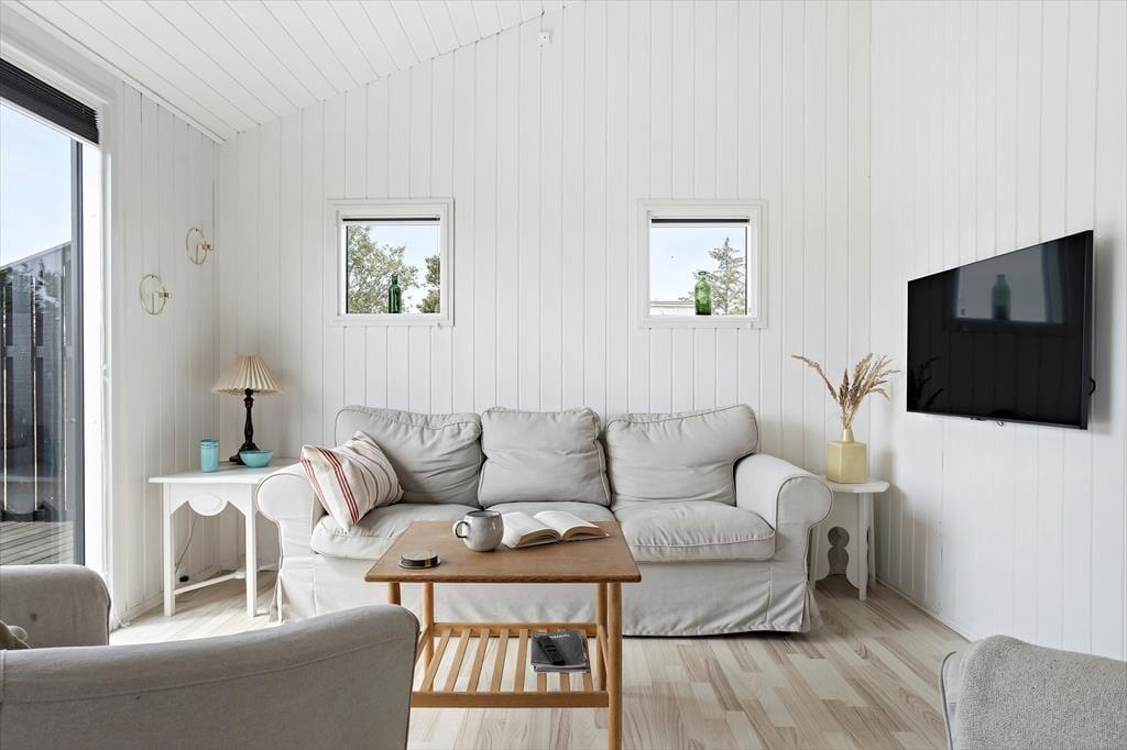 Hinter der dunklen Fassade des Sommerhauses wirken alle Räume hell und luftig. Nicht nur die Wände und die schrägen Decken, sondern auch ein großer Teil des Interieurs sind in hellen Farbtönen gehalten, und sowohl Fenster als auch Terrassentüren sorgen dafür, dass die Sonne von morgens bis abends hereinkommt. Wenn es Schlafenszeit ist – oder wenn Sie eine Pause mit einem spannenden Buch brauchen – können Sie sich in eines der drei guten Schlafzimmer des Sommerhauses zurückziehen. Die meisten wachen Stunden des Tages werden wahrscheinlich im Wohnzimmer verbracht, das mit einem Kamin ausgestattet ist und eine offene Verbindung zu einer gut ausgestatteten zweiseitigen Küche hat.
