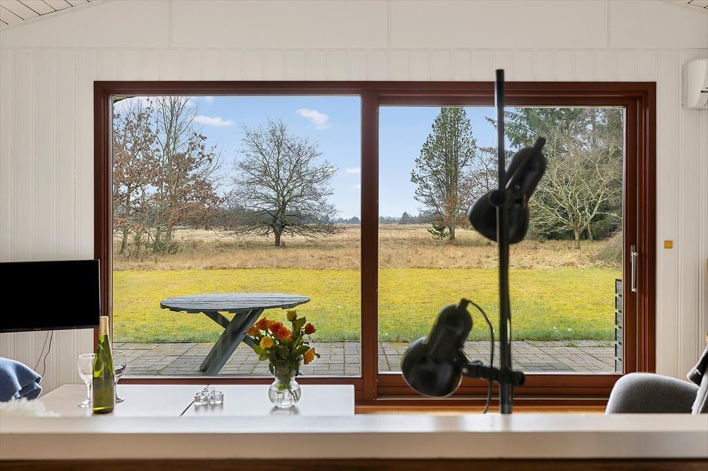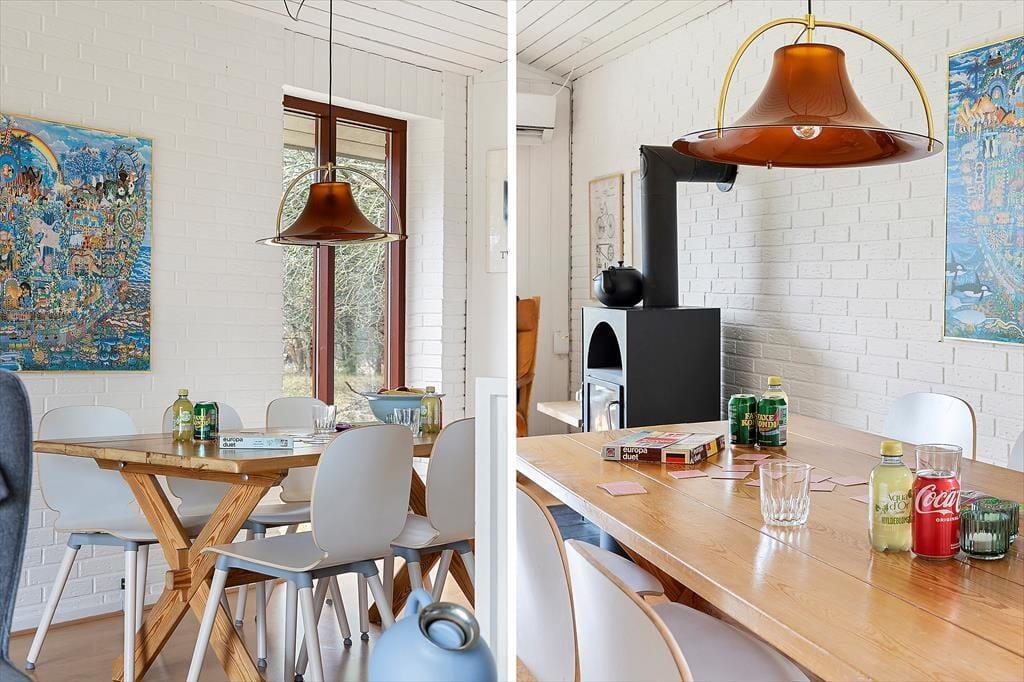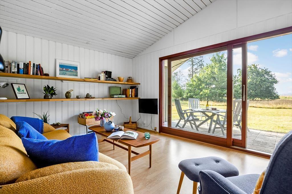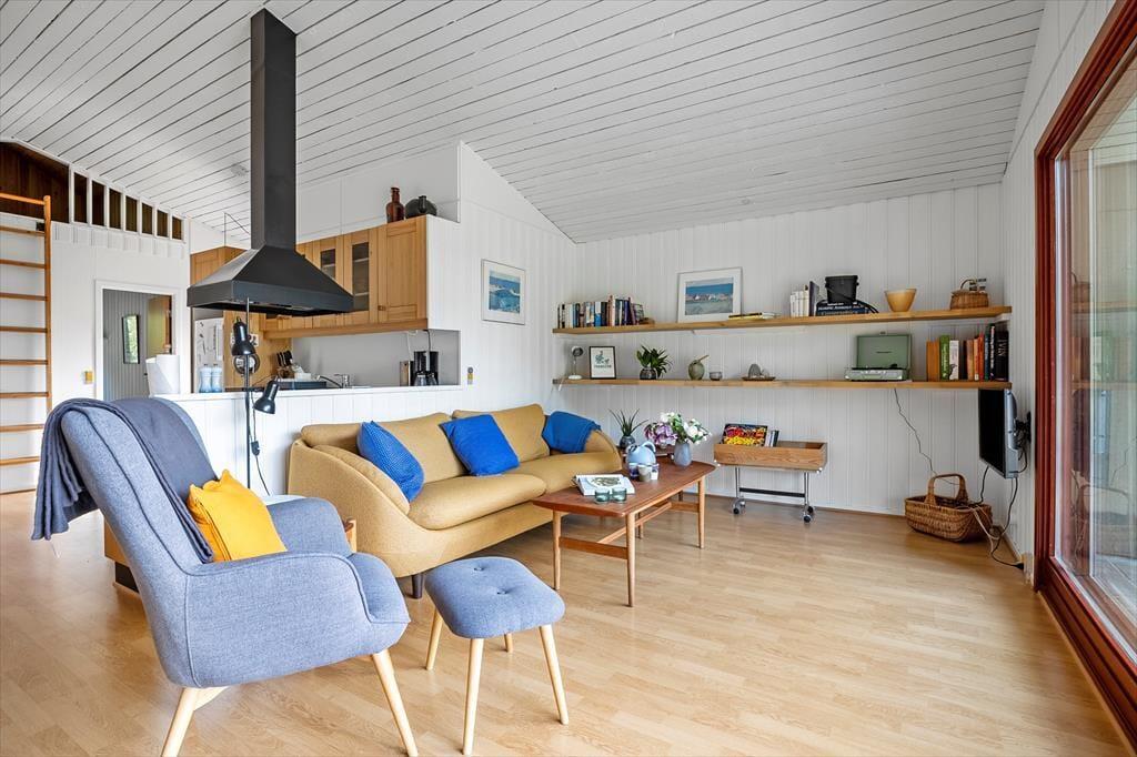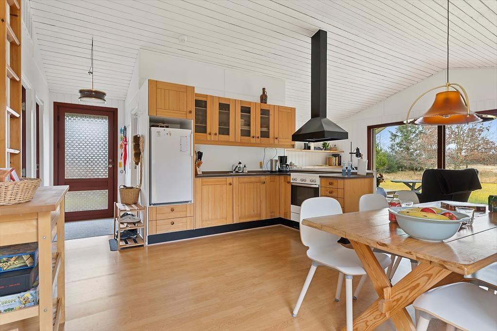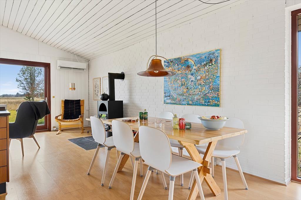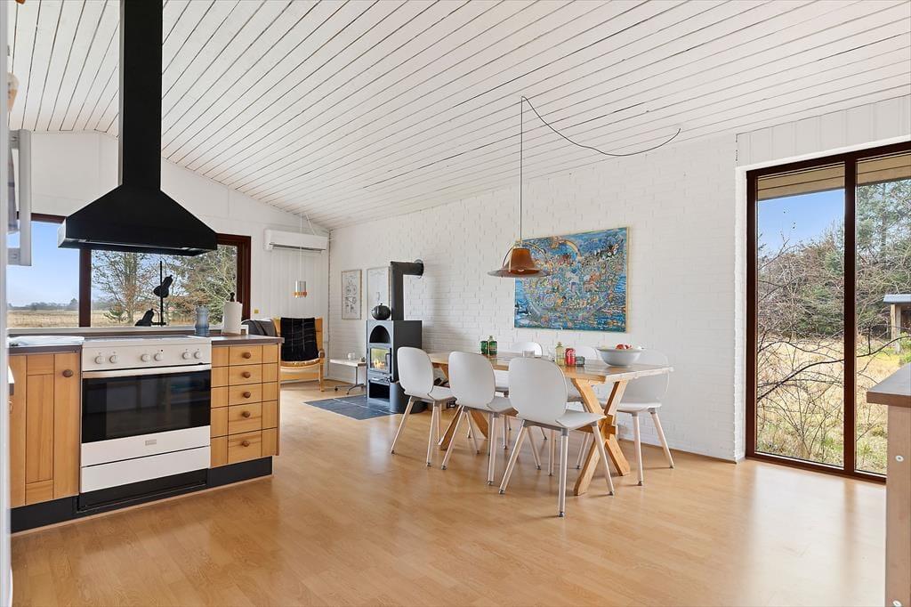 Das Ferienhaus ist klassisch und gemütlich eingerichtet, mit großen Fenstern, die eine helle und einladende Atmosphäre schaffen. Im Wohnzimmer gibt es genügend Platz zur Entspannung – sei es mit einem guten Buch, einem Familienspiel oder einfach beim Genießen des Ausblicks auf die umliegende Natur. Der offene Wohnbereich verbindet Wohnzimmer, Essbereich und Küche, sodass die ganze Familie zusammen sein kann, selbst wenn das Essen zubereitet wird. Die Einrichtung ist schlicht und funktional, und vom Wohnzimmer aus haben Sie direkten Zugang zur Terrasse, wo Sie frische Luft schnappen und die Aussicht auf das Grundstück genießen können.