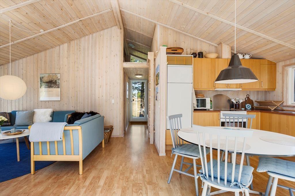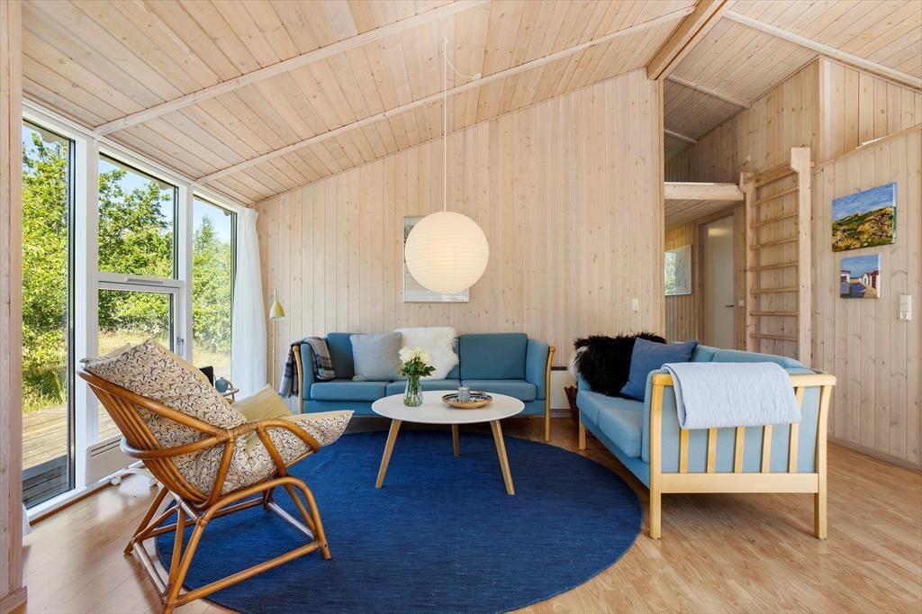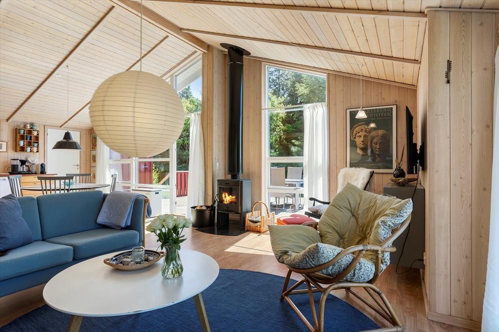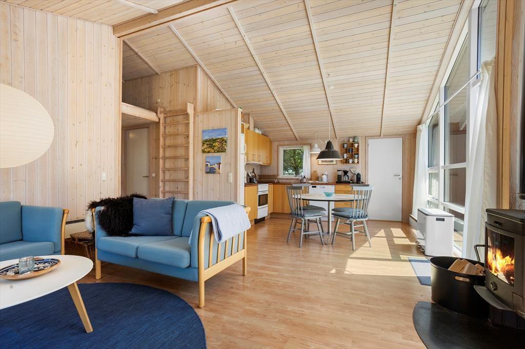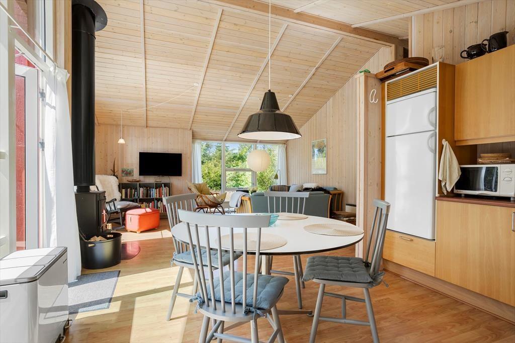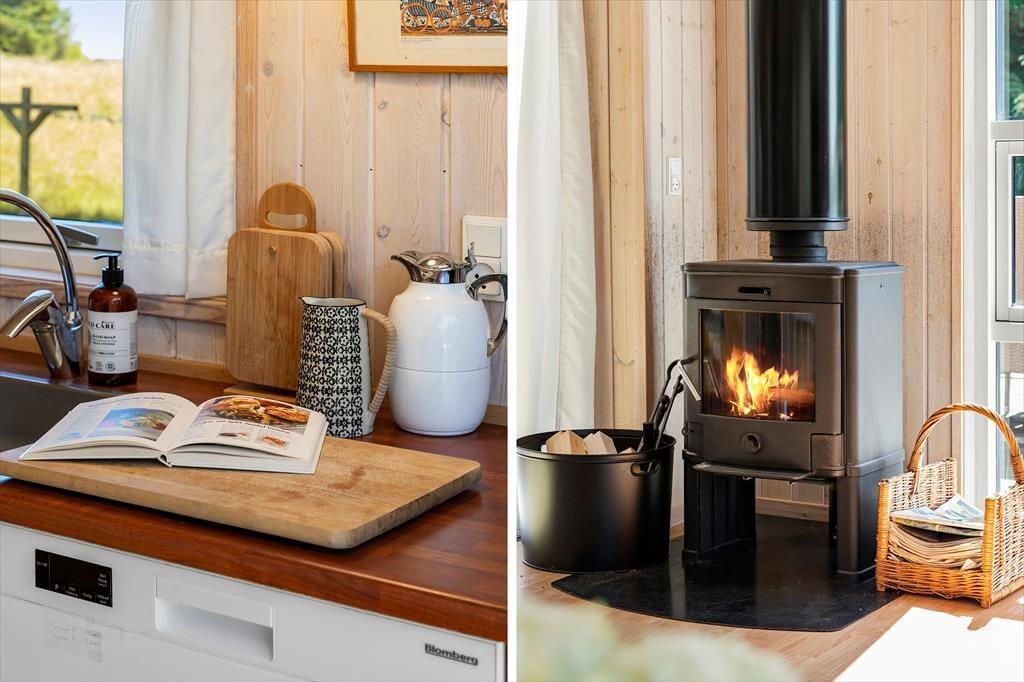 Drinnen erwartet dich eine behagliche Atmosphäre, die sofort Urlaubsstimmung aufkommen lässt. Die Einrichtung ist gemütlich im klassischen dänischen Ferienhausstil mit Holzverkleidung und großen Fenstern, die viel Licht hereinlassen und den Blick ins Grüne freigeben. Im Wohnbereich könnt ihr es euch gemeinsam vor dem Kaminofen gemütlich machen oder nach einem Tag voller Abenteuer entspannt auf dem Sofa relaxen. Die offene Küche ist praktisch mit dem Wohnbereich verbunden – so kannst du jederzeit Kaffee nachschenken oder leckere Snacks zubereiten, während ihr euch am Esstisch unterhaltet. Am Abend laden die Schlafzimmer zu erholsamem Schlaf ein, damit du am nächsten Morgen frisch in einen neuen Urlaubstag starten kannst.