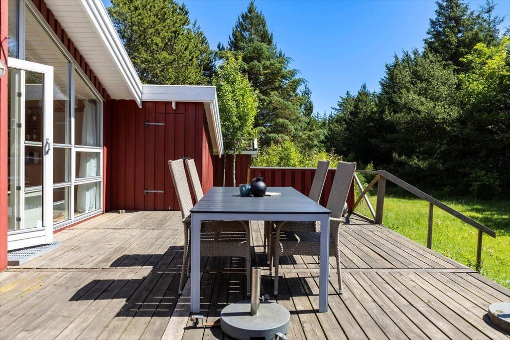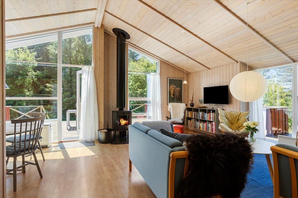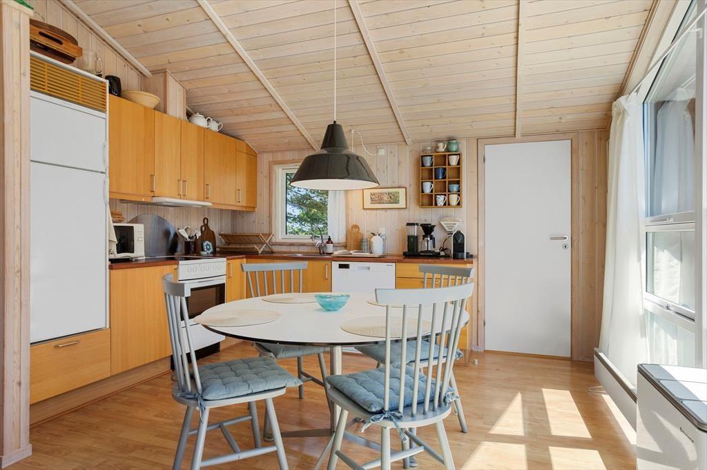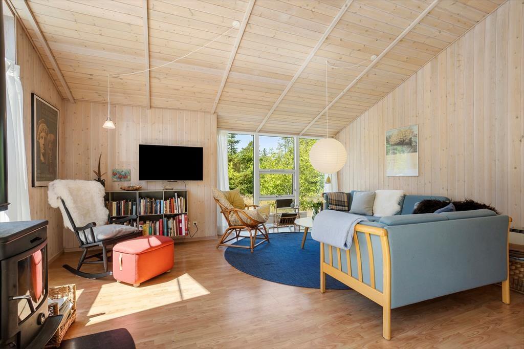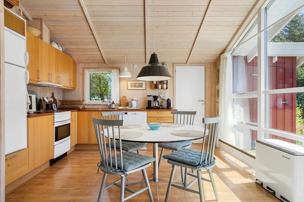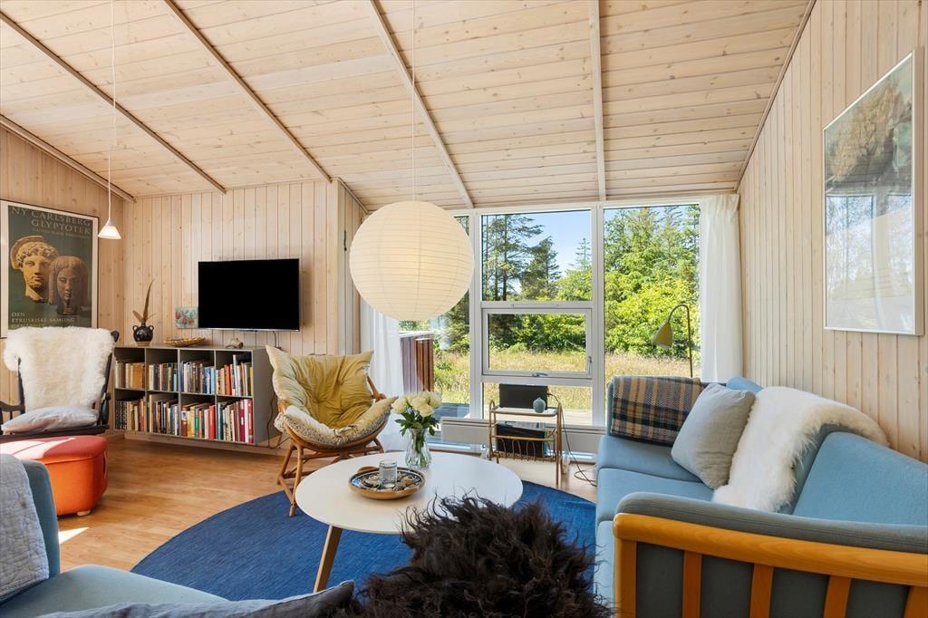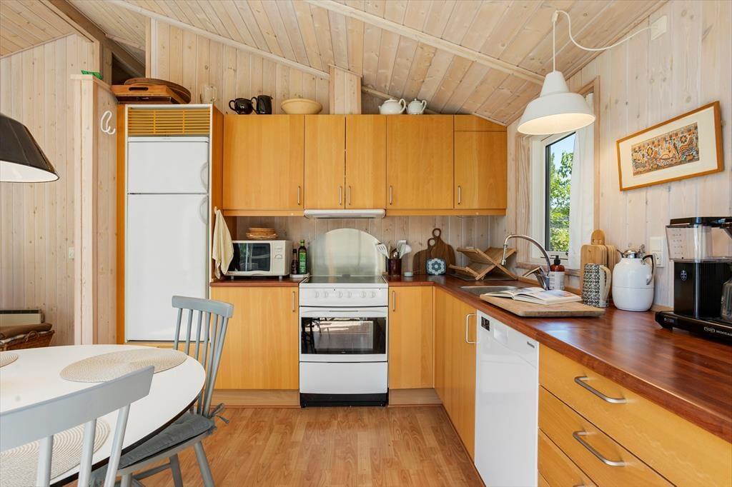 Drinnen erwartet dich eine behagliche Atmosphäre, die sofort Urlaubsstimmung aufkommen lässt. Die Einrichtung ist gemütlich im klassischen dänischen Ferienhausstil mit Holzverkleidung und großen Fenstern, die viel Licht hereinlassen und den Blick ins Grüne freigeben. Im Wohnbereich könnt ihr es euch gemeinsam vor dem Kaminofen gemütlich machen oder nach einem Tag voller Abenteuer entspannt auf dem Sofa relaxen. Die offene Küche ist praktisch mit dem Wohnbereich verbunden – so kannst du jederzeit Kaffee nachschenken oder leckere Snacks zubereiten, während ihr euch am Esstisch unterhaltet. Am Abend laden die Schlafzimmer zu erholsamem Schlaf ein, damit du am nächsten Morgen frisch in einen neuen Urlaubstag starten kannst.