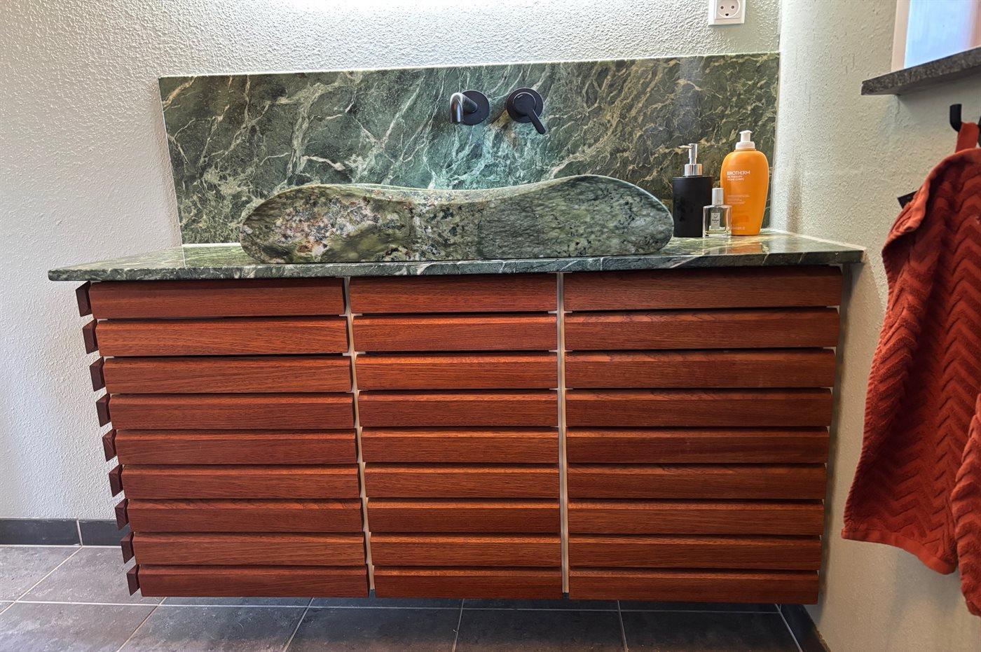 Es gibt 1 Badezimmer mit Duschnische und 2 Toiletten, davon 1 Gästetoilette. Fußbodenheizung in 1 Badezimmer.