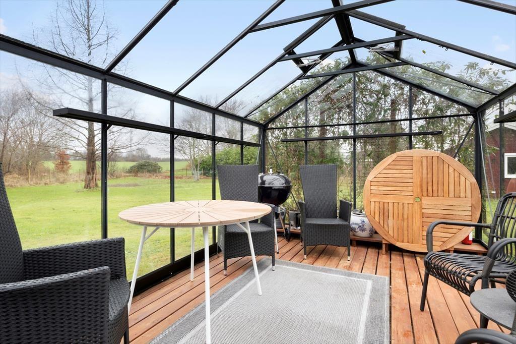 Die großzügigen Außenbereiche bieten viel Platz für Entspannung und Aktivitäten. Die große Holzterrasse lädt zum Sonnenbaden ein, während der teilweise geschlossene Garten ideal für Spiele und gemütliche Stunden im Freien ist. Am Abend kannst du den Grill anzünden und das Essen mit Blick auf die weiten Felder genießen, während die Sonne langsam untergeht. Ein besonderes Highlight ist das charmante Orangerie-Gewächshaus im Garten – ein perfekter Rückzugsort für eine entspannte Kaffeepause oder ein Glas Wein am Abend. Von hier aus kannst du die wunderschöne Aussicht auf die umliegende Landschaft genießen und den Wechsel der Jahreszeiten beobachten.