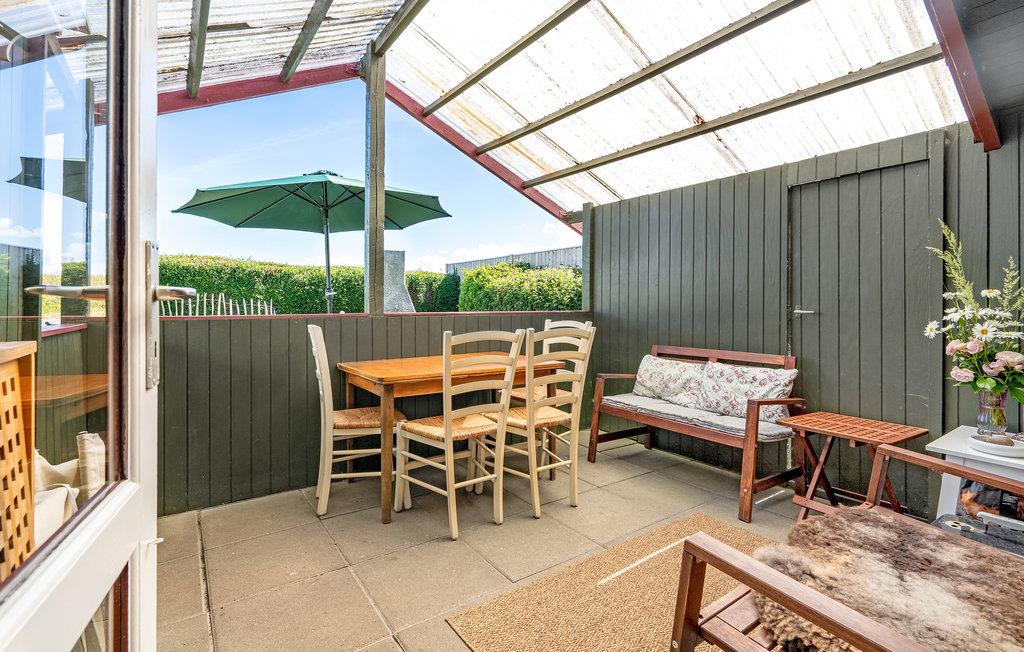 Die überdachte Terrasse mit Außenkamin und Liegestühlen ist ein schöner Ort für Entspannung und Sie sind hier nur einen Katzensprung vom Strand entfernt. Der sichtgeschützte Hintergarten bietet eine sonnige, windgeschützte Stelle, wo Sie die Privatsphäre genießen können.