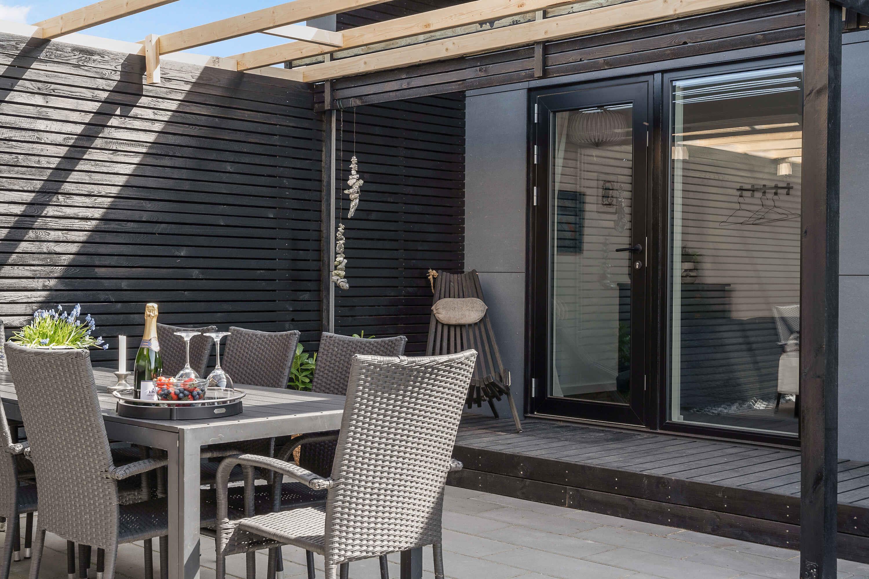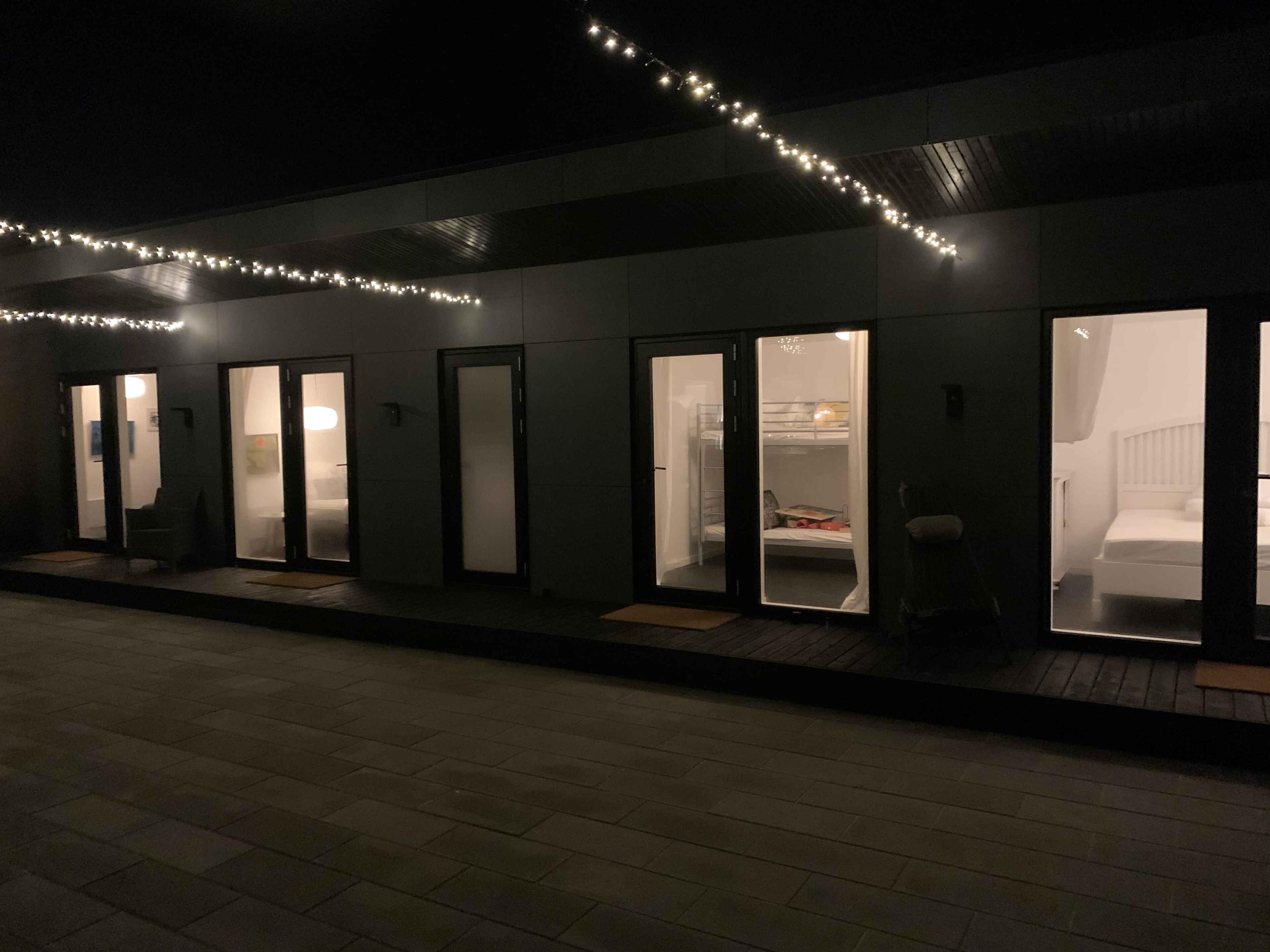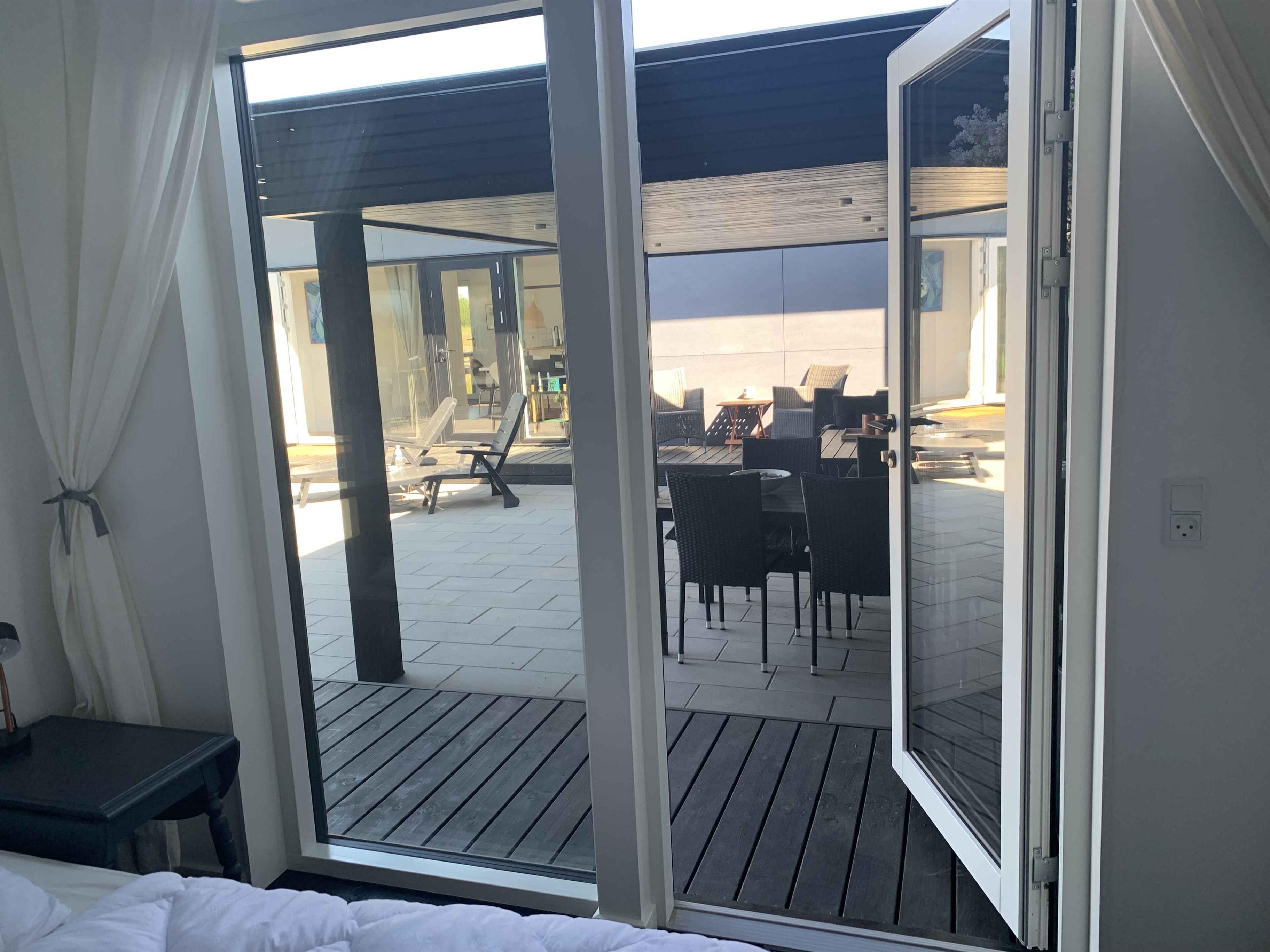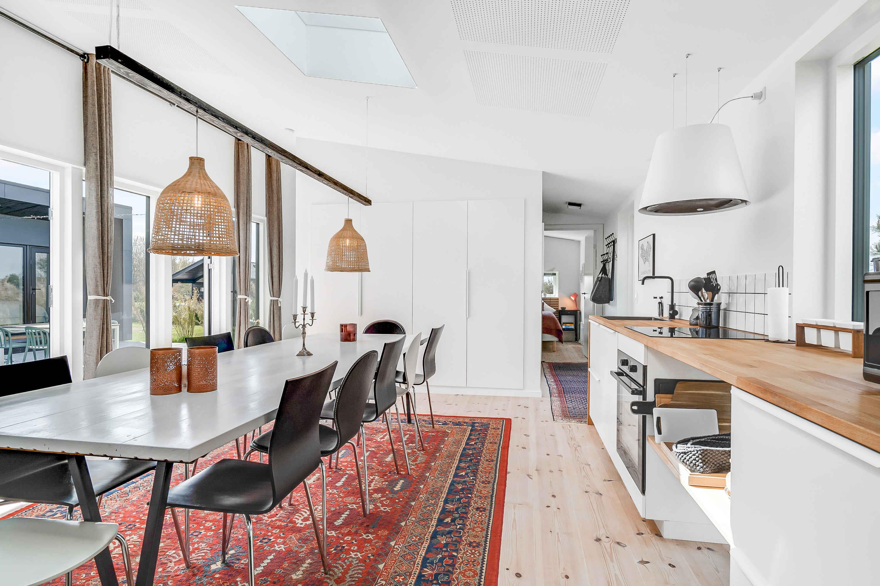 Genießen Sie Ihren Urlaub in diesem Ferienhaus der Sonderklasse, gebaut aus tollen Materialien und in zeitlosem Design. Das Haus wurde 2022 erbaut und ist in 2 separate Gebäude unterteilt, die sich einen Atriumhof teilen, sodass Sie bei Bedarf einen Teil abschließen können. An einem Ende des 100 m² großen Atriumhofs befindet sich ein schöner Bereich mit einer ca. 20 m² großen überdachten Terrasse, wo Sie Schatten und Schutz genießen können. Das Atrium kann vollständig verschlossen werden. Das Ferienhaus verfügt über insgesamt 118m2, die sich auf das 75m2 große Haupthaus und das dazugehörige Gebäude von 43m2 verteilen. Das Haupthaus enthält eine große und schöne Wohnküche mit Küche, Wohnzimmer und Essbereich, wo Platz für die ganze Familie oder Freunde ist. Hier erwartet Sie ein Sofabereich mit einer großen Sofagruppe, Fernseher und Holzofen, wo die Gemütlichkeit in den Abendstunden stattfinden kann. Außerdem gibt es einen schönen Esstisch für die festlichen Mahlzeiten sowie eine helle und funktionale Küche. In diesem Raum gibt es Dachfenster, die bei der guten Deckenhöhe für fantastisches Tageslicht sorgen. Außerdem befindet sich eines der beiden Badezimmer ebenfalls im Haupthaus. Dieses Badezimmer verfügt über eine separate Dusche mit schönen Fliesen, Fußbodenheizung und ein Dachfenster mit automatischer Öffnungs-/Schließfunktion. Im Haupthaus befinden sich 2 Schlafzimmer mit 4 Schlafplätzen. Das zweite Gebäude verfügt über 4 Schlafzimmer, jedes mit eigenem Eingang. Sie alle enthalten 2 Schlafplätze und die Möglichkeit der Lagerung. In diesem Teil gibt es auch ein Badezimmer mit den gleichen Funktionen wie im Haupthaus. Insgesamt gibt es 6 Schlafzimmer mit 4 Doppelbetten und 4 Einzelbetten. Insgesamt 12 Personen. Vom Haus aus ist es nur ein kurzer Spaziergang zum Wasser, das 900 m vom Haus entfernt liegt, während es nur 700 m zum Einkaufen sind. Es besteht Zugang zu einem schönen Pétanque-Platz. Seit mehr als 100 Jahren ist Marielyst die beliebteste Küstenstadt an der dänischen Ostküste und hat eine südliche Atmosphäre mit Sitzgelegenheiten im Freien in Cafés und Restaurants. Im Sommer ist der Platz voller lokaler Kunsthandwerker mit Gemälden und Keramik, die eine bezaubernde Sommeratmosphäre schaffen. Marielyst bietet eine große Auswahl an Geschäften mit Kleidung, Wein und Sonderwaren sowie viele Aktivitäten wie Golf, Bowling, Minigolf, Segway, Go-Kart und Paintball. Das Ferienhaus ist auch nicht weit von Nykøbing Falster entfernt, einer stimmungsvollen Stadt mit einer wunderschönen Lage am Guldborgsund. Die Stadt hat eine schöne Fußgängerzone mit vielen Geschäften und Cafés. Hier finden Sie auch das Middelaldercenter, den Guldborgsund Zoo und mehrere Museen. Wichtige Informationen: Das Ferienhaus wird nicht für größere Feiern vermietet und es ist nicht gestattet, hier eine Party zu veranstalten (kann beim Eigentümer erfragt werden). Haustiere dürfen nicht in den Möbeln oder Betten sein und der Hundekot MUSS entfernt werden. Achtung: Wird nicht für gewerbliche Nutzung vermietet.