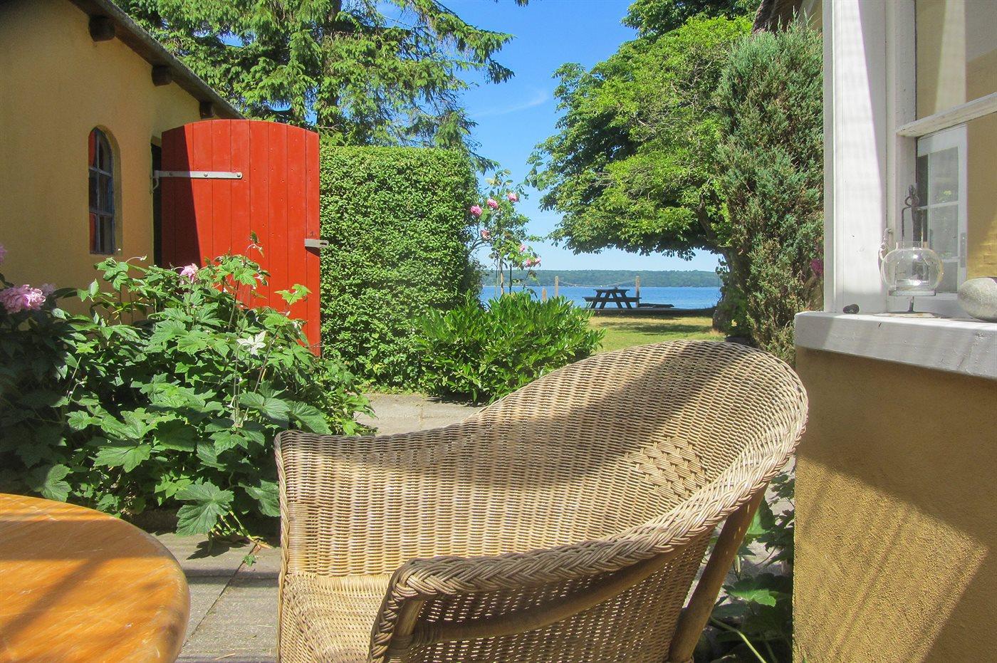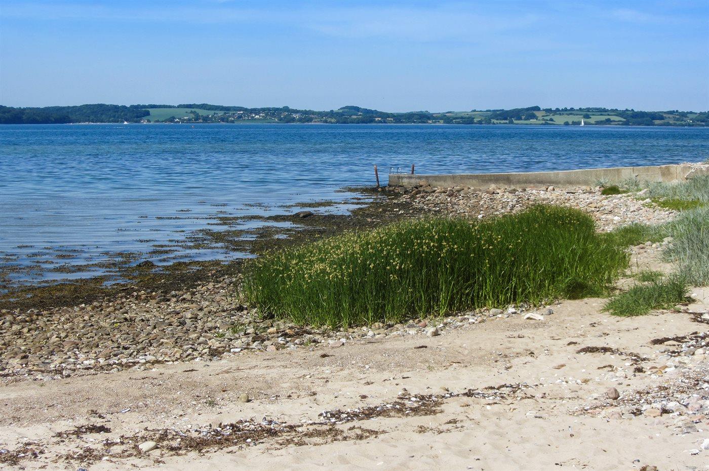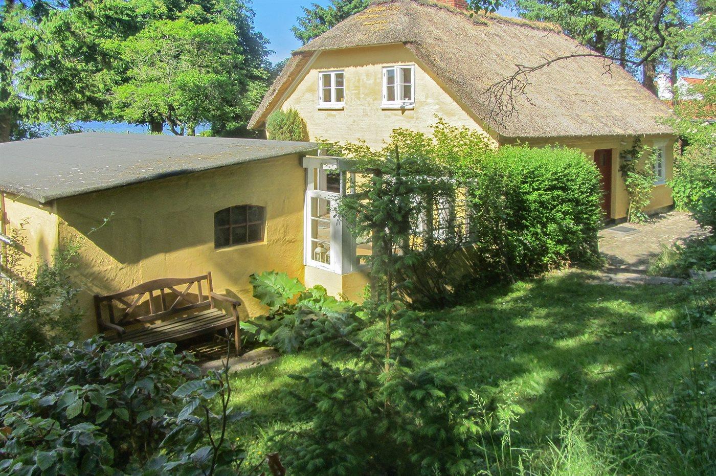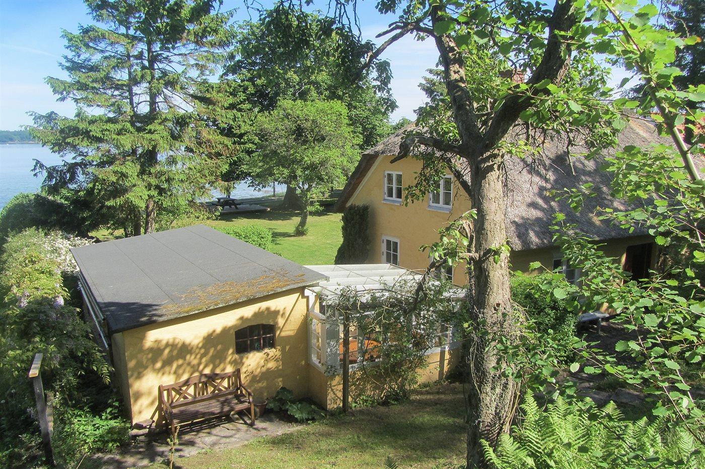 Charmantes, älteres Ferienhaus mit Reetdach in der ersten Reihe zum Wasser gelegen mit schönem Blick auf die Förde vom sowohl Haus als auch vom Grundstück. Das Haus liegt zurückgezogen auf einem großen teilweise geschlossenen Grundstück in einer Sackgasse, die durch den Grundstück läuft.