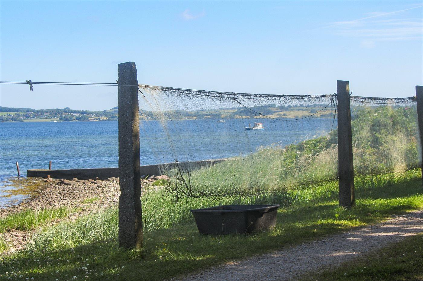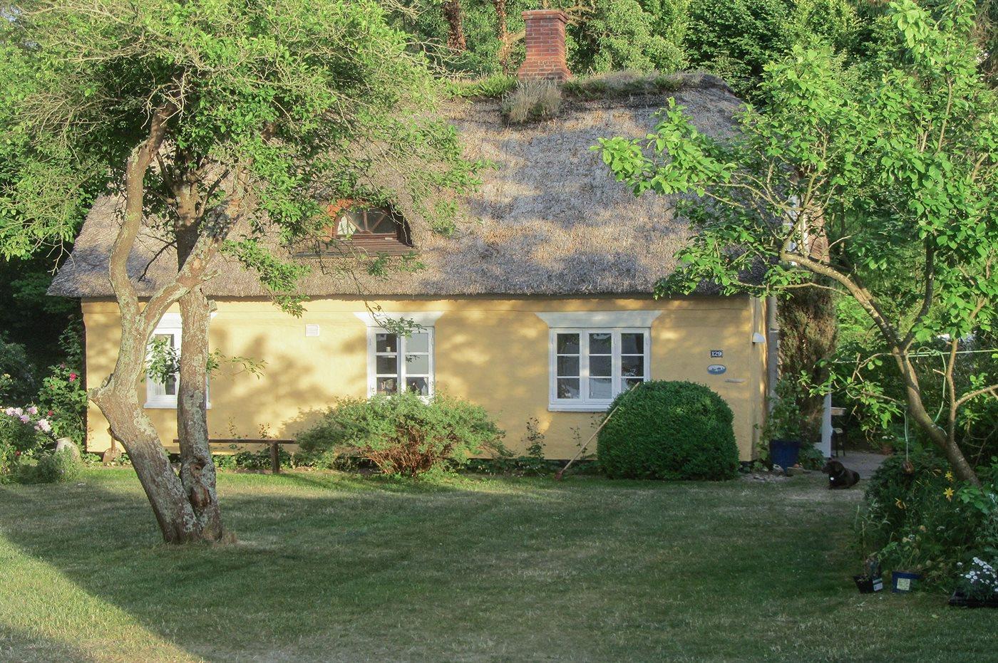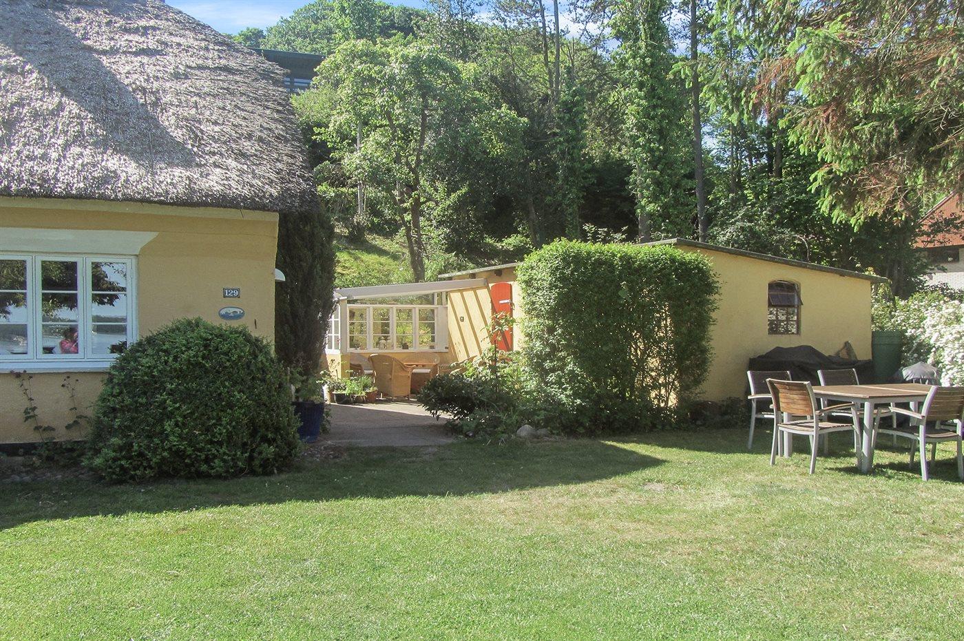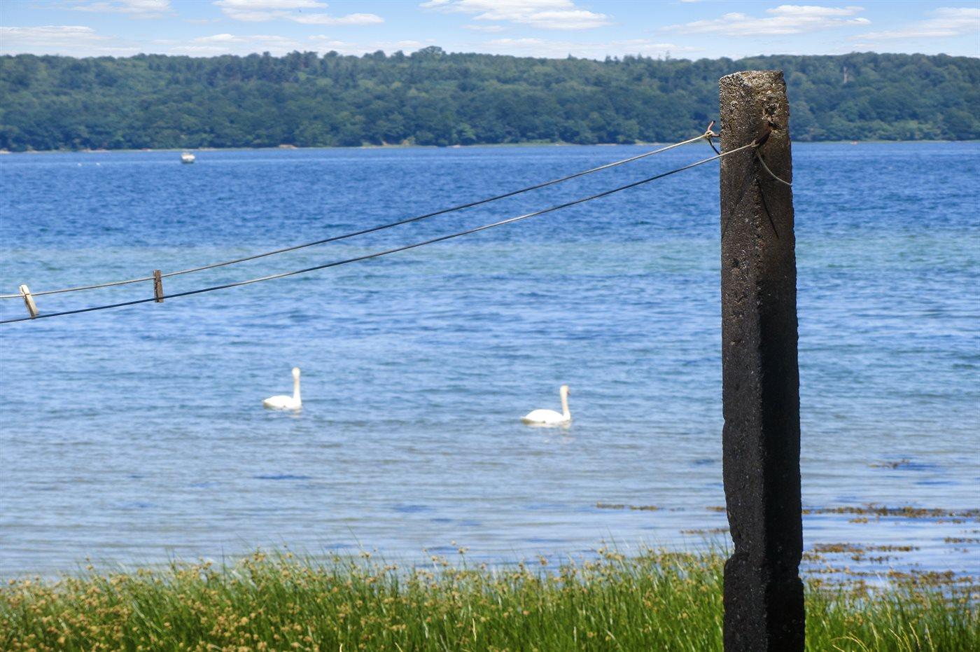 Charmantes, älteres Ferienhaus mit Reetdach in der ersten Reihe zum Wasser gelegen mit schönem Blick auf die Förde vom sowohl Haus als auch vom Grundstück. Das Haus liegt zurückgezogen auf einem großen teilweise geschlossenen Grundstück in einer Sackgasse, die durch den Grundstück läuft.
