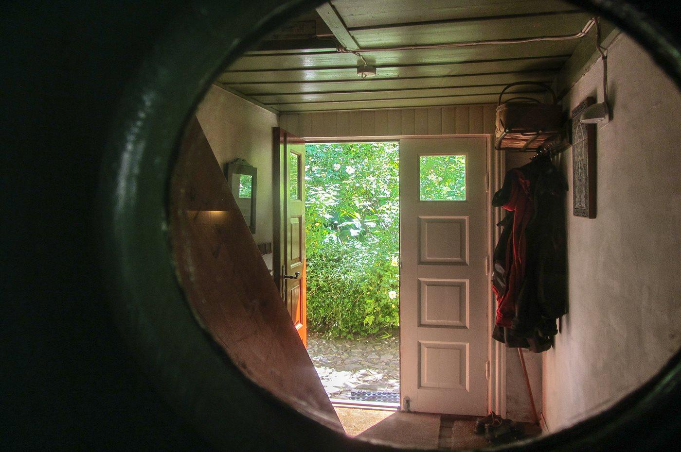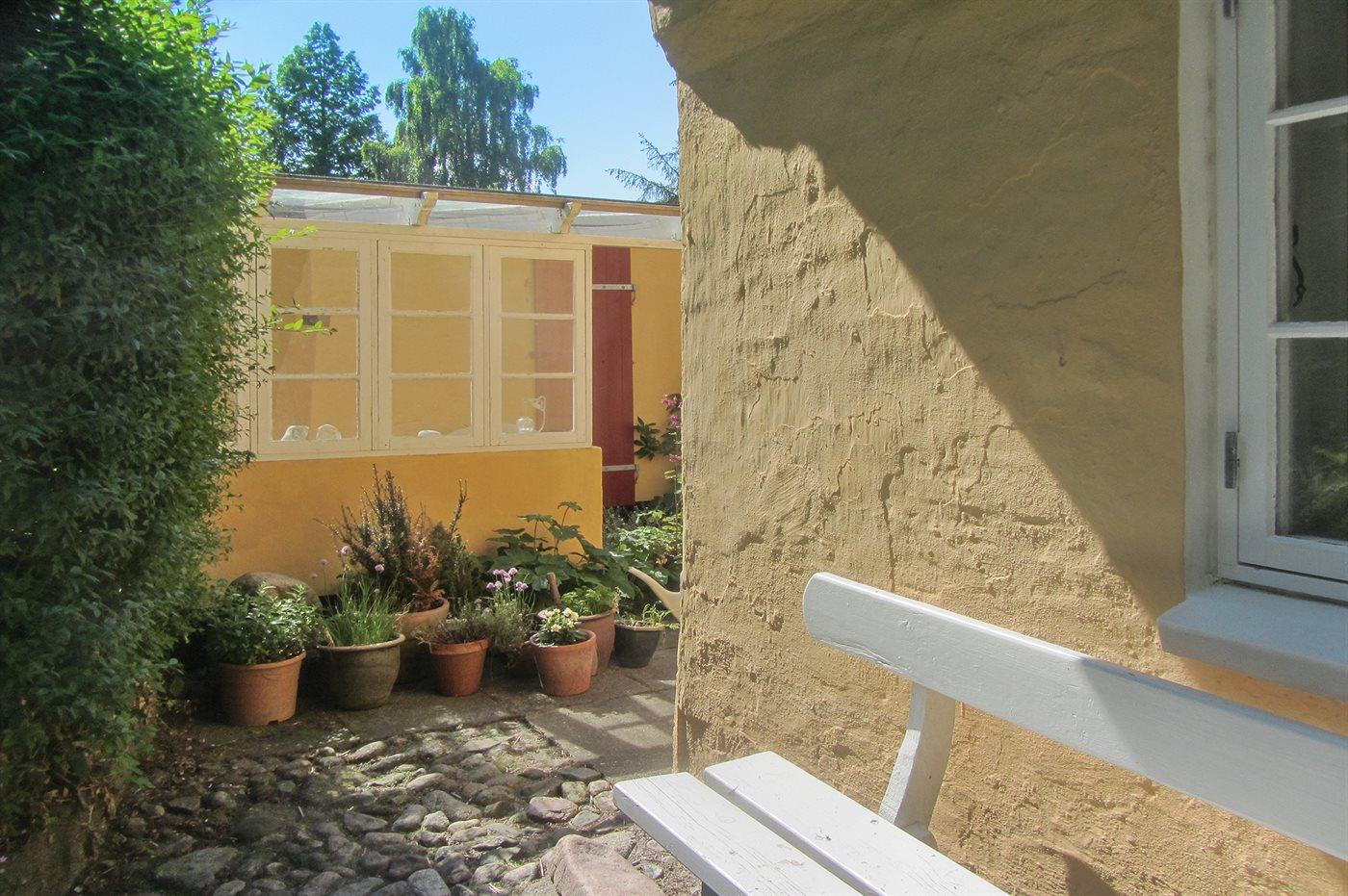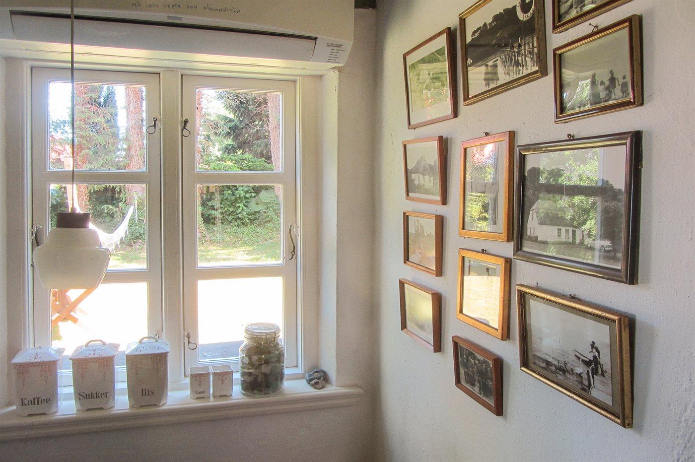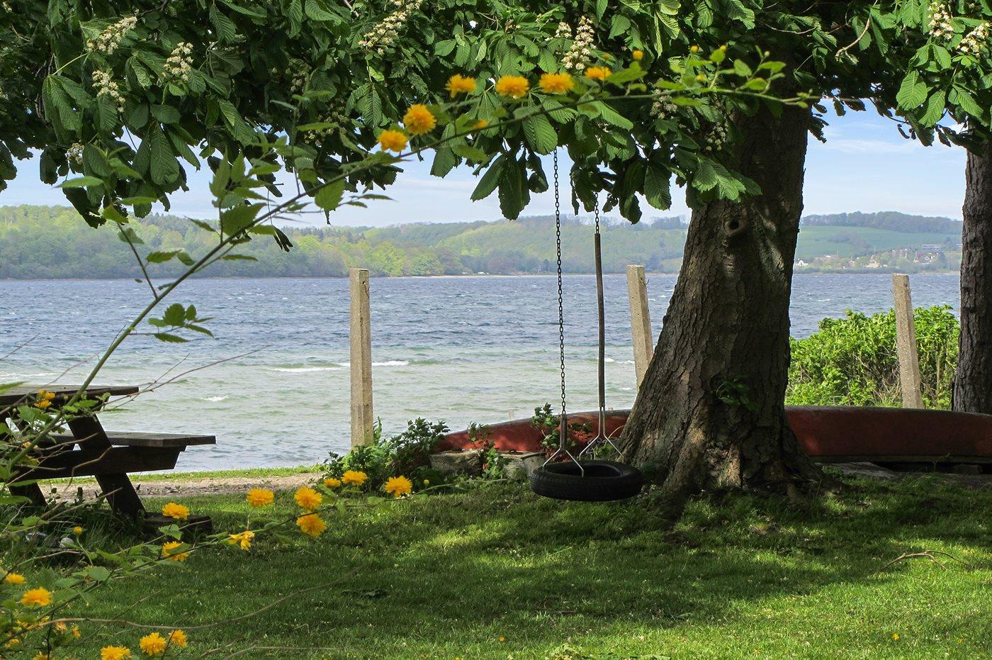 Charmantes, älteres Ferienhaus mit Reetdach in der ersten Reihe zum Wasser gelegen mit schönem Blick auf die Förde vom sowohl Haus als auch vom Grundstück. Das Haus liegt zurückgezogen auf einem großen teilweise geschlossenen Grundstück in einer Sackgasse, die durch den Grundstück läuft.