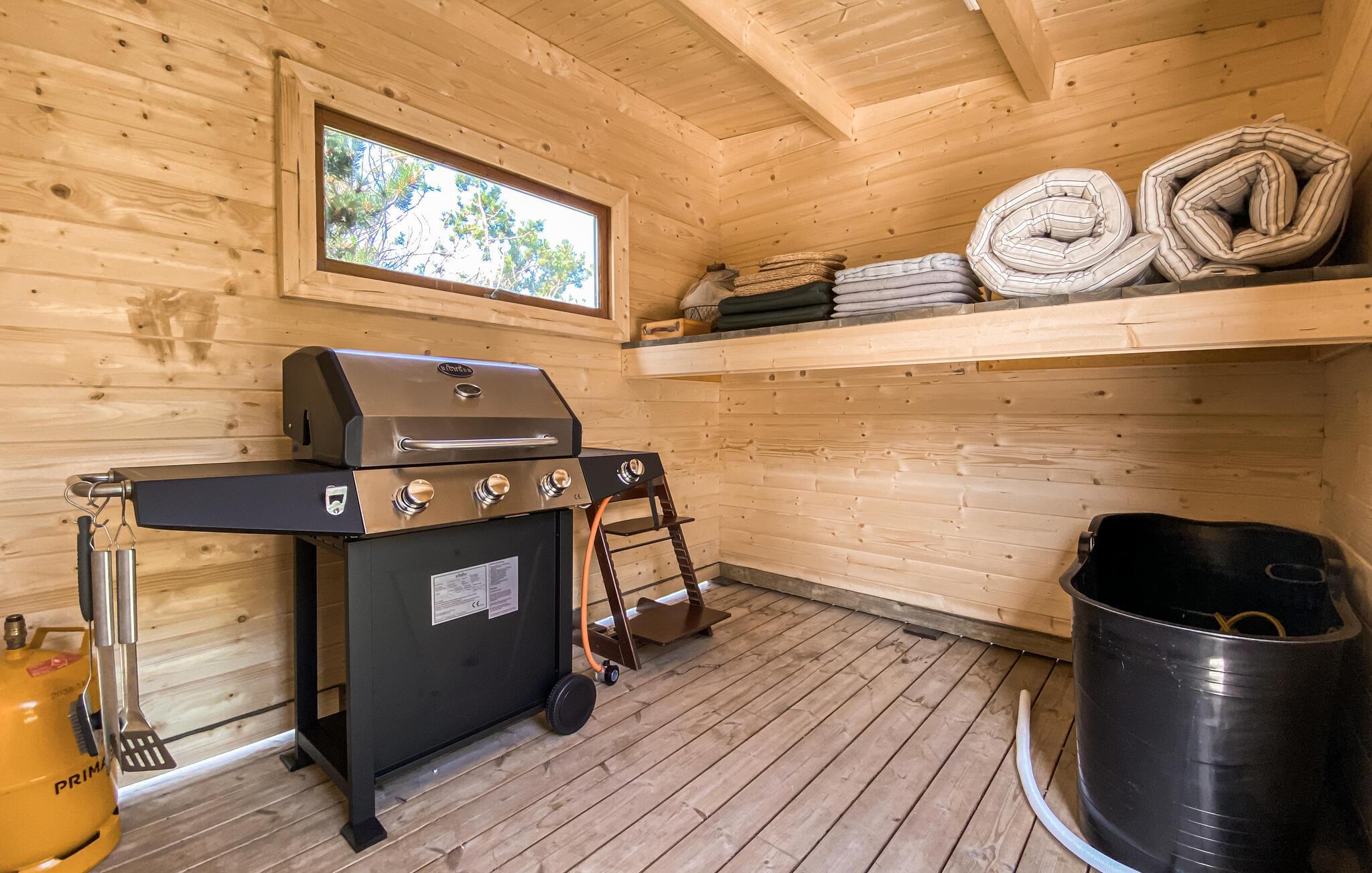 Freuen Sie sich auf einen ständigen Panoramablick über die Bucht von diesem einladenden Haus. Es empfängt Sie in umfassender, klassischer Ausstattung in schönen Farbkombinationen, und bietet Ihnen ein angenehmes Wohnerlebnis. Über die Baumwipfel hinweg blicken Sie hin zum Wasser, eine Szenerie zum Verlieben. Auf der erhöhten Terrasse sitzend lässt sich dieser Anblick am besten genießen, mit einem Glas Ihres Lieblingsgetränkes in der Hand. Genießen Sie auch Wellnessstunden in der Außensauna auf der Terrasse und genießen dabei das Fenster mit Aussicht. Die Außendusche am Nebengebäude bietet Ihnen anschließend die erwünschte Abkühlung. Lassen Sie die Abende mit gegrillten Speisen ausklingen und machen Pläne für Ihre nächsten Aktivitäten.