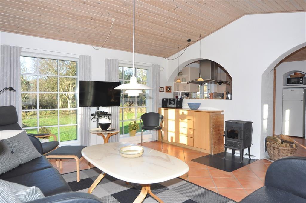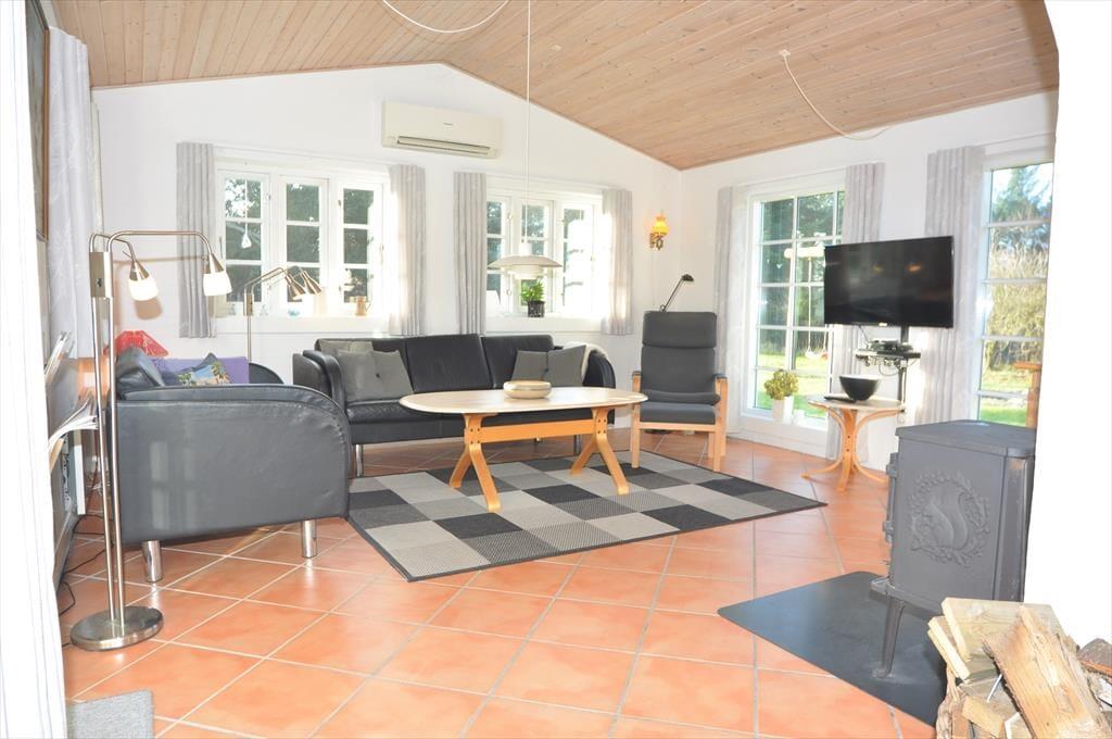 Dieses gemütliche Ferienhaus begrüßt Sie mit einer hellen und freundlichen Einrichtung, die durch unverputzte Wände und holzvertäfelte Decken unterstrichen wird. Küche, Essbereich und Wohnraum bilden eine offene Einheit, in der Sie auf gute, ansprechende Möbel treffen. Die gute Küche umfasst unter anderem ein Induktionskochfeld, einen Geschirrspüler und ein Gefrierfach. Das schöne Badezimmer verwöhnt mit einem Whirlpool und einer Sauna. Eine Waschmaschine samt Wäschetrockner stehen Ihnen im Badezimmer ebenfalls zur Verfügung. Sämtliche Aufenthaltsbereiche und das Badezimmer sind gefliest. Die Schlafräume sind mit Holzböden versehen. Vom Wohnraum aus gelangen Sie auf eine nach Süden ausgerichtete Terrasse mit einer Windschutzmauer. Im Wohnraum ist eine stromsparende Wärmepumpe installiert, die im gesamten Haus für angenehme Temperaturen sorgt. Dar Wasserverbrauch ist nicht im Mietpreis inbegriffen. Kostenlos nutzbares Internet ist vorhanden.