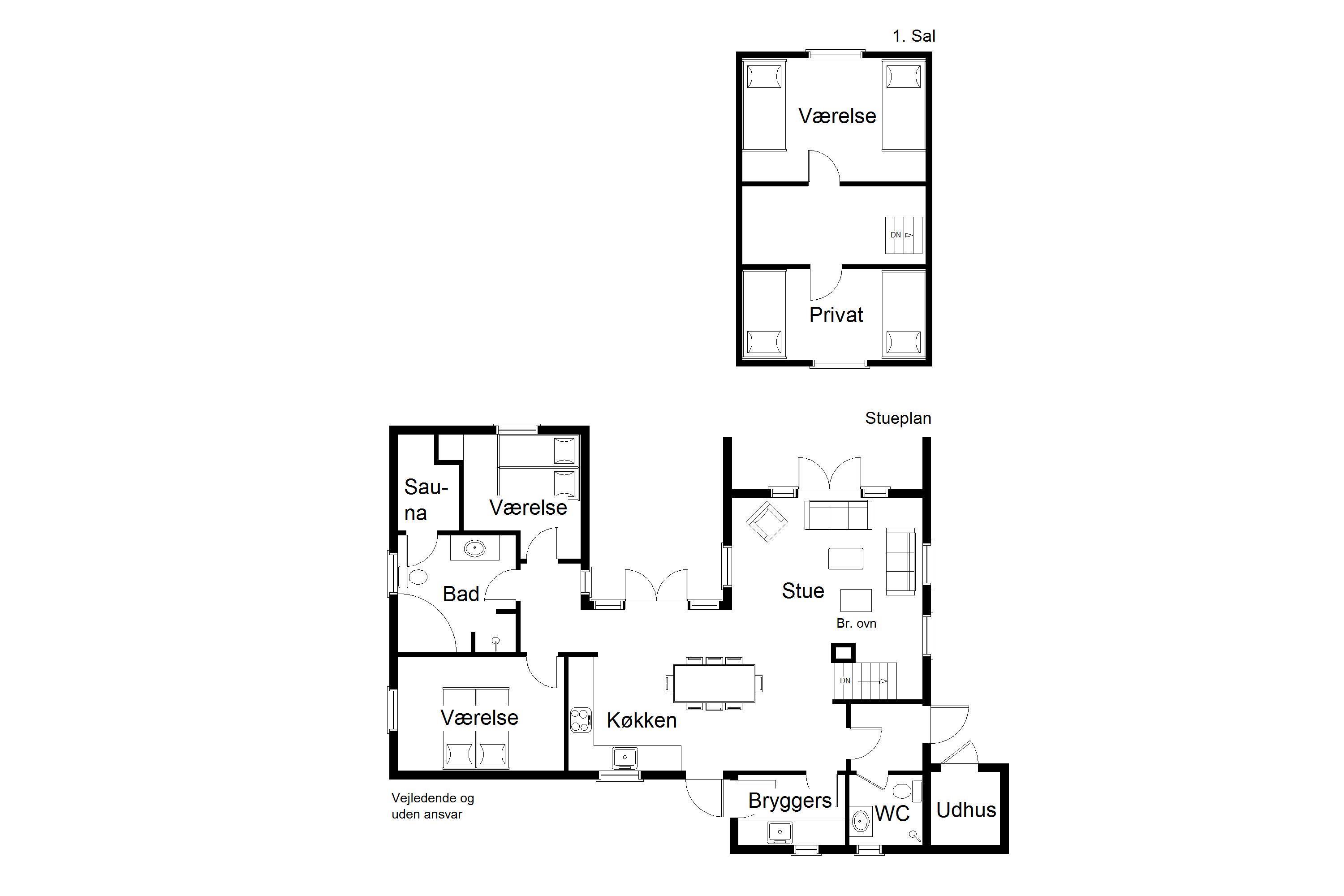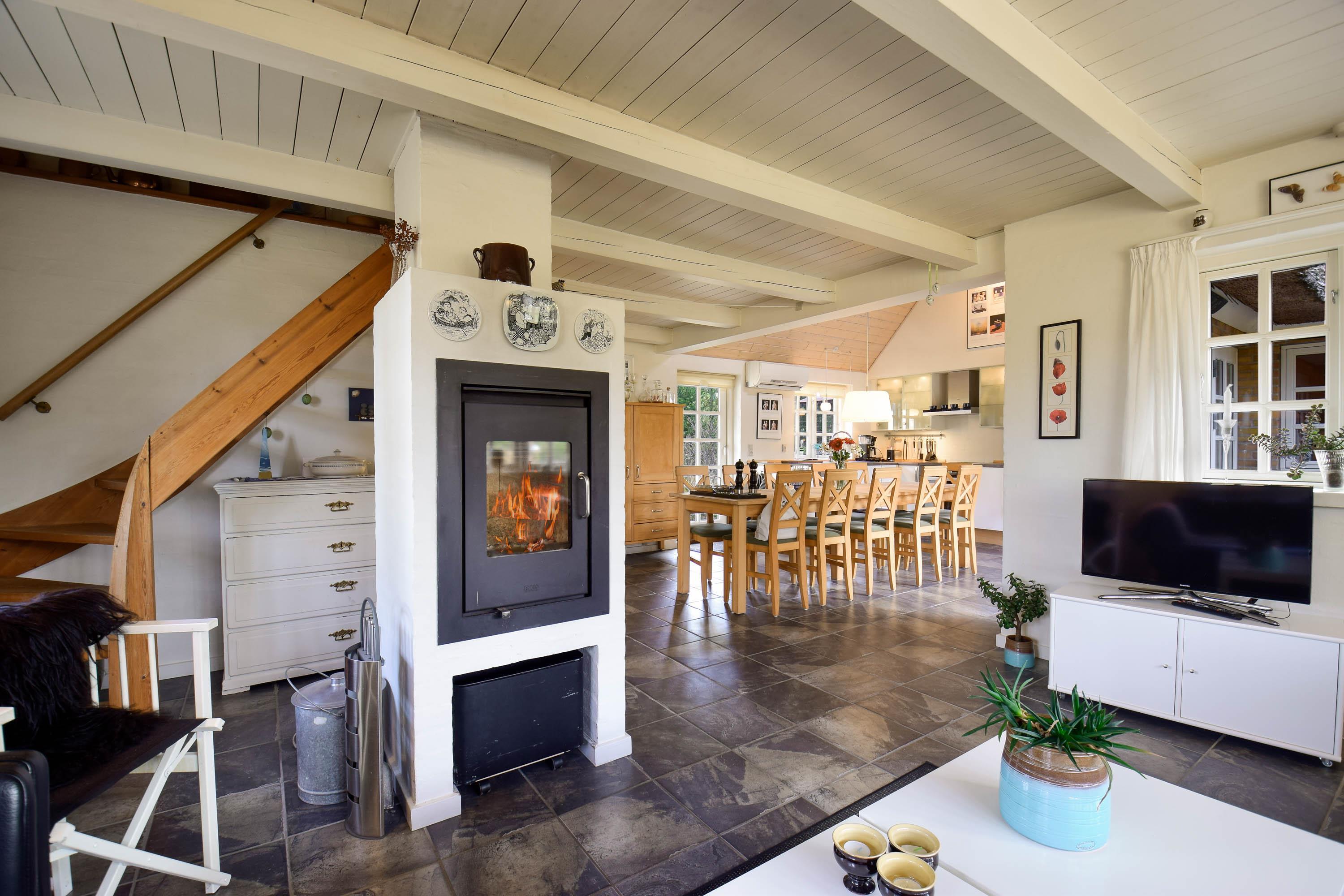 Aufteilung: Eingangsflur mit Waschmaschine und Trockner. Schöner, heller Wohnraum mit integrierter, moderner Küche, Essplatz und Kaminofen. Insgesamt 3 Schlafzimmer, zwei mit Doppelbett im Parterre und eines mit 2 Einzelbetten im ersten Stock. 2 Bäder, das große mit Whirlpool und Sauna.