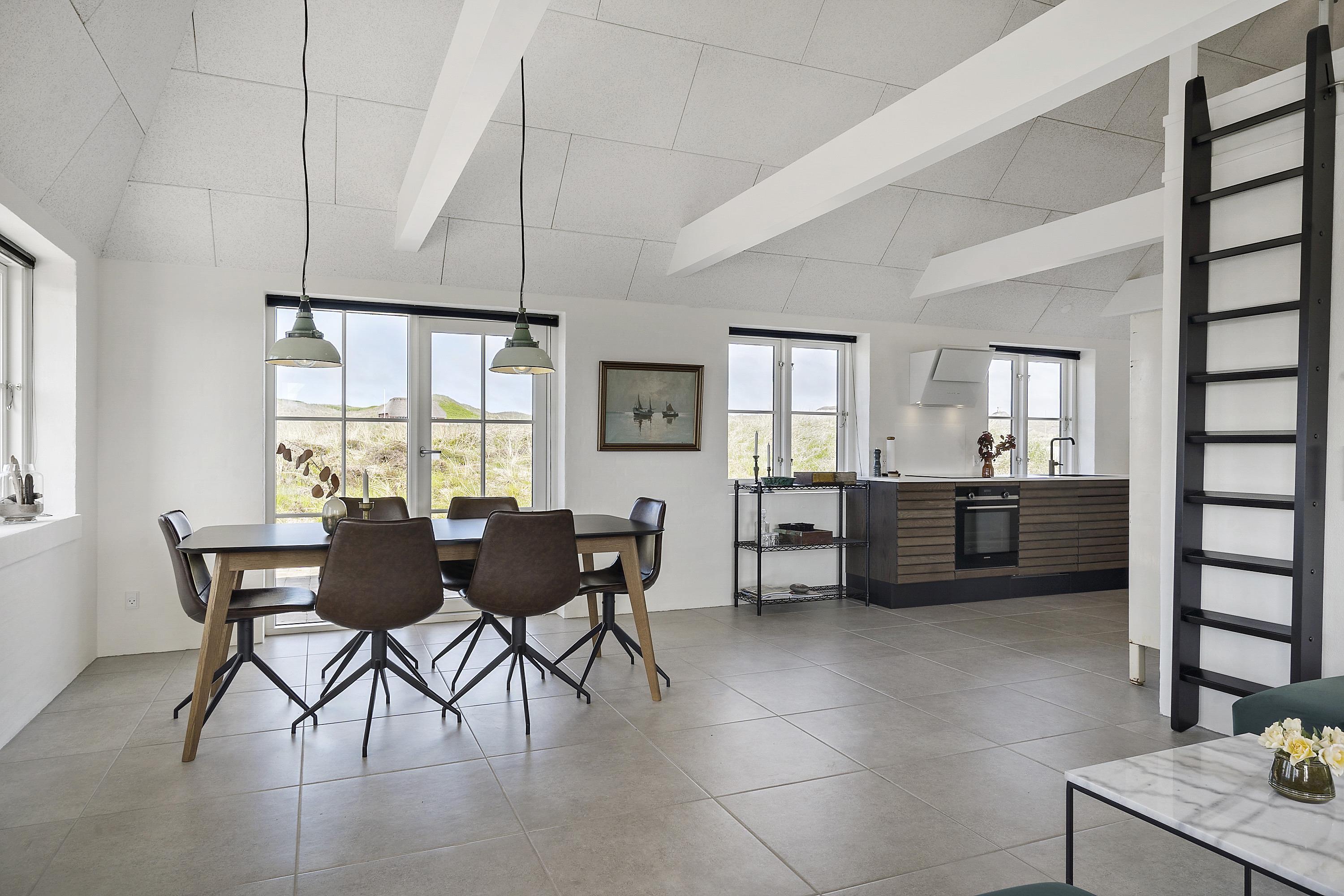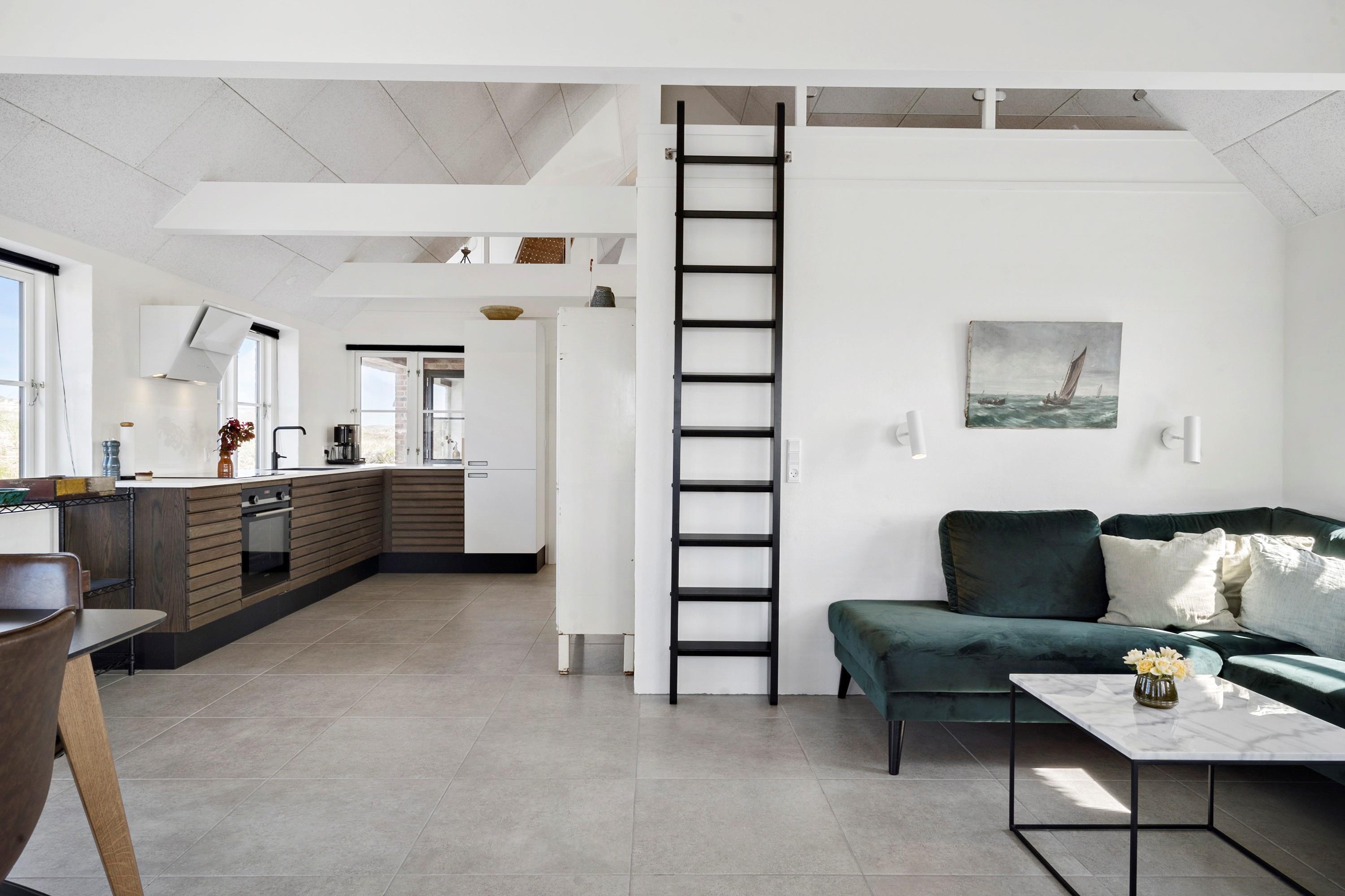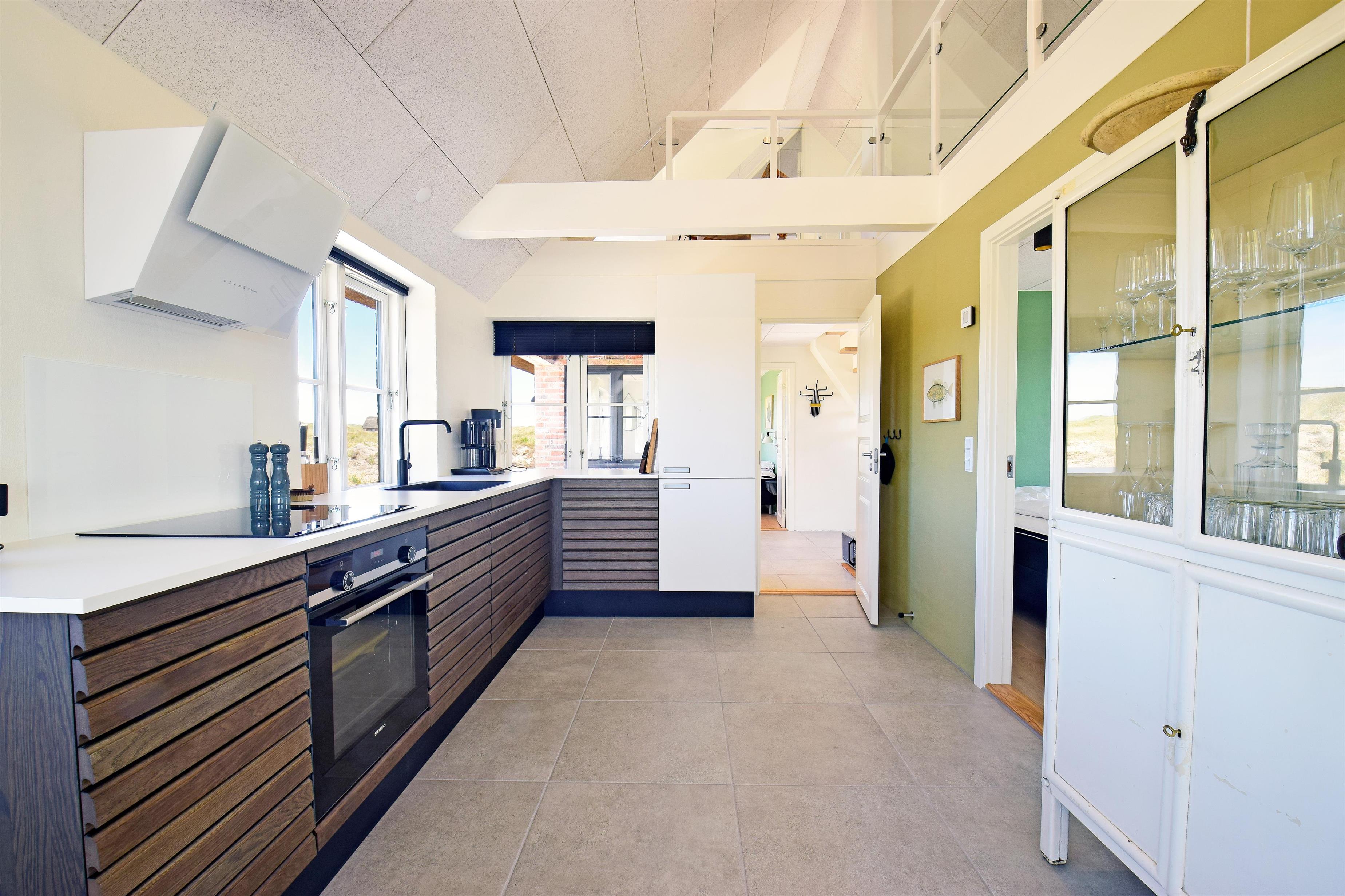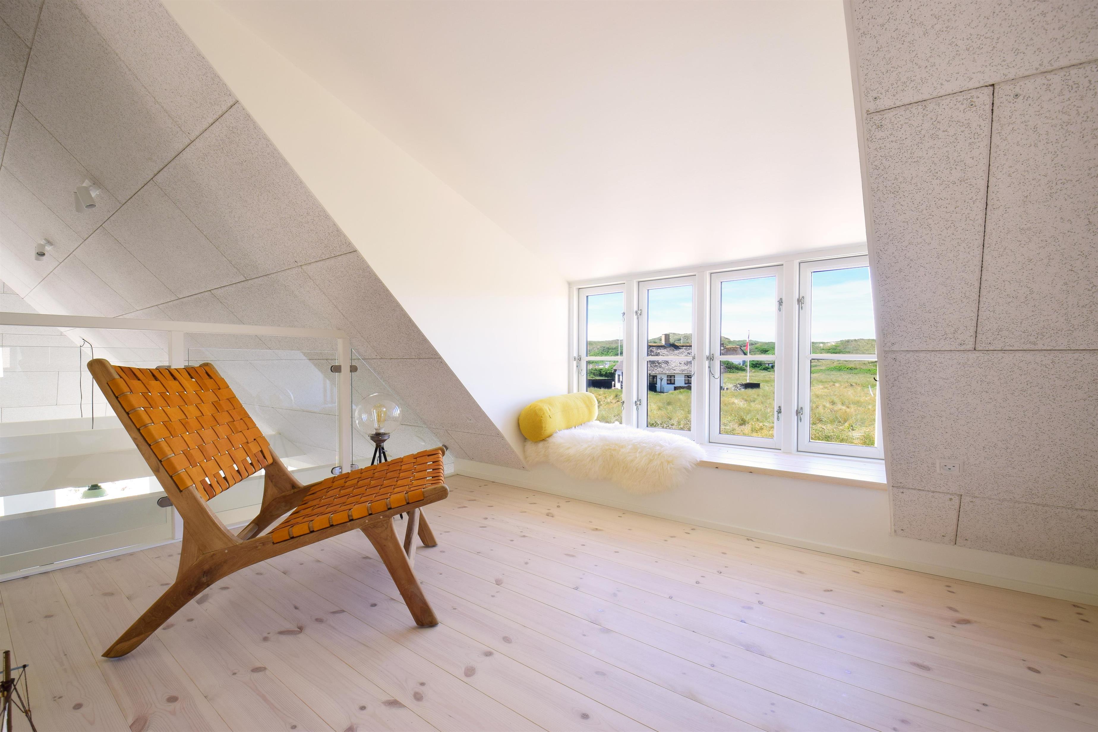Aufteilung: Großer heller Eingangsflur mit Treppe zum 1. Stock, Waschmaschine und Trockner. Heller Wohnraum mit tollem Ausblick und vielen Fenstern in alle Richtungen, offen bis zum Dachfirst mit sichtbaren Balken. Hochwertige Küche in offener Verbindung zum Wohn-/Essbereich. Toll für Kinder: Vom Wohnzimmer aus geht eine Leiter auf eine kleine Halbetage, auf Dänisch Hems genannt. Hier können sie super spielen und ihr eigenes kleines Reich einrichten. Insgesamt 3 Schlafzimmer: Zwei im Erdgeschoss 1 x mit 180 cm mit Doppelbett, 1 x mit 160 cm Doppelbett - das kleinere Zimmer hat direkten Zugang zum Duschbad - und eines im 1. Stock mit 2 Einzelbetten, die zusammengestellt werden können. Ihr habt zwei schöne, moderne Bäder zur Verfügung, eines davon als Wellnessbad mit Doppelduschkabine, Badewanne und Sauna. Wenn ihr vom Strand kommt, ist die Außendusche mit warmem Wasser sehr angenehm.