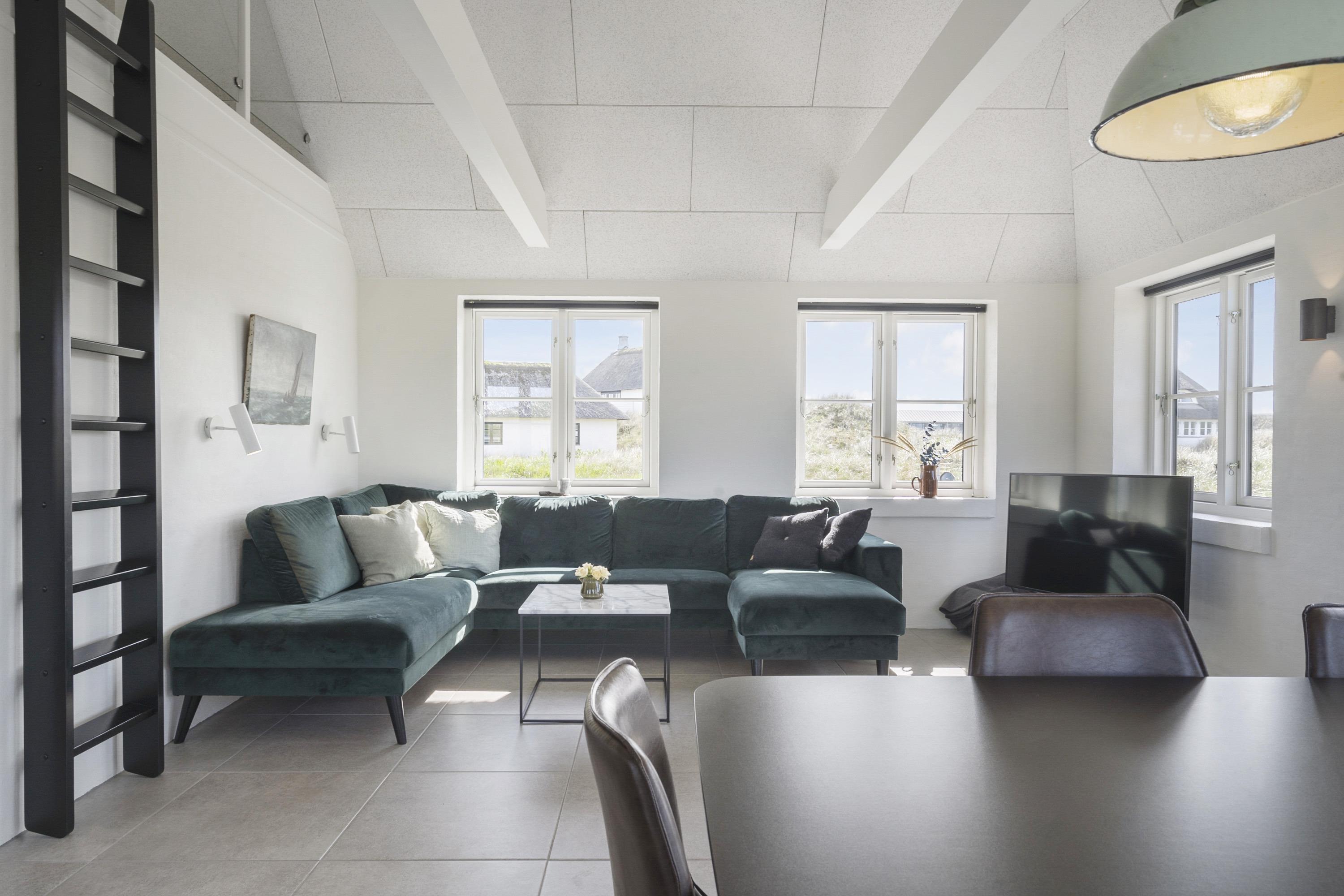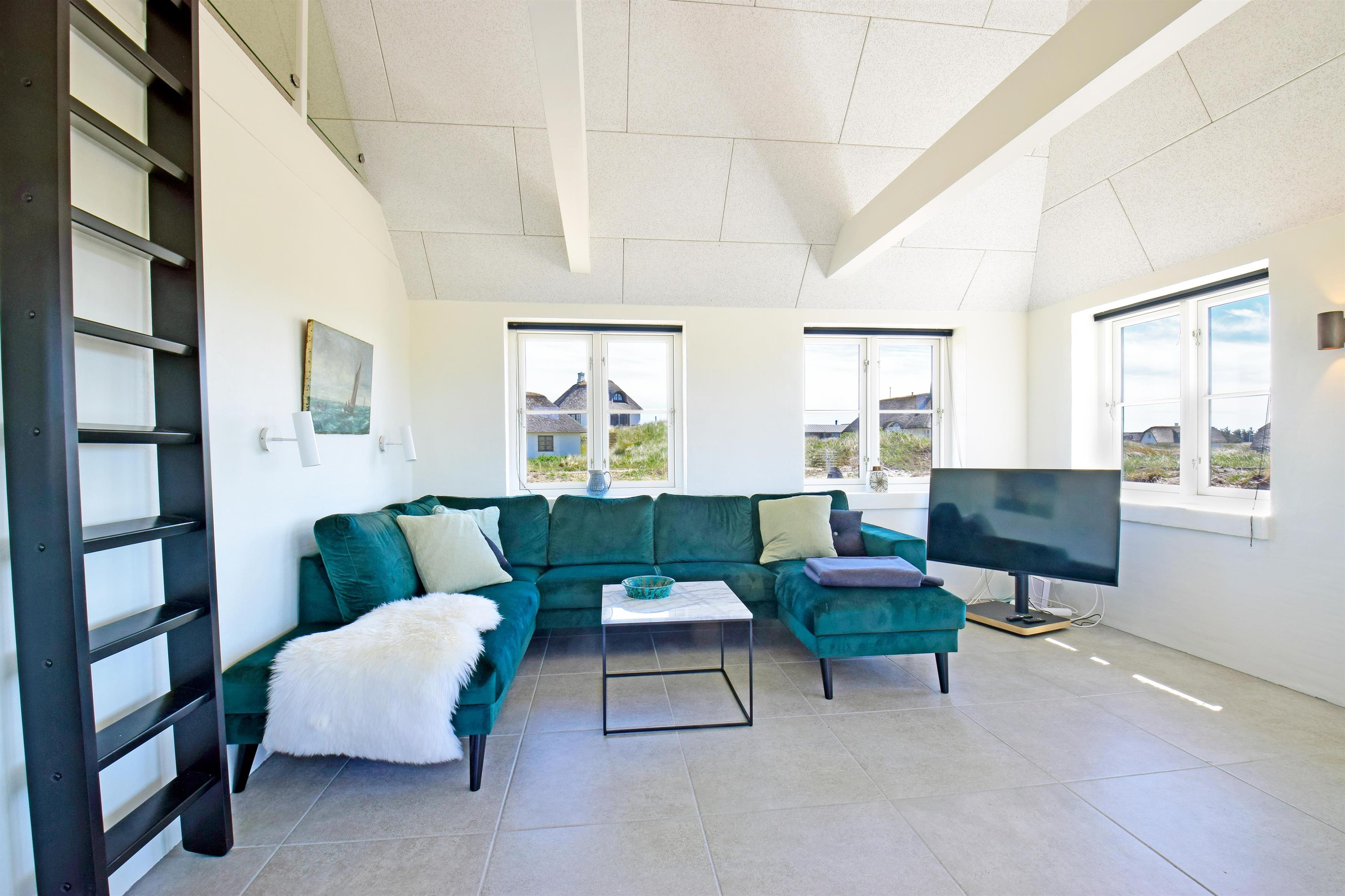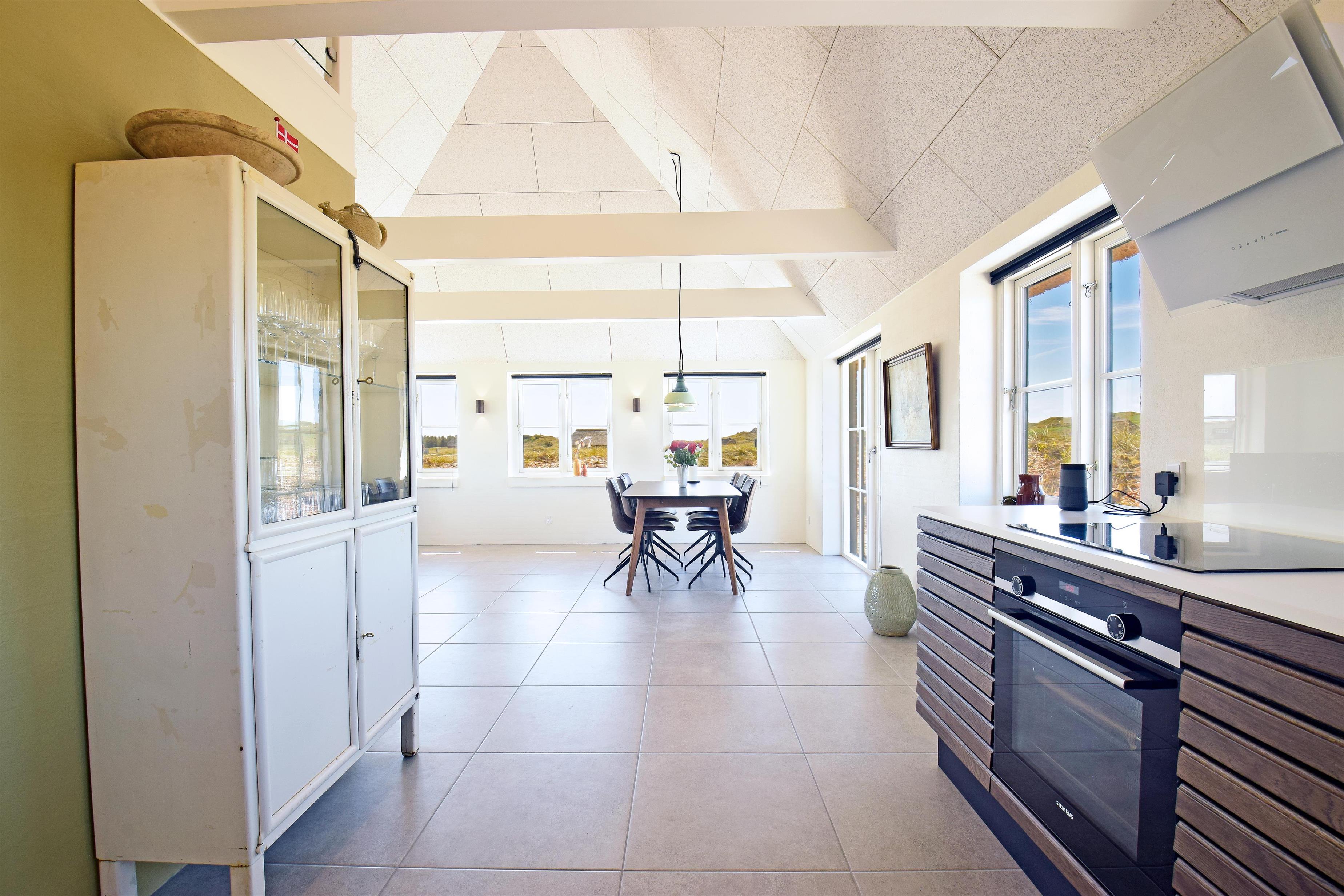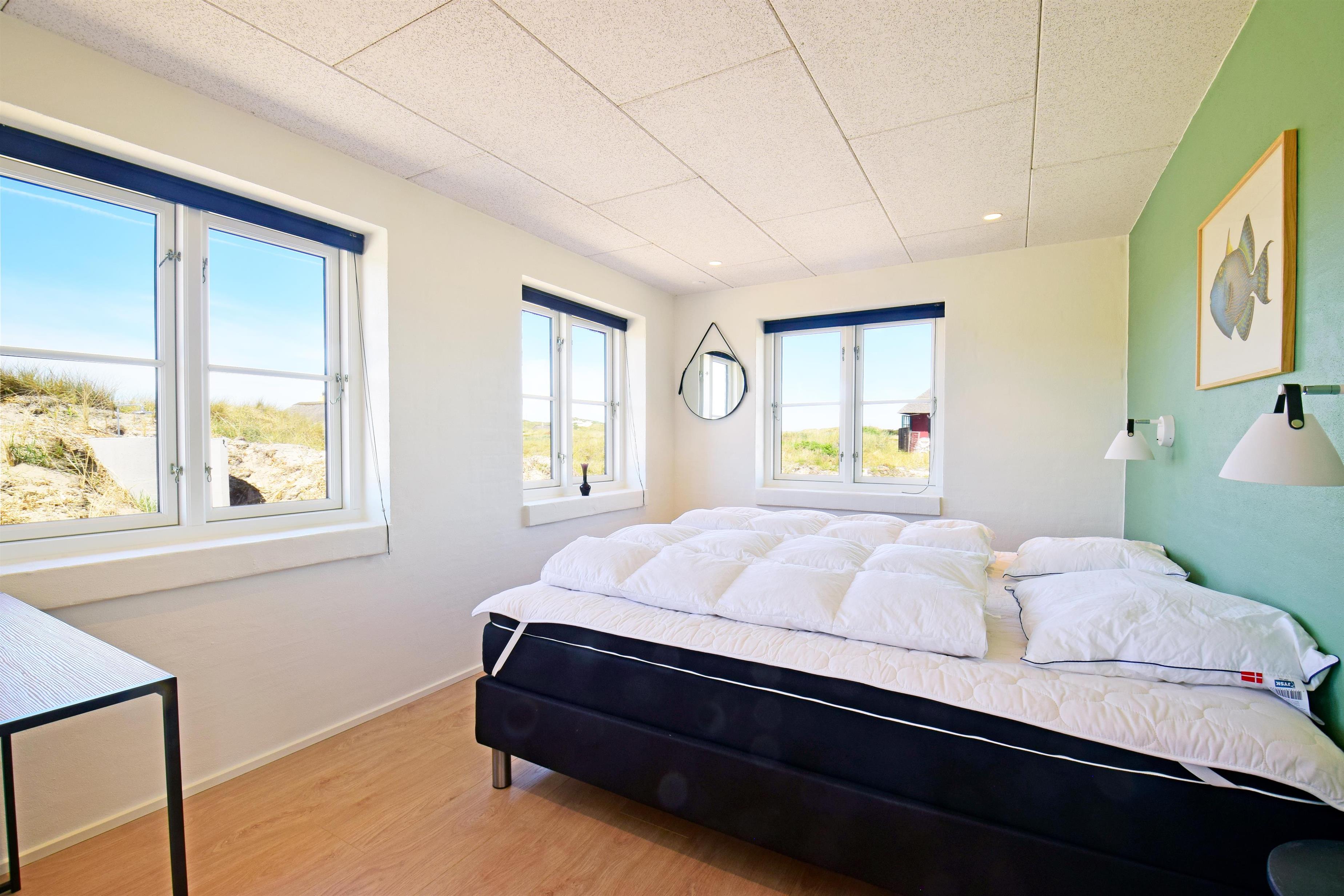 Aufteilung: Großer heller Eingangsflur mit Treppe zum 1. Stock, Waschmaschine und Trockner. Heller Wohnraum mit tollem Ausblick und vielen Fenstern in alle Richtungen, offen bis zum Dachfirst mit sichtbaren Balken. Hochwertige Küche in offener Verbindung zum Wohn-/Essbereich. Toll für Kinder: Vom Wohnzimmer aus geht eine Leiter auf eine kleine Halbetage, auf Dänisch Hems genannt. Hier können sie super spielen und ihr eigenes kleines Reich einrichten. Insgesamt 3 Schlafzimmer: Zwei im Erdgeschoss 1 x mit 180 cm mit Doppelbett, 1 x mit 160 cm Doppelbett - das kleinere Zimmer hat direkten Zugang zum Duschbad - und eines im 1. Stock mit 2 Einzelbetten, die zusammengestellt werden können. Ihr habt zwei schöne, moderne Bäder zur Verfügung, eines davon als Wellnessbad mit Doppelduschkabine, Badewanne und Sauna. Wenn ihr vom Strand kommt, ist die Außendusche mit warmem Wasser sehr angenehm.
