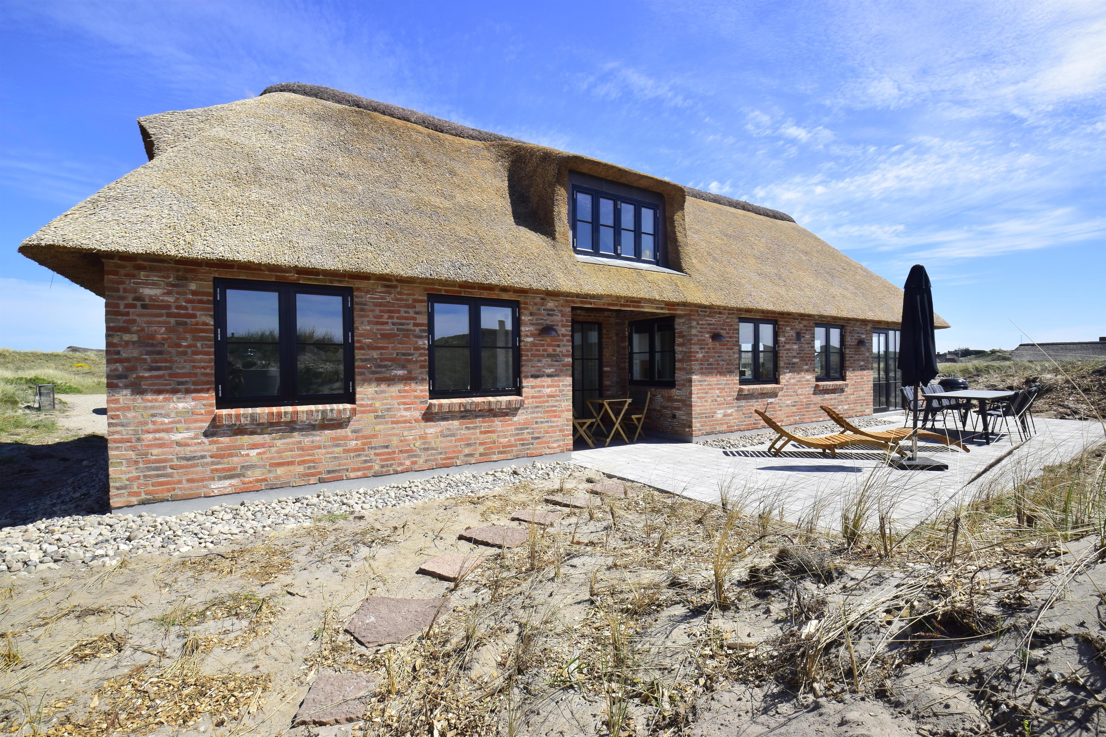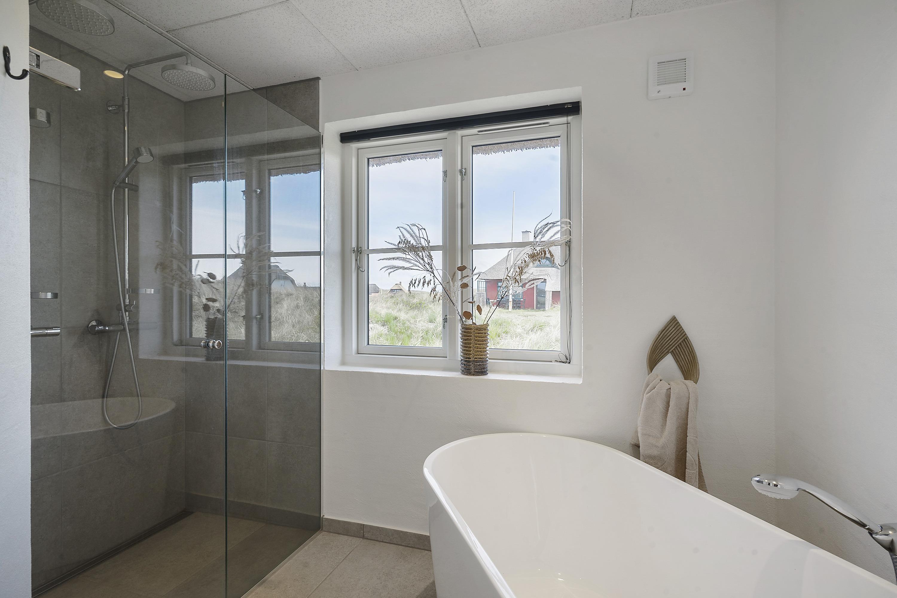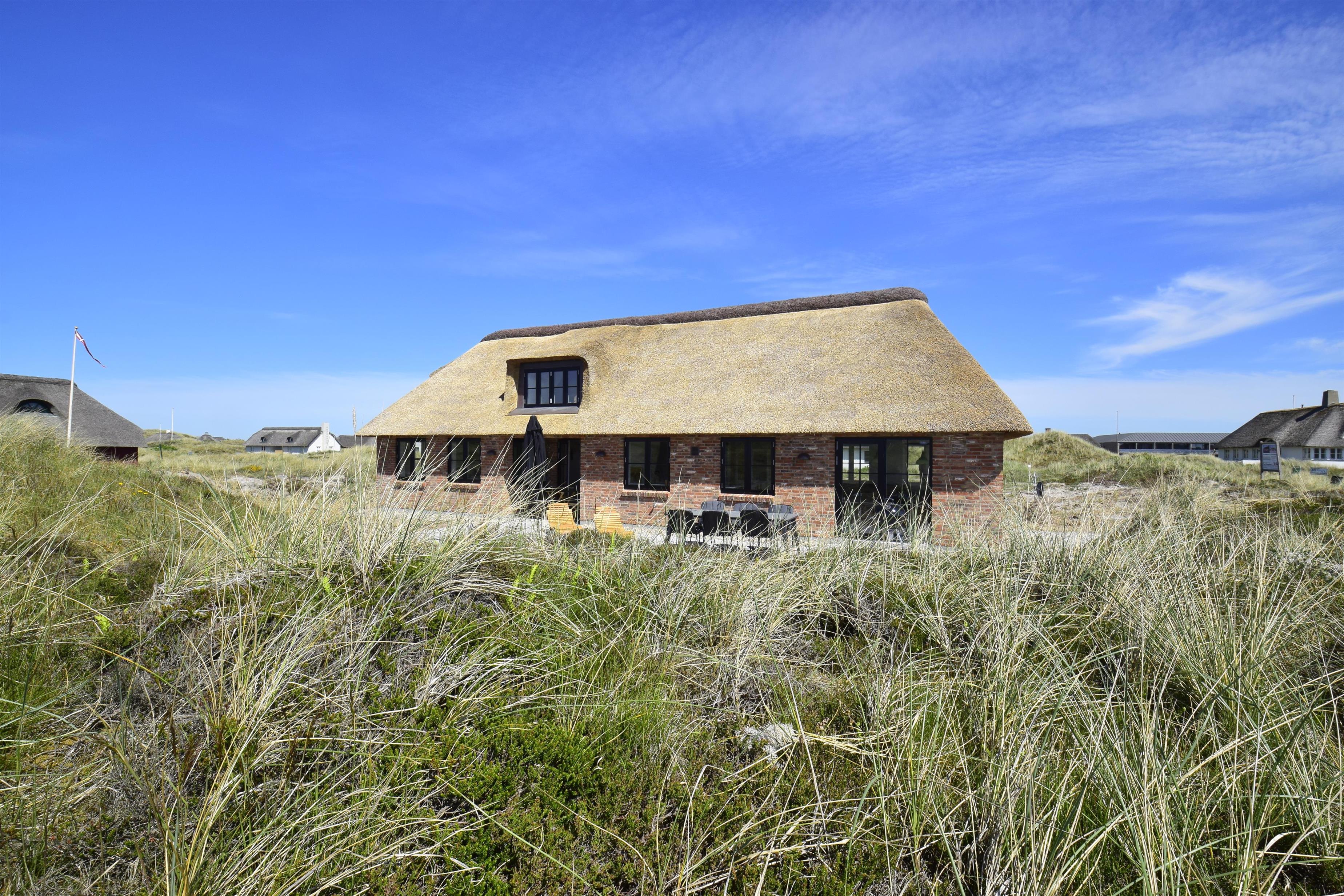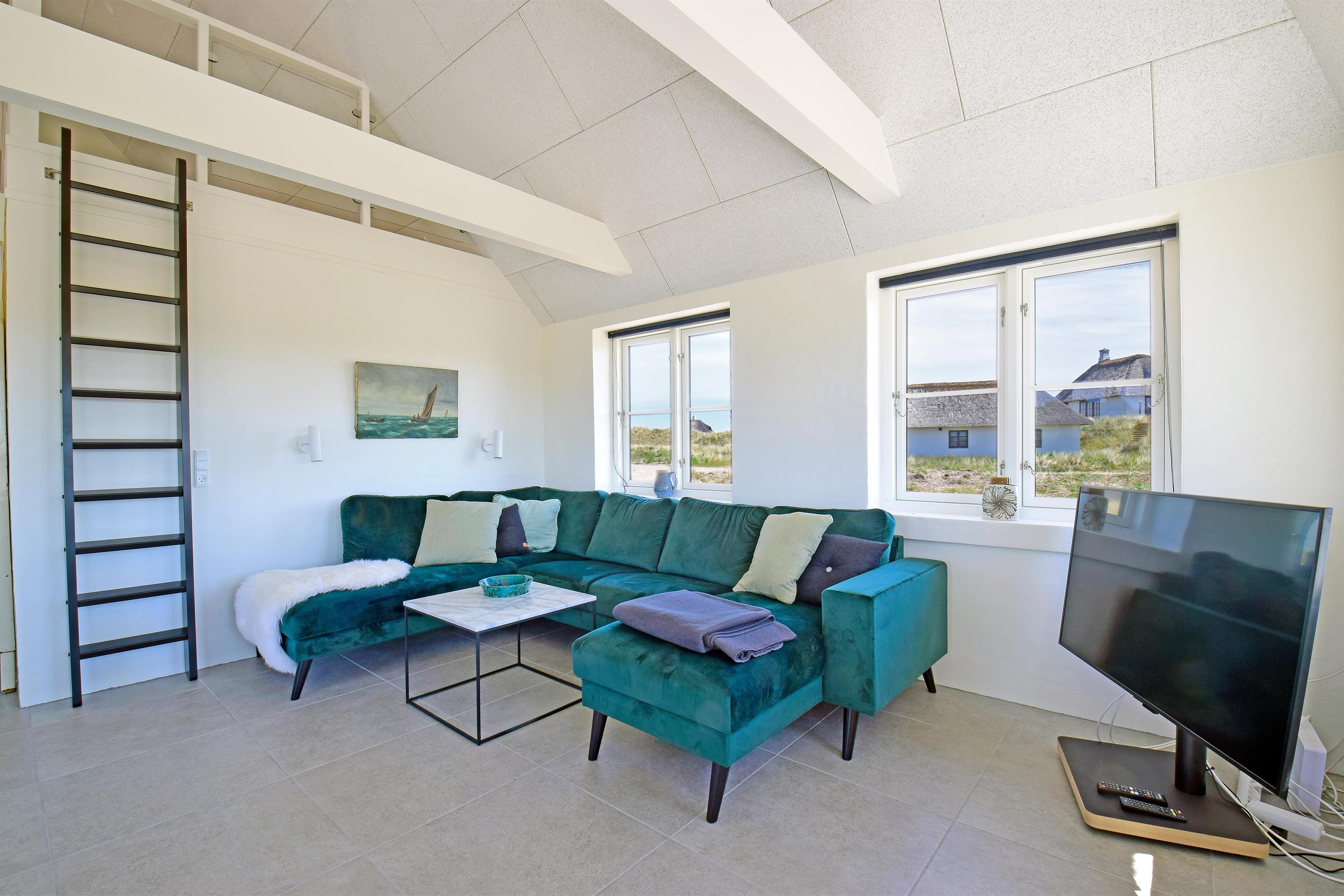 Aufteilung: Großer heller Eingangsflur mit Treppe zum 1. Stock, Waschmaschine und Trockner. Heller Wohnraum mit tollem Ausblick und vielen Fenstern in alle Richtungen, offen bis zum Dachfirst mit sichtbaren Balken. Hochwertige Küche in offener Verbindung zum Wohn-/Essbereich. Toll für Kinder: Vom Wohnzimmer aus geht eine Leiter auf eine kleine Halbetage, auf Dänisch Hems genannt. Hier können sie super spielen und ihr eigenes kleines Reich einrichten. Insgesamt 3 Schlafzimmer: Zwei im Erdgeschoss 1 x mit 180 cm mit Doppelbett, 1 x mit 160 cm Doppelbett - das kleinere Zimmer hat direkten Zugang zum Duschbad - und eines im 1. Stock mit 2 Einzelbetten, die zusammengestellt werden können. Ihr habt zwei schöne, moderne Bäder zur Verfügung, eines davon als Wellnessbad mit Doppelduschkabine, Badewanne und Sauna. Wenn ihr vom Strand kommt, ist die Außendusche mit warmem Wasser sehr angenehm.