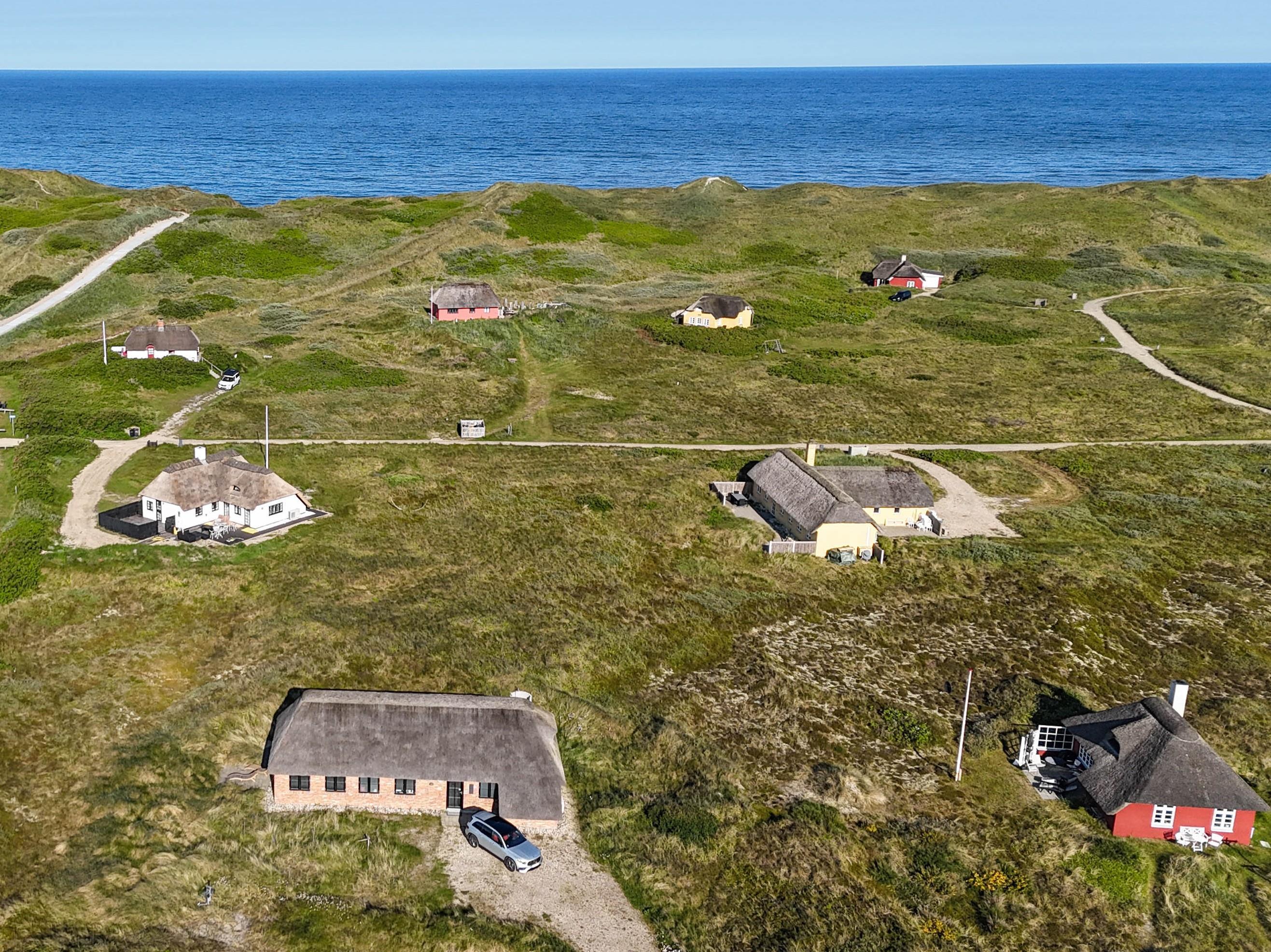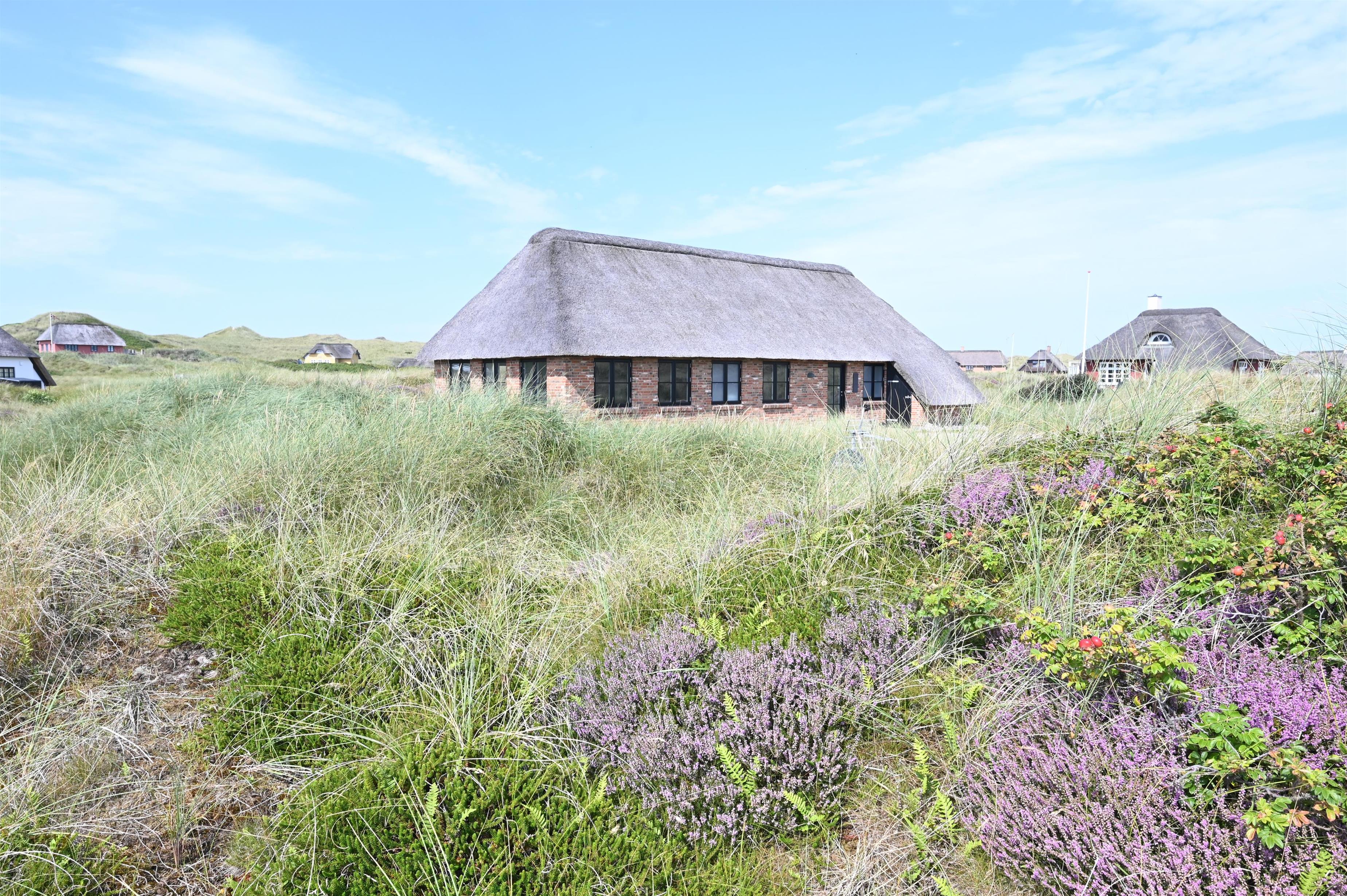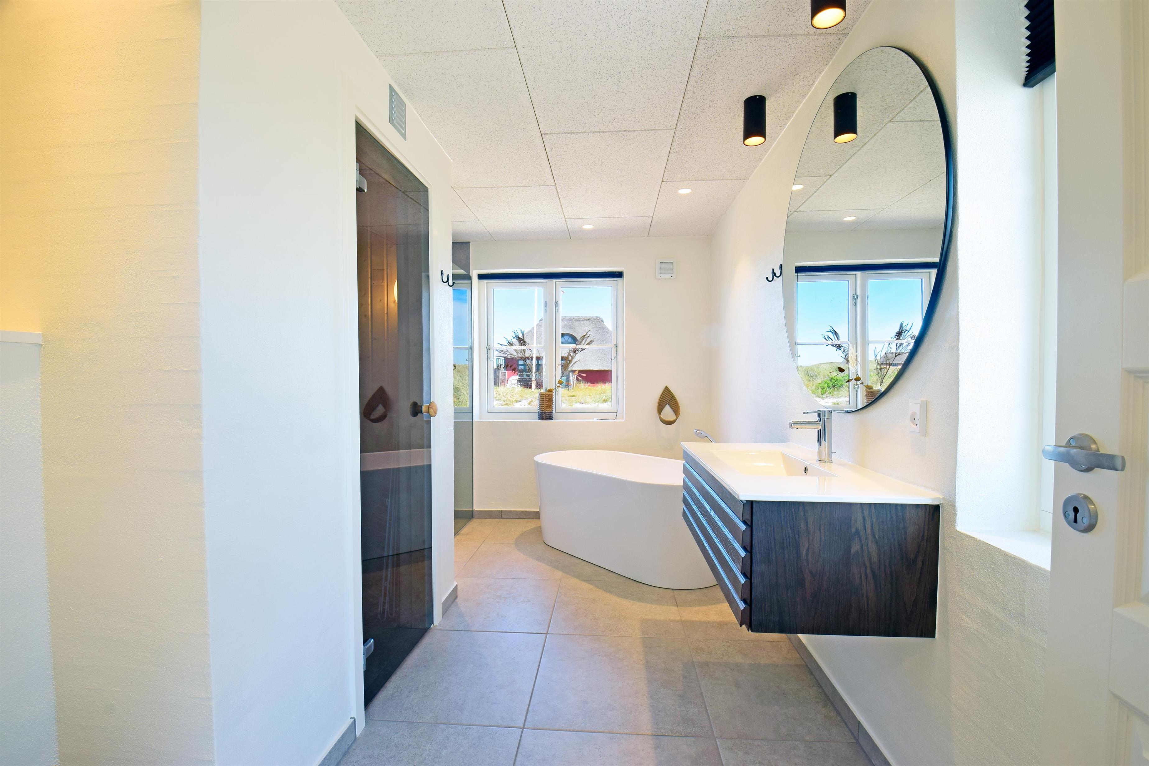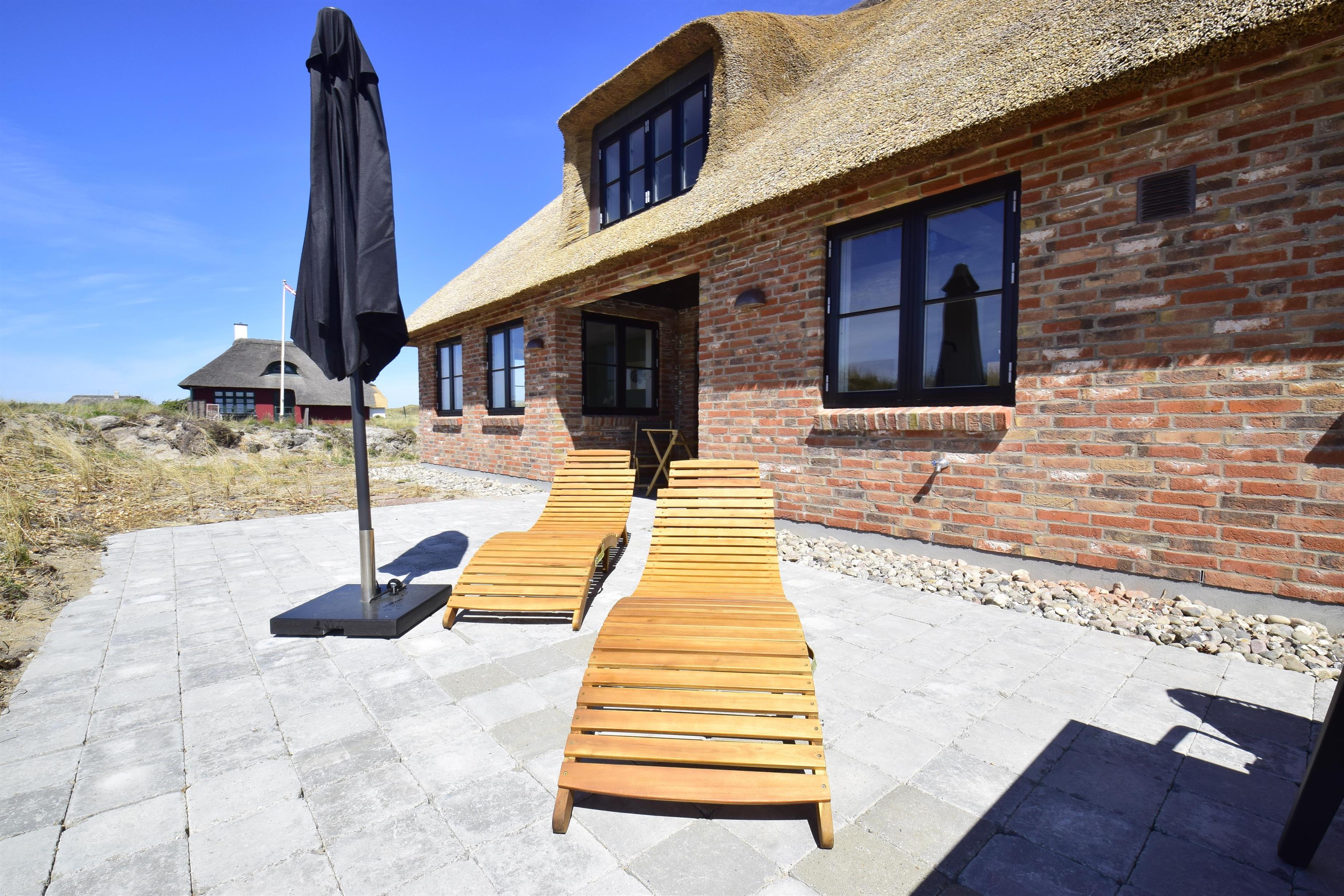 Aufteilung: Großer heller Eingangsflur mit Treppe zum 1. Stock, Waschmaschine und Trockner. Heller Wohnraum mit tollem Ausblick und vielen Fenstern in alle Richtungen, offen bis zum Dachfirst mit sichtbaren Balken. Hochwertige Küche in offener Verbindung zum Wohn-/Essbereich. Toll für Kinder: Vom Wohnzimmer aus geht eine Leiter auf eine kleine Halbetage, auf Dänisch Hems genannt. Hier können sie super spielen und ihr eigenes kleines Reich einrichten. Insgesamt 3 Schlafzimmer: Zwei im Erdgeschoss 1 x mit 180 cm mit Doppelbett, 1 x mit 160 cm Doppelbett - das kleinere Zimmer hat direkten Zugang zum Duschbad - und eines im 1. Stock mit 2 Einzelbetten, die zusammengestellt werden können. Ihr habt zwei schöne, moderne Bäder zur Verfügung, eines davon als Wellnessbad mit Doppelduschkabine, Badewanne und Sauna. Wenn ihr vom Strand kommt, ist die Außendusche mit warmem Wasser sehr angenehm.