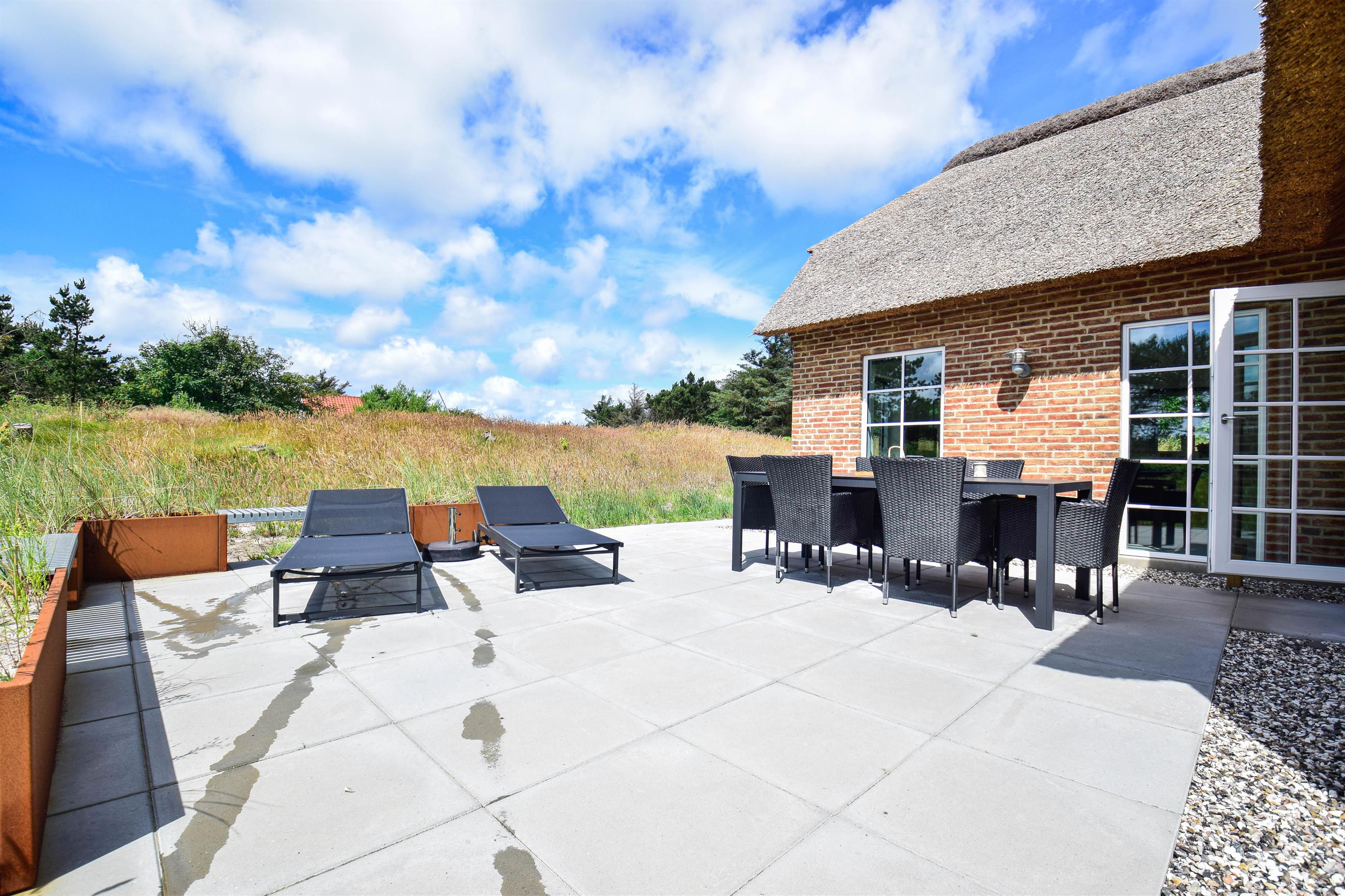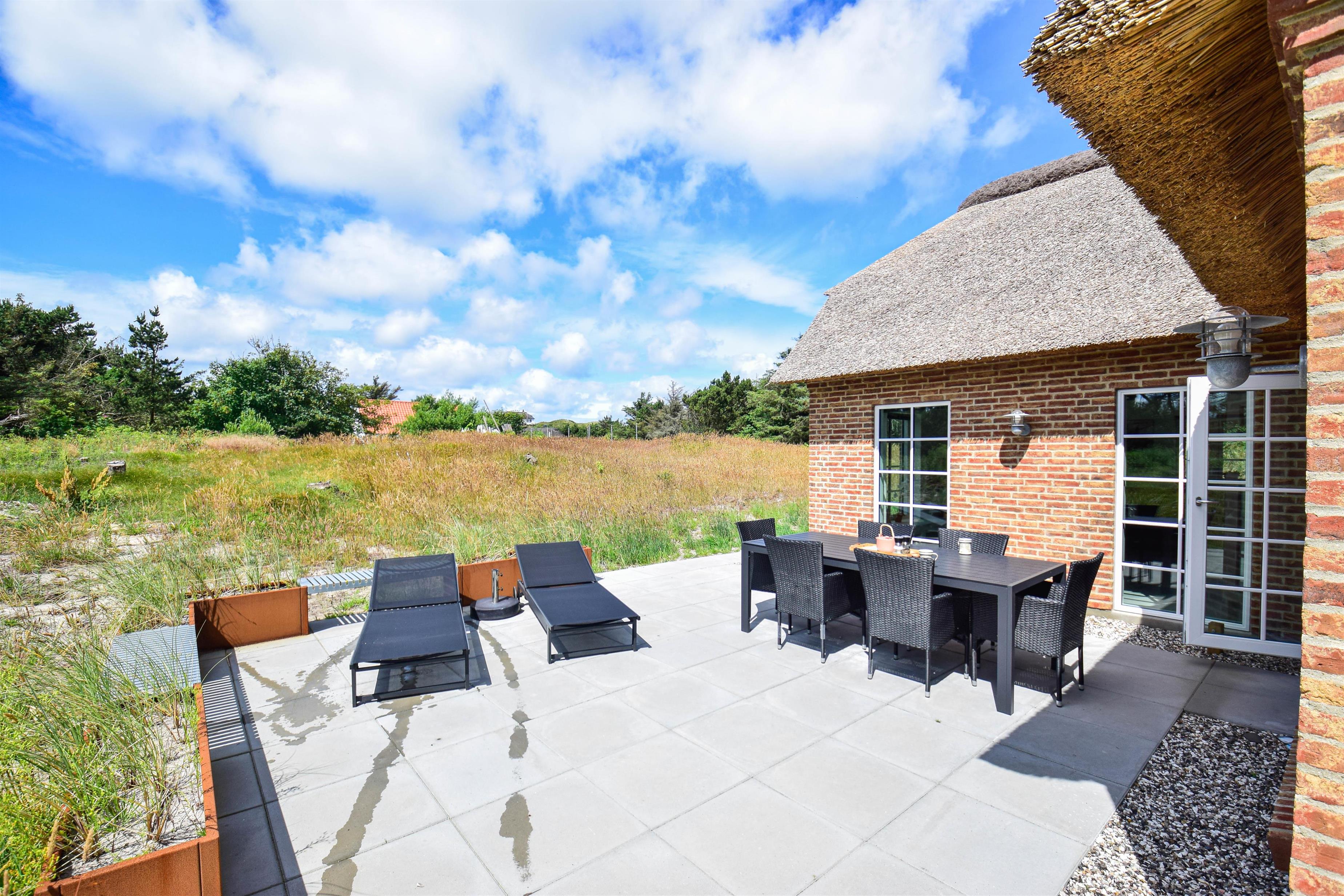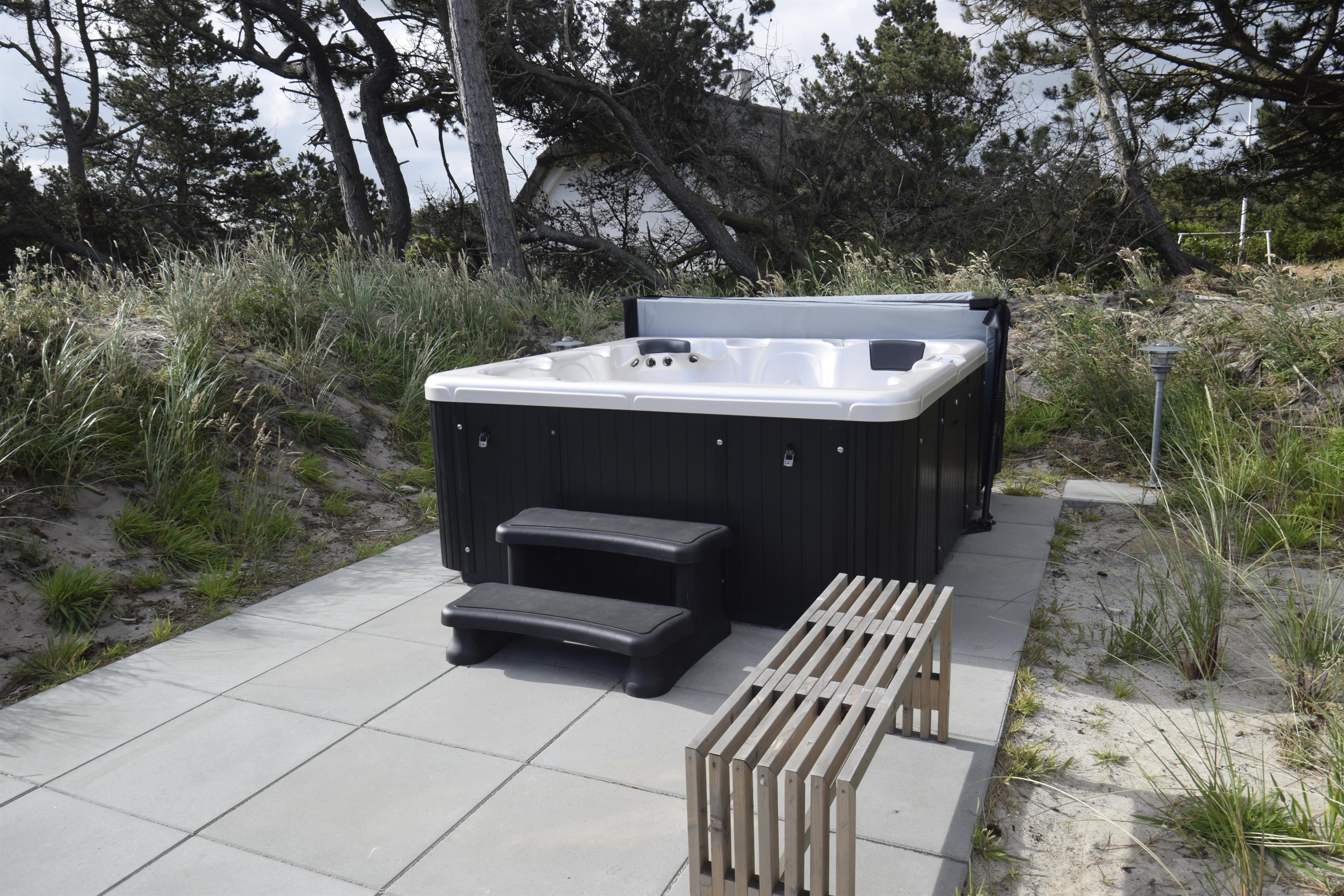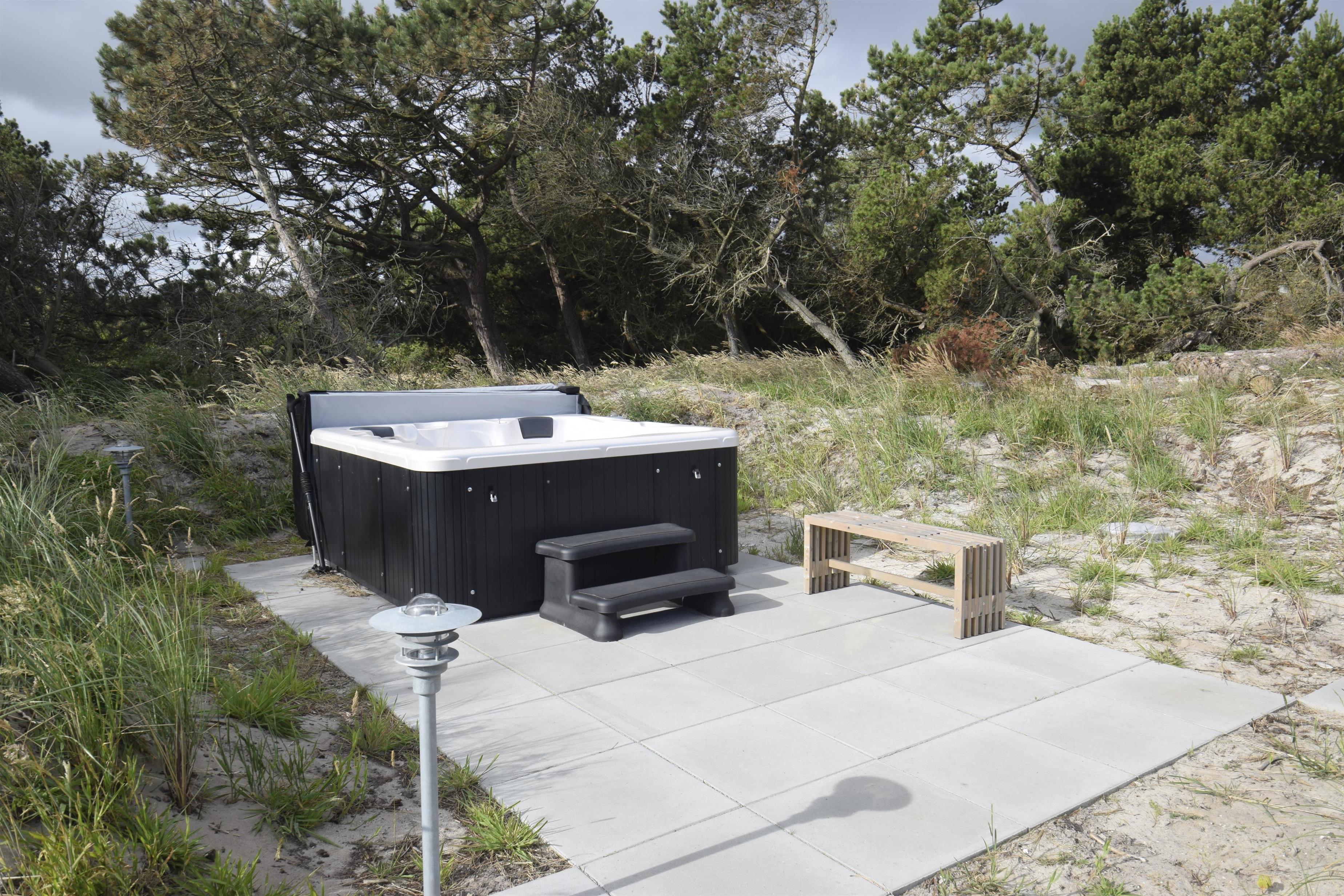 Am unteren Ende des Grundstücks befindet sich eine weitere Terrasse mit Außen-Whirlpool und Dusche – von hier aus hast du einen schönen Blick auf die Dünen und kannst die Sonne beim Untergehen beobachten.