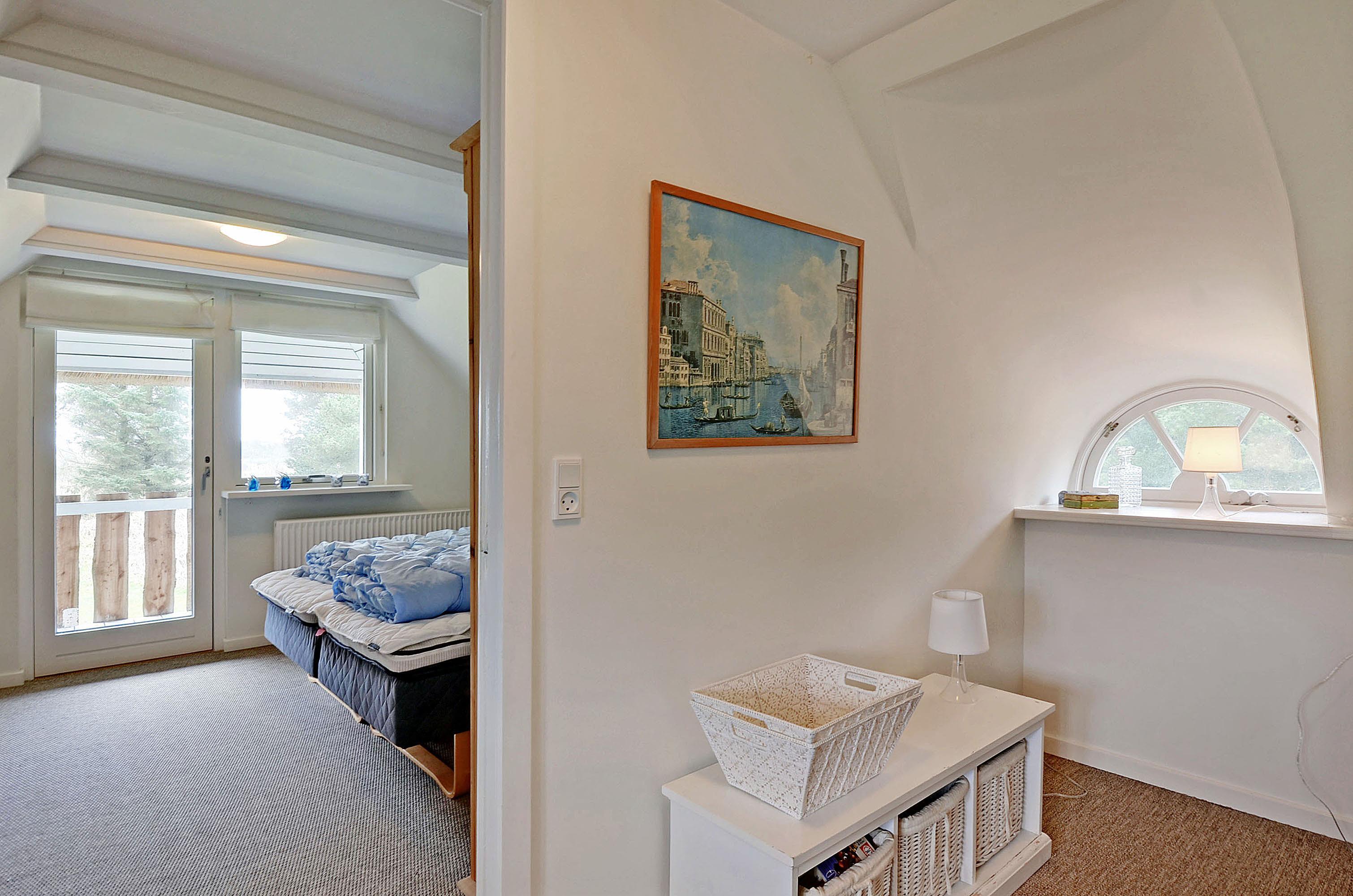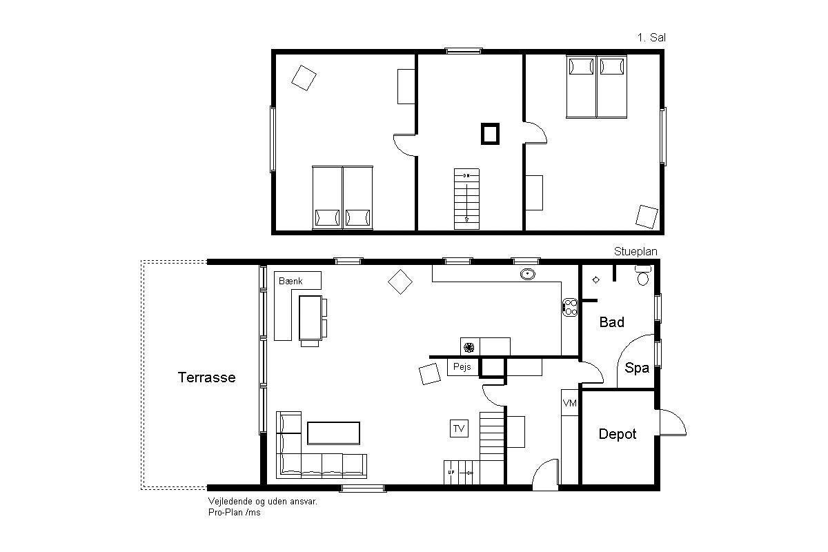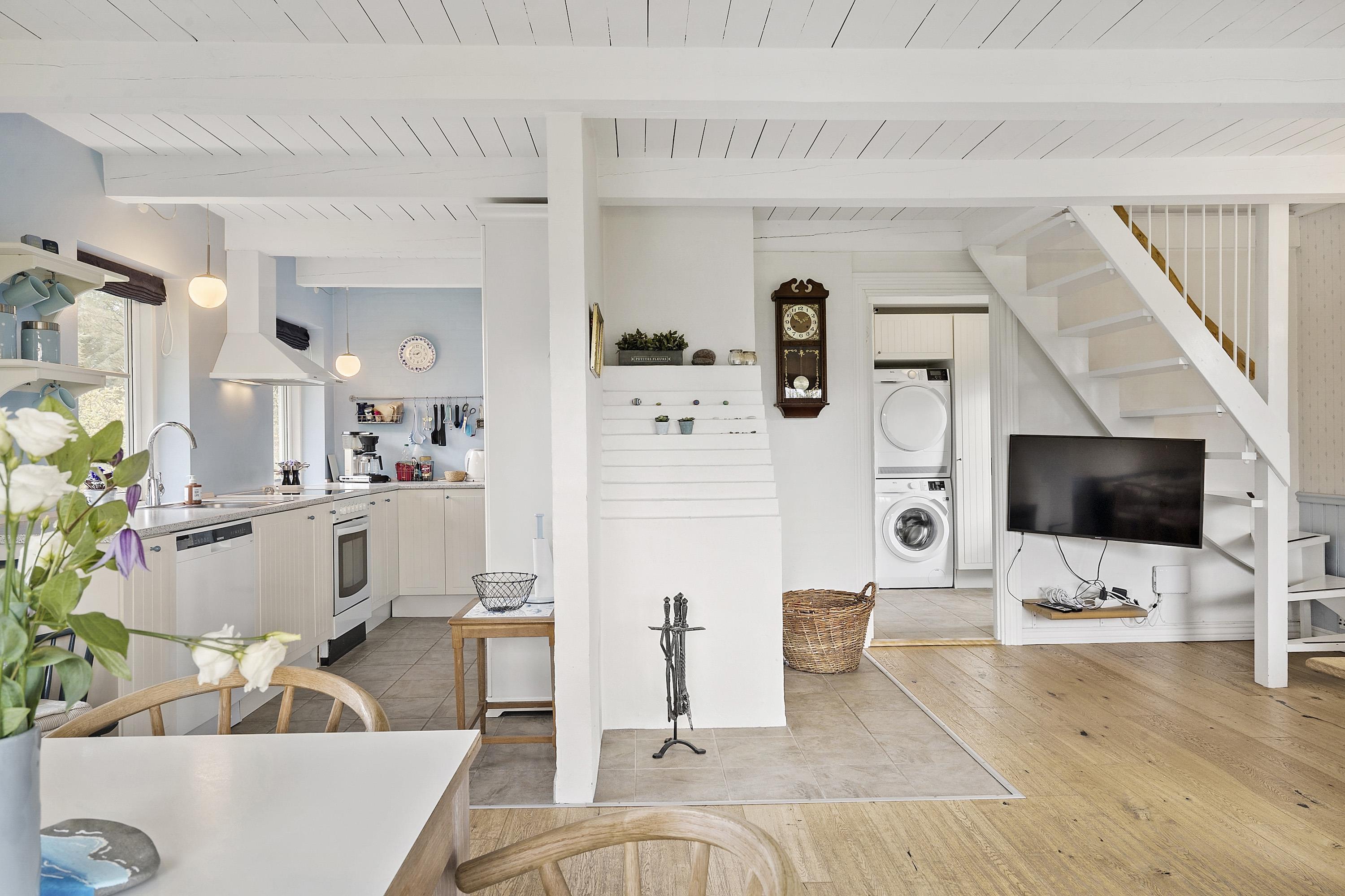 Vom praktischen Eingangsbereich mit Einbauschränken, Waschmaschine und Trockner gelangst du in ein helles und einladendes Badezimmer mit Dusche und Whirlpool, ideal zum Entspannen nach einem Tag in der Natur. Das gemütliche Wohnzimmer ist mit einem Holzofen, schönen Details und einer Treppe zum Obergeschoss ausgestattet. Von hier aus führt eine Tür auf die große, südlich ausgerichtete Terrasse, auf der du den ganzen Tag die Sonne genießen kannst. Im Obergeschoss befindet sich ein kleiner Flur, ein Schlafzimmer mit zwei Einzelbetten (die zusammengestellt werden können) sowie ein großes Schlafzimmer mit Zugang zum Balkon – der perfekte Ort, um den Tag mit frischer Luft und Vogelgesang zu beginnen. Im Schlafzimmer steht außerdem ein Fernseher, sodass du den Abend gemütlich mit einem guten Film ausklingen lassen kannst.