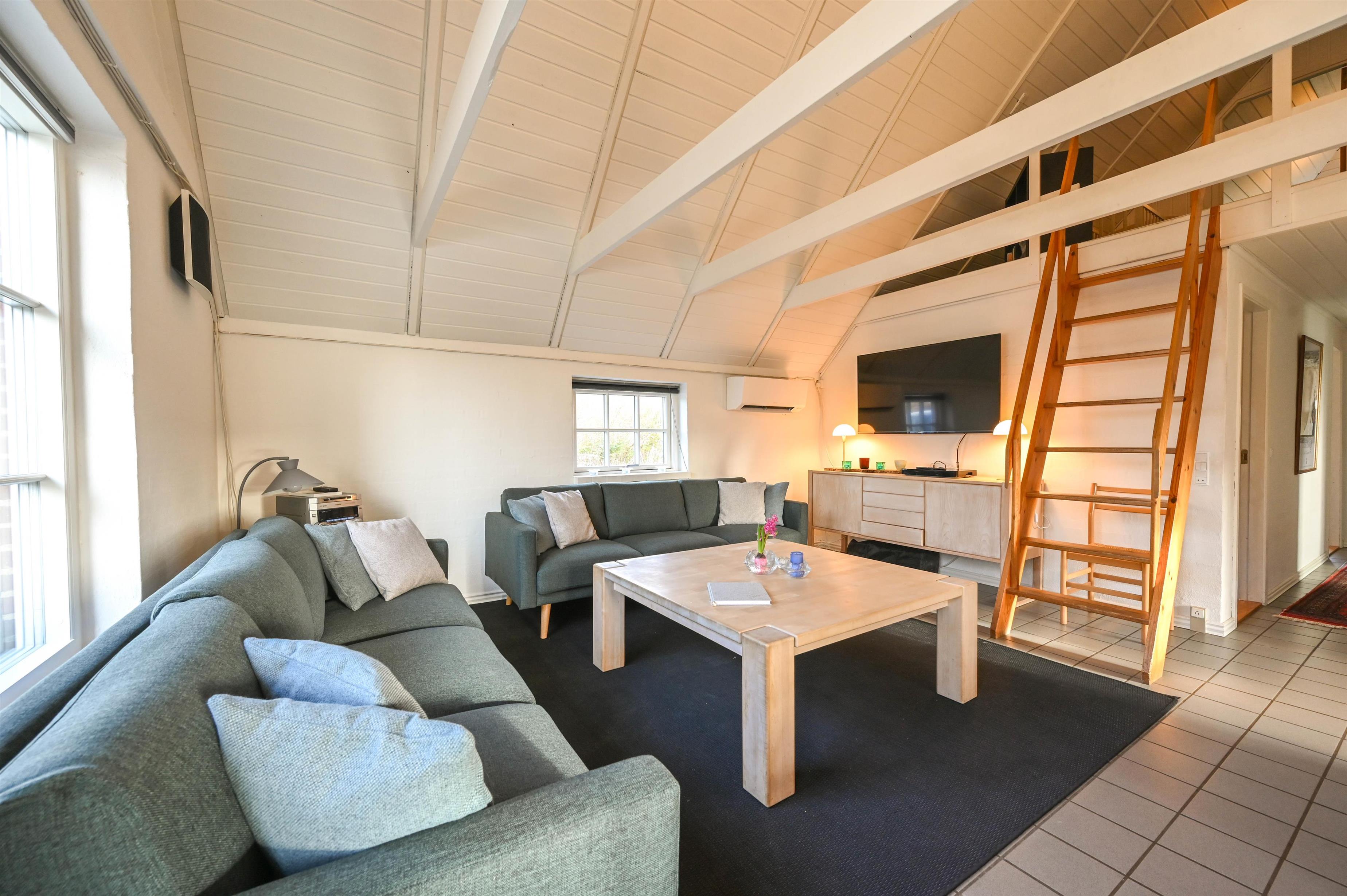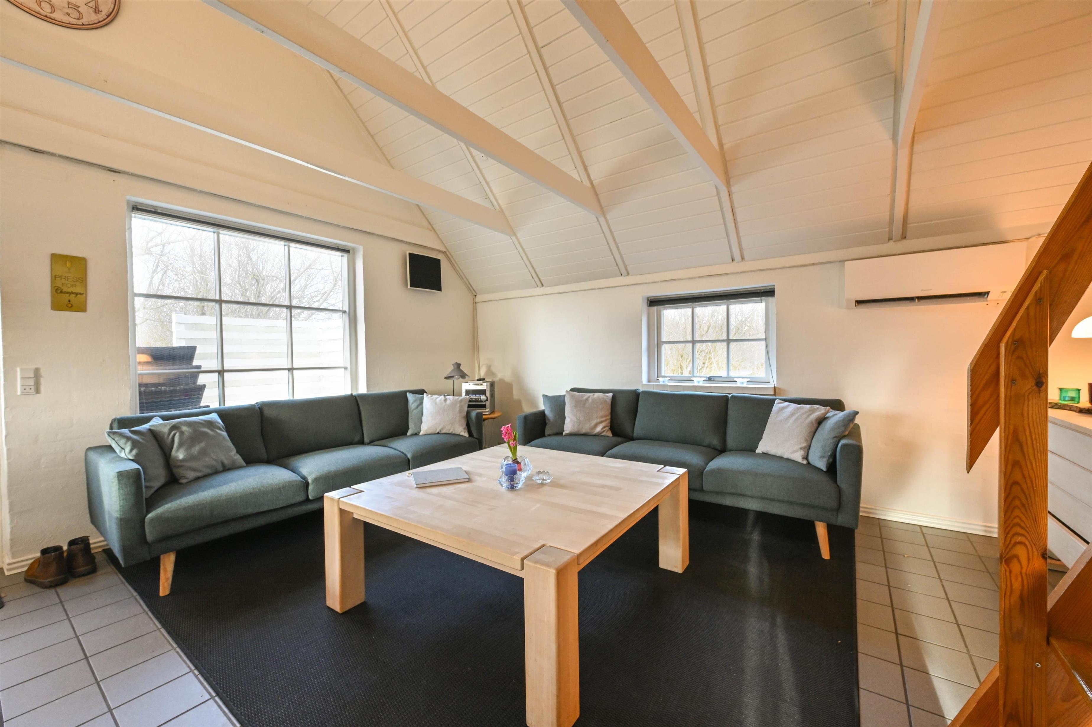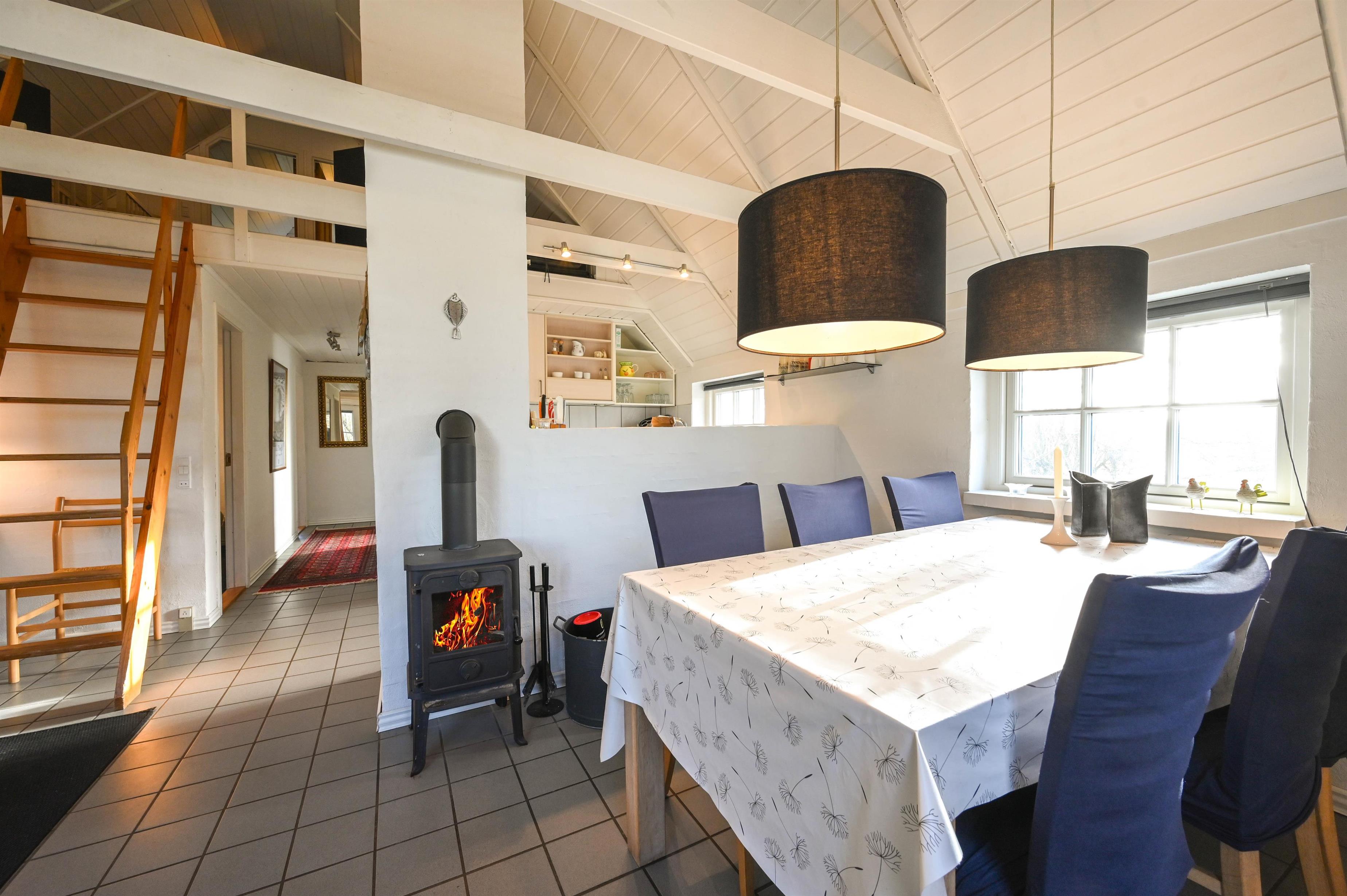 Im Wohnzimmer findest du ein gemütliches Sofa, einen Kamin und einen Essbereich – von hier aus gelangst du direkt auf die teilweise überdachte Terrasse, auf der du das ganze Jahr über frische Luft genießen kannst.