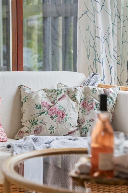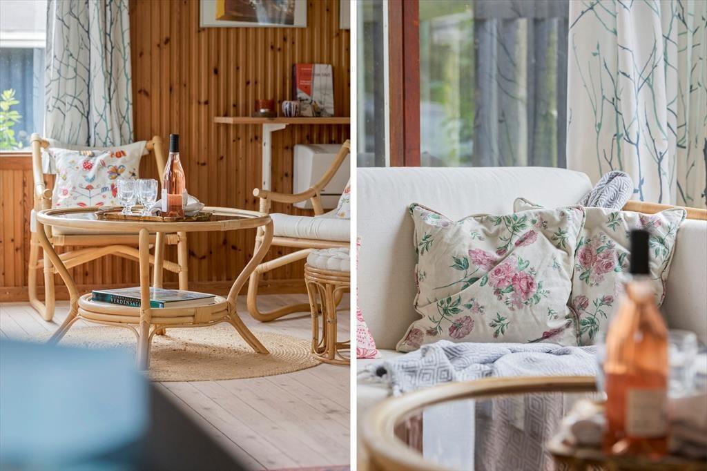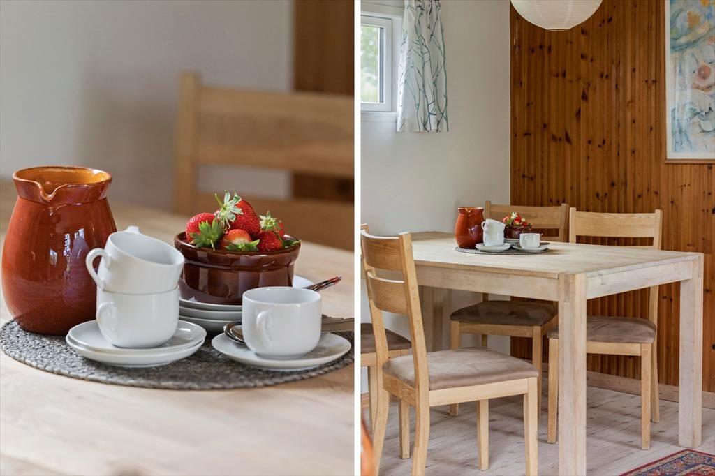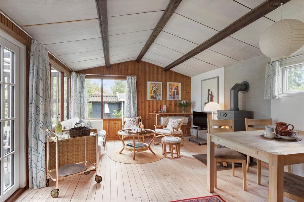 Den hyggelige opholdsstue er indrettet med behagelige møbler og en stemningsfuld brændeovn, der skaber den perfekte atmosfære til at fordybe sig i en god bog eller nyde en afslappende aften foran ilden. Fra stuen er der adgang til en overdækket terrasse, som forlænger udesæsonen og giver mulighed for at beundre den pragtfulde udsigt over landskabet, uanset vejret.