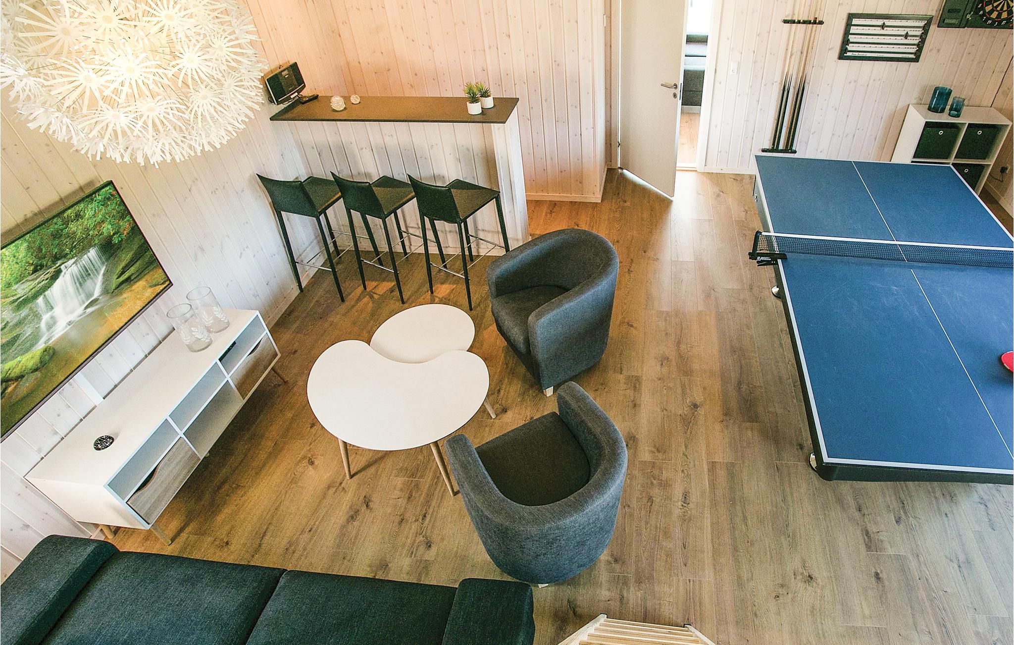Interessantes und schönes Ferienhaus, hier wurde auf eine gute Einrichtung und Details Wert gelegt. Das Haus passt zur ganzen Familie, wo z. B. die Kinder all ihre Energie im Poolraum los werden. Der Rest der Gesellschaft wird natürlich auch den Whirlpool und die Sauna lieben. Im Spielzimmer unternimmt die Familie Wettkämpfe mit Tischtennis und Billard. An der Bar mit Kühlschrnak können Drinks gemixt werden. Der große Hems wird vor allem auch die Kinder interessieren. Die gut dimensionierte Küche ist ausgezeichnet ausgestattet, es gibt 2 Herde, 2 Geschirrspüler und in den Kühlgeräten viel Platz. Die Küche ist zum Wohnzimmer offen, so sind Sie sich auch beim Zubereiten des Essens ganz nah. Das Umgebung ist ein schönes Naturgebiet. Nicht weit mit dem Auto haben Sie es nach Heatherhill und zum Badestrand. Sie wohnen hier auch gut um Wanderungen zu unternehmen. Die Vorauszahlung für den Verbrauch und die Endreinigung werden im Haus in bar entgegen genommen. Bettwäsche und Handtücher können Sie im Servicebüro von uns bestellen und mieten.