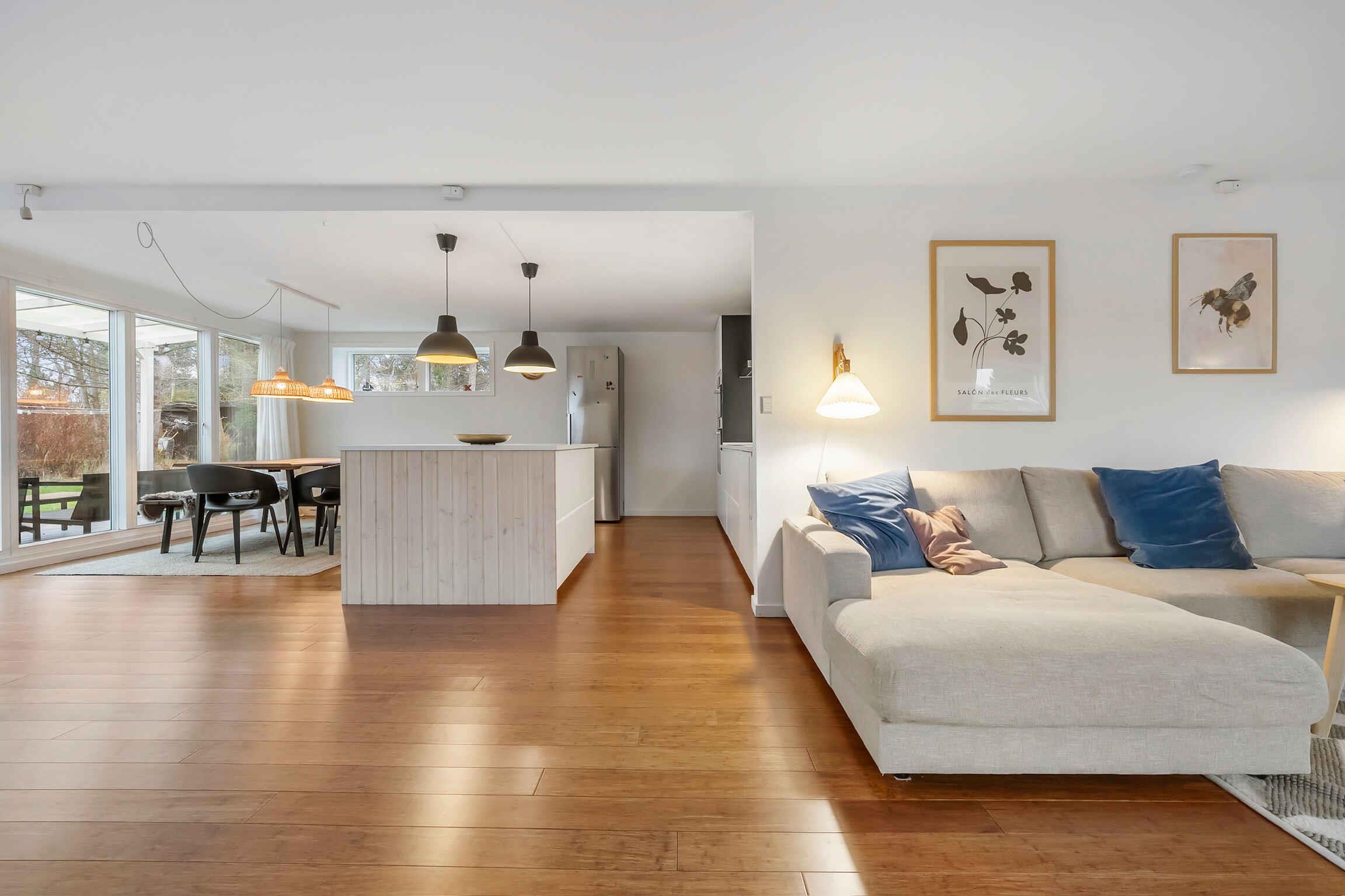 Helles, gepflegtes Ferienhaus im ruhigen Rågeleje mit offenem Wohnbereich, 2 Schlafzimmern und 1.200 m² Grundstück. Terrasse, überdachter Bereich und Garage von 2021. Nahe Strand, Wald und Heatherhill.
