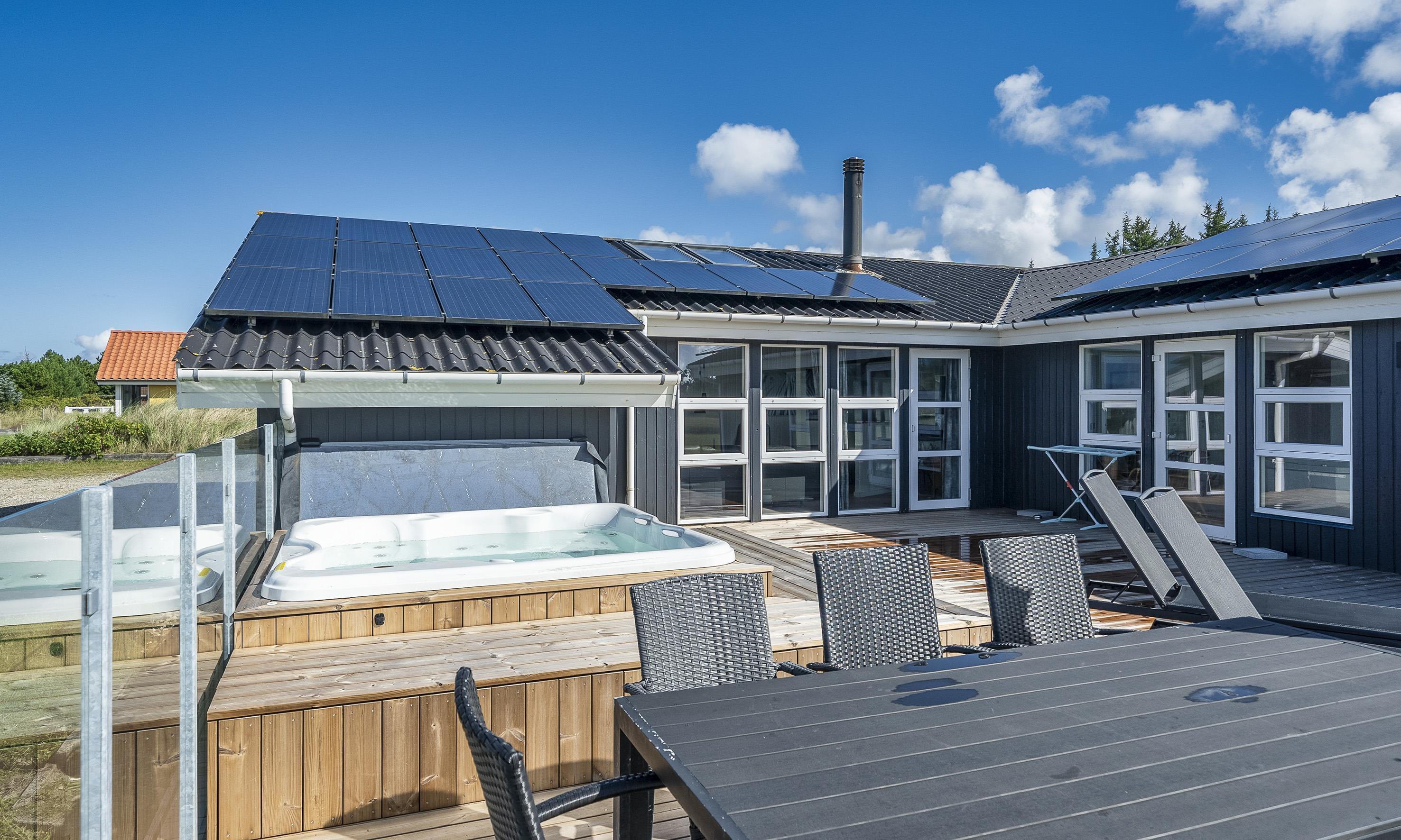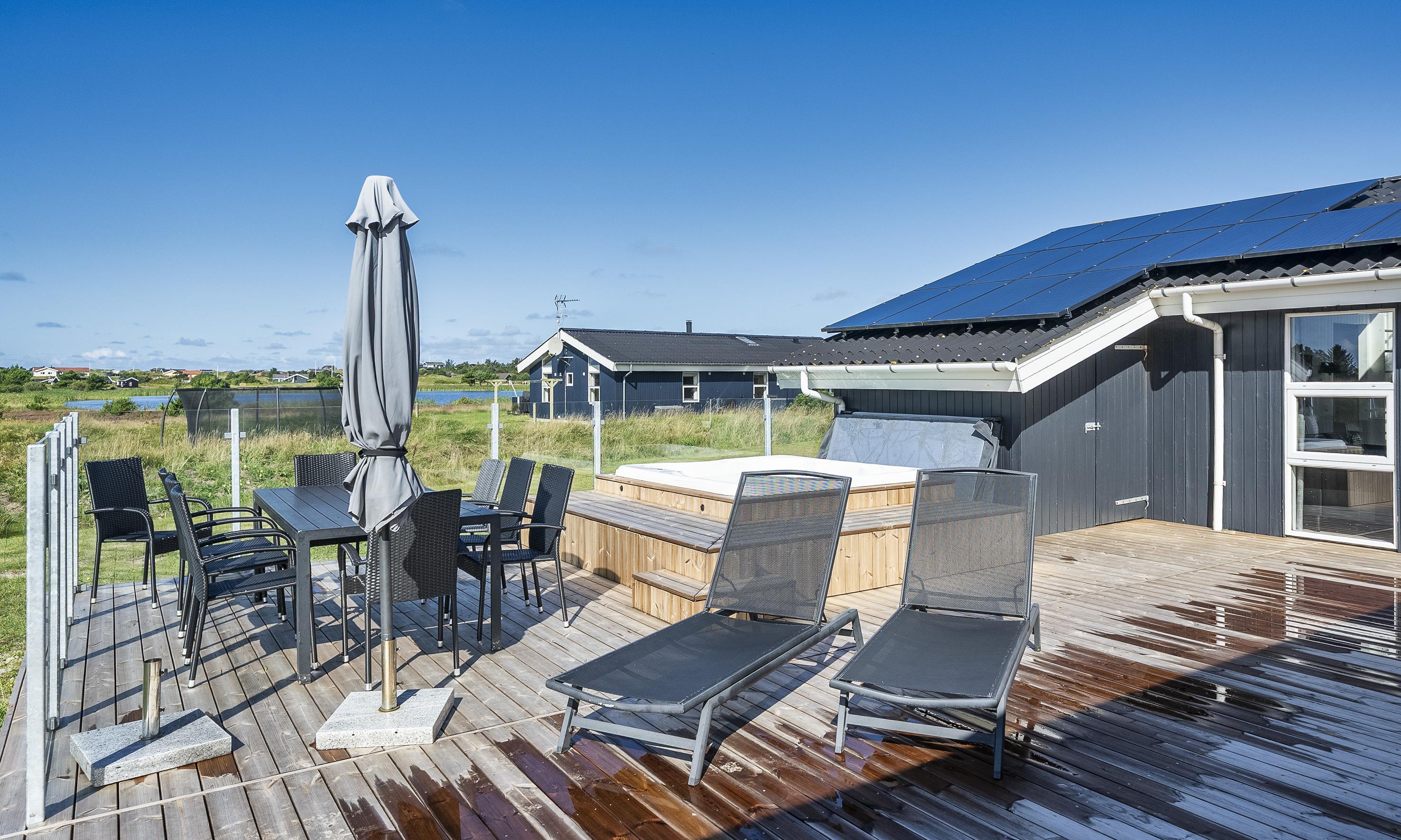 Schönes grosses Poolhaus in ruhiger Lage auf einem ca. 2.100 m2 grossem Grundstück gelegen. Das Haus ist für 8 Personen ausgestattet und liegt ca. 1,1 Km vom Strand entfent. Ein Fahrradweg der von Vejers nach Grærup Strand führt, befindet sich in unmittelbarer Nähe und direkt hinter dem Haus am Waldrand. Das Wohnzimmer ist mit einer grossen Leder-Rundsitzgarnitur ausgestattet und ein einen Kamin der von einer kleinen gemauerten Wand umgeben ist. Dadurch ist der Wohnbereich vom Essbereich etwas abtrennt. Hohe Decken strahlen einen besonderen Charme aus. Beim Wohnbereich befindet sich ein kleiner Hems. Dieser ist mit Madratzen ausgelegt und hier können Sie einfach auch mal die Ruhe geniessen, aber trotzdem alles im Hause hören. Natürlich haben auch die Kleinen Gäste die Möglichkeit alles von oben zu beobachten und haben sogar ein gutes Versteck zum spielen. Beim Eingangsbereich befindet sich ein kleines Hyggezimmer / Spiel- oder Gemütlichkeitszimmer, wo Sie sich zurückziehen und abschalten können. Das deutsche Fernsehprogramm empfangen Sie über Stofa, daher sind nur 5-8 deutsche Kanäle die empfangen werden können. Radio mit Bluethooth zugangAusserdem gibt es Chrome Cast in dem kleinen Zimmer und im Wohnbereit, auch TV2 kann im Wohnbereich empfangen werden. Die neue Küche ist zum Essbereich offen gehalten und verfügt über einen Herd mit Induktionskochfeld, einem Backofen, einer Mikrowelle, einer Geschirrspülmaschine und einem grossen Kühlschrank. Eine zusätzliche Gefriertruhe befindet sich im Schuppen. Die Schlafzimmer und der gemütliche Wohnbereich sind mit Teppichboden verlegt. Die Küche und der Essbereich sind mit ein Laminatboden ausgestattet. Es gibt eine Wärmepumpe im Ferienhaus. Mit dieser Wärmepumpe haben Sie die Möglichkeit die Stromkosten zu senken, da sie energiesparend ist. Es gibt 2 Badezimmer im Hause und ein zusätzliches Gäste WC. Beide Badezimmer verfügen über ein WC, ein Handwaschbecken und eine Dusche. Das eine Badezimmer ist vom Poolbereich aus zu erreichen und hat noch eine Sauna. Die Bäder sind alle neu renoviert. Das Gäste WC hat ein Handwaschbecken und ein WC. Insgesamt befinden sich vier Schlafzimmer im Ferienhaus: DB + DB + DB + DB. Alle Toppers sind in volle Grösse. Kleiner Heimarbeitsplatz mit Schreibtisch und Stuhl. Das Schwimmbecken befindet sich in dem separaten Poolbereich, das durch eine grosse Glasfront mit Eingengstür, im Bereich des Esstisches, abgetrennt ist und hat eine Grösse von ca. 5 x 4 x 1,1 Meter ( Länge X Breise X Tiefe). Desweiteren befindet sich hier auch der Standwasser- Whirlpool ( für ca. 6 Personen ). Dieser ist ständig mit Wasser gefüllt und daher sofort betriebsbereit. Der Standwasser-Whirlpool ist so gross, das gleichzeitig sechs Personen das Vergnügen des Whirlpools nutzen können. Eine Waschmaschine und ein Trockner stehen den Gästen zur Verfügung. Bei diesem Ferienhaus ist desweiteren ein geringer Energieverbrauch durch eine Wärmerückgewinnung. Auf dem Grundstück befindet sich eine Sandkiste und ein Schaukelstativ für die Kleinen Gäste und genügend Platz zum Spielen und Toben. Das Ferienhaus verfügt über einen Internetanschluss (W-Lan/200/200). Es sind max. drei Haustiere erlaubt. Die Außenanlage lädt zum Spielen, Entspannen und Verbringen angenehmer Momente ein. Das 2.100 m² große Naturgrundstück bietet viel Platz für Kinder und Erwachsene – für die Kleinen gibt es einen Sandkasten und eine Schaukel, während die große, offene Terrasse von ca. 70 m² zu sonnigen Mittagessen und langen Sommerabenden einlädt. Von der Terrasse aus haben Sie einen atemberaubenden Blick auf den See, der eine ruhige und malerische Atmosphäre schafft. Hier finden Sie auch einen modernen Außen-Spa (ab 2025), in dem Sie im warmen Wasser versinken und gleichzeitig den herrlichen Blick auf die glitzernde Wasseroberfläche des Sees genießen können. Weitere Informationen erhalten Sie im Büro. Freier Zugang zum Wasserpark und Bowling in Varde in 2026. Ladesteckdose für Elektroautos. Rauchen nicht gestattet. Erbaut 1988, renoviert 2020.