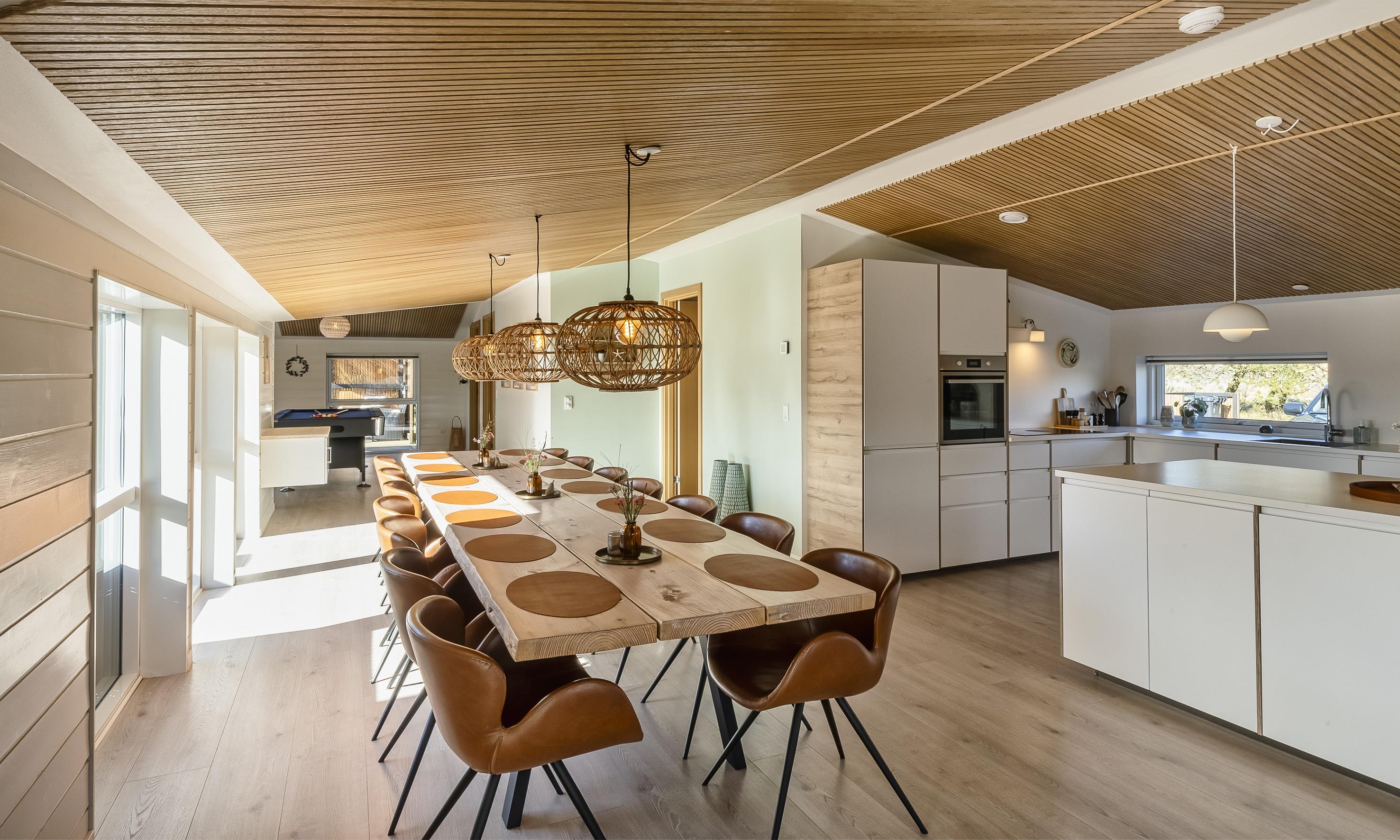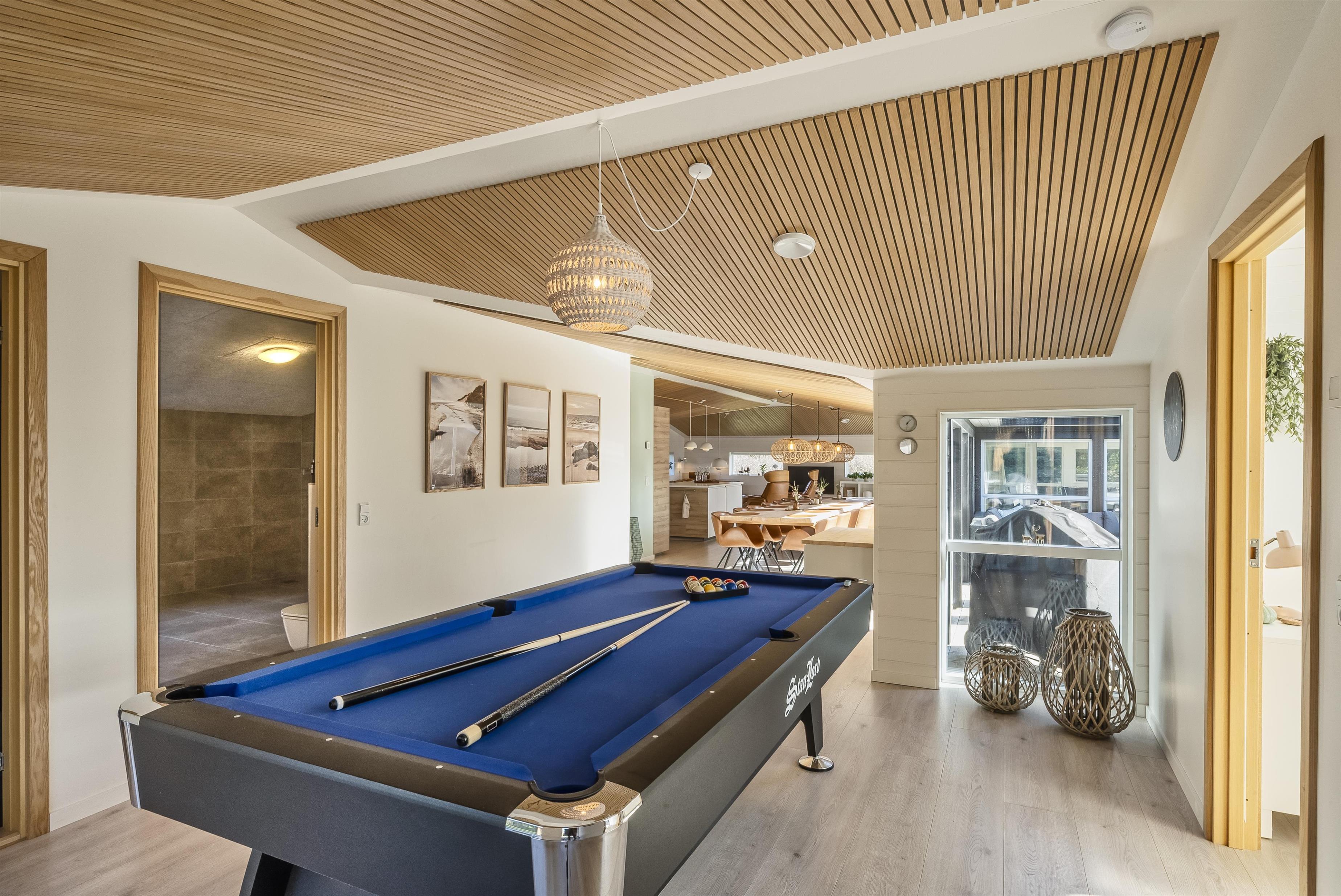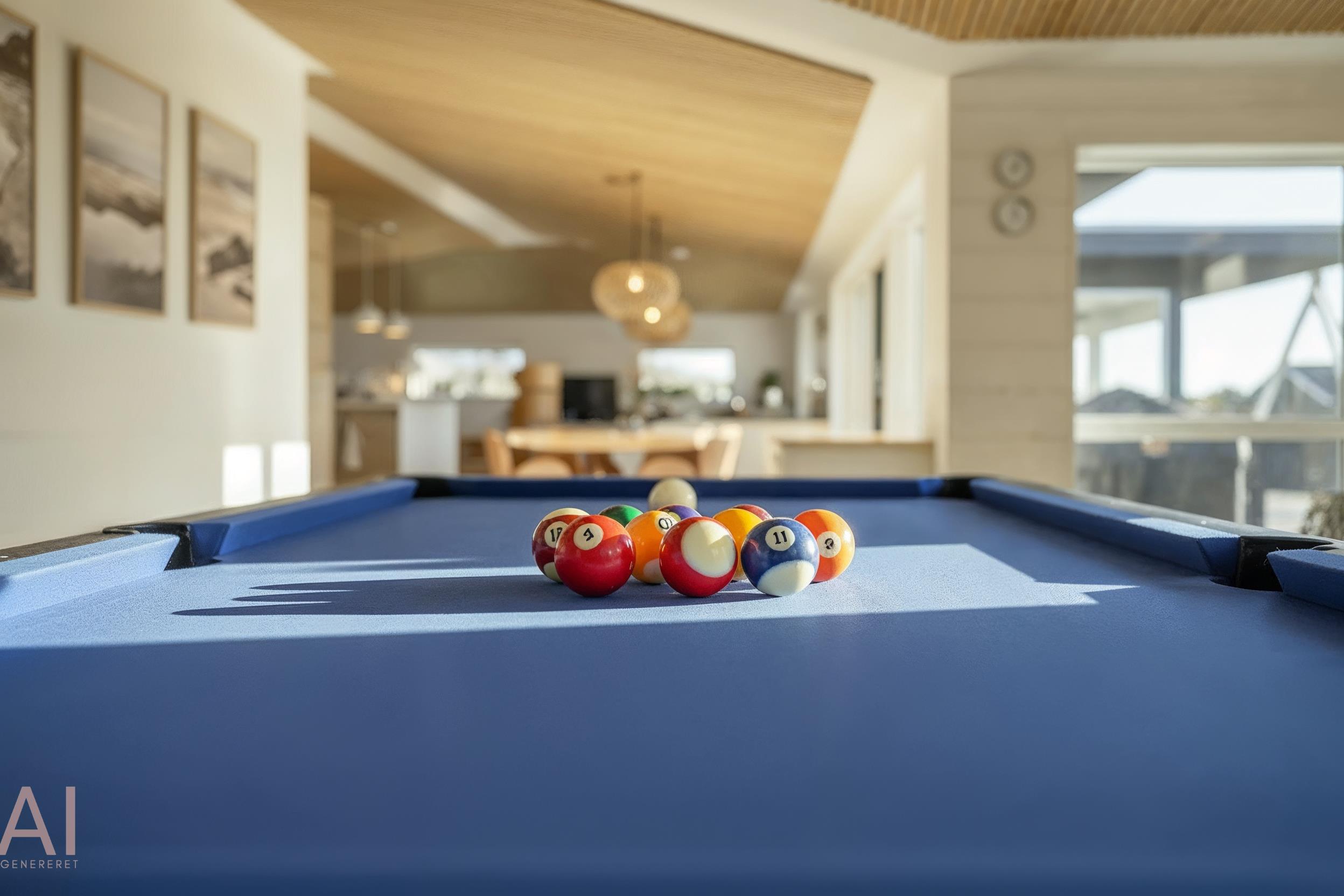 Funktionale Küche mit Kochinsel, Essbereich und Wohnzimmer sowie ein offener Bereich mit Billardtisch.