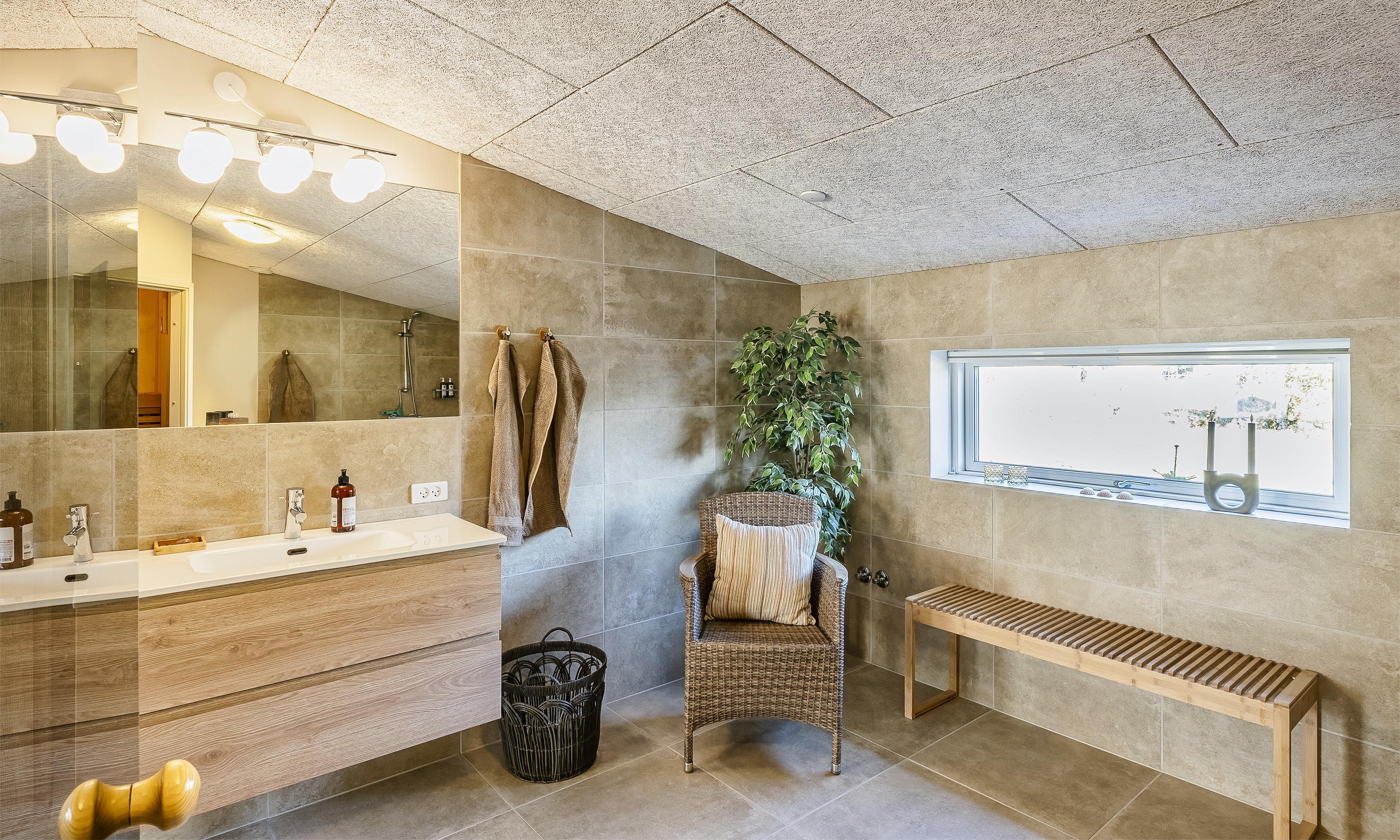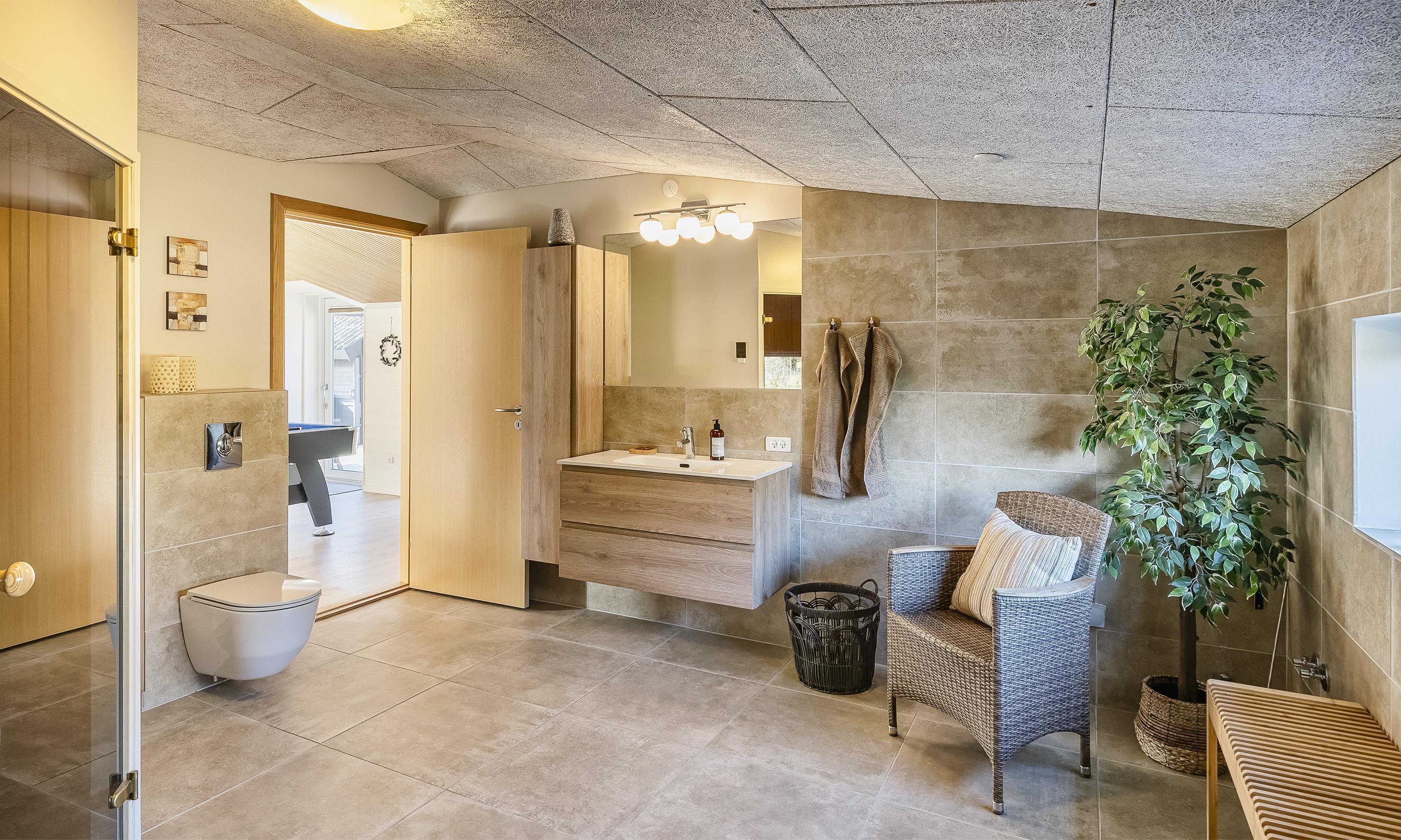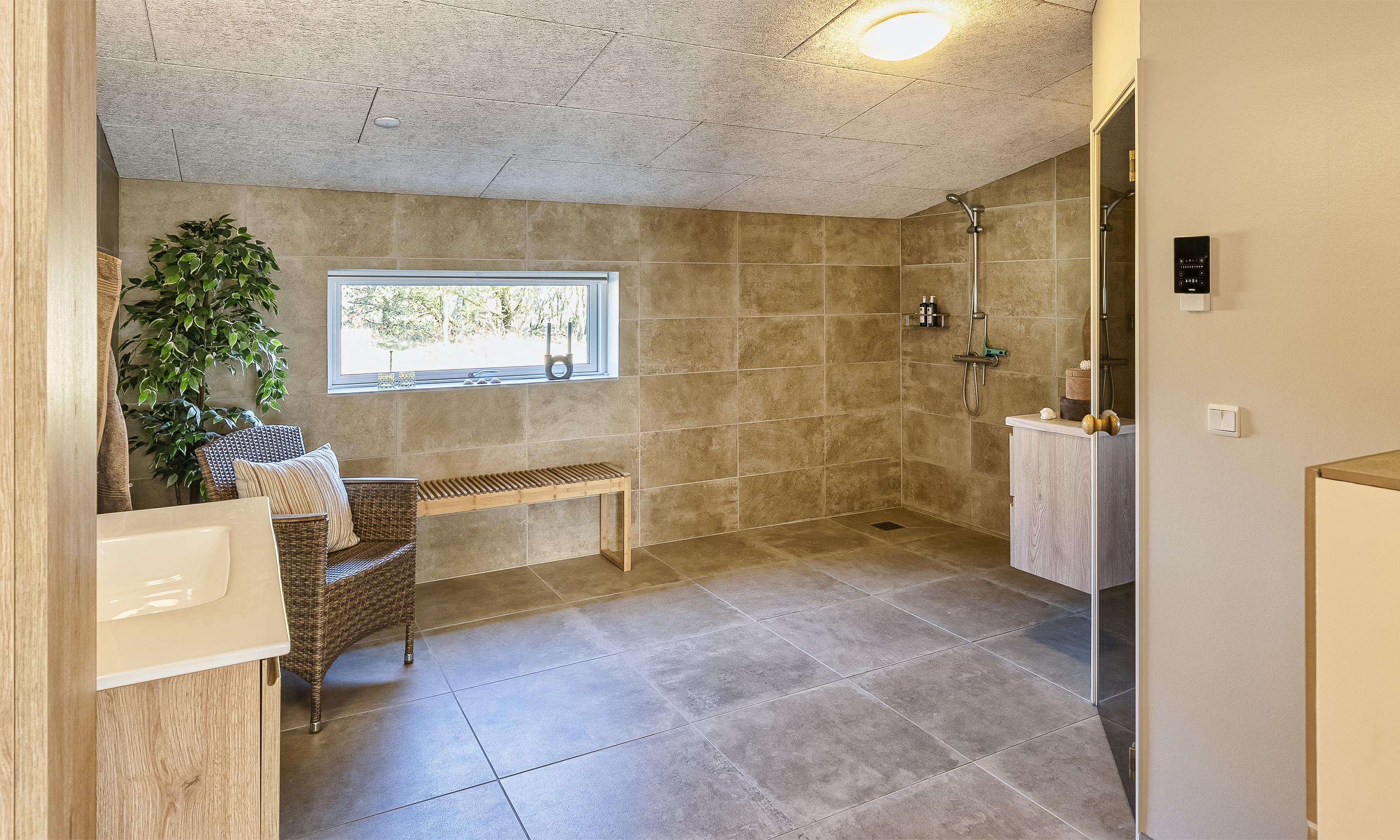 Großes Badezimmer mit Dusche und Sauna.