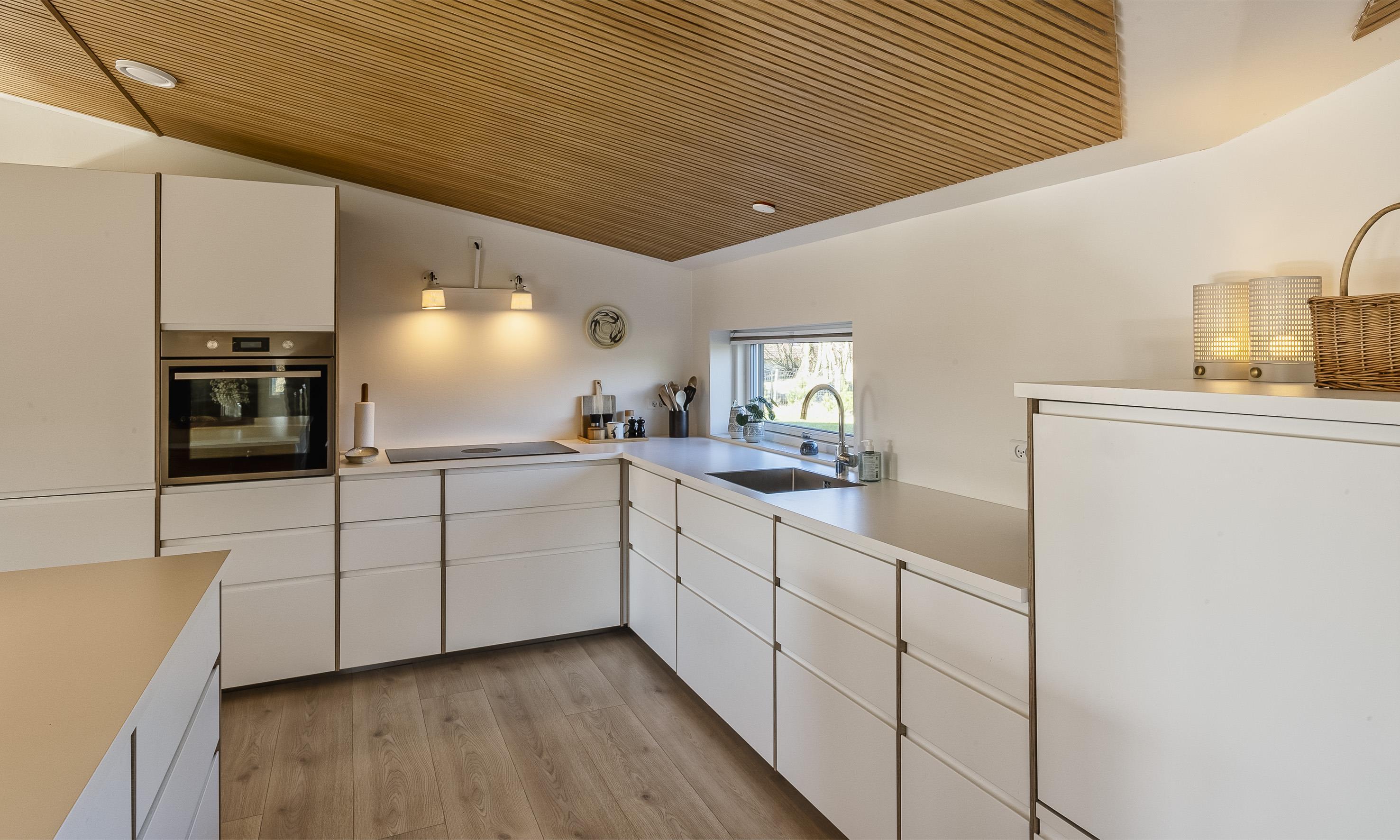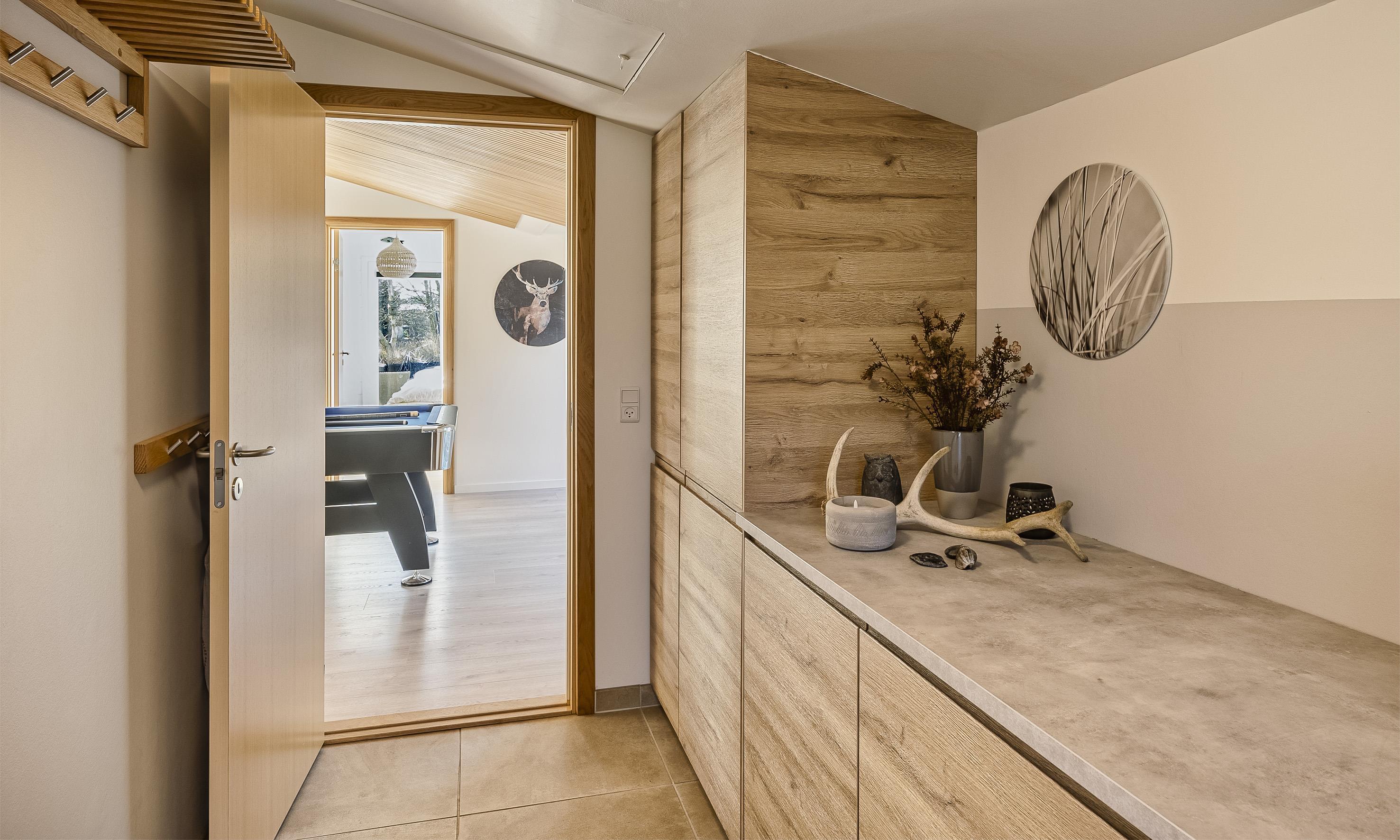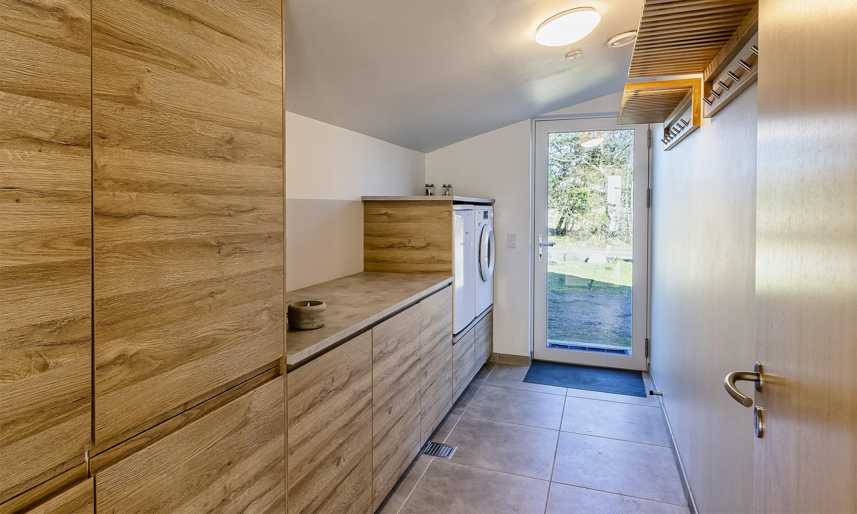 Es bietet einen großen und praktischen Eingangsbereich/Hauswirtschaftsraum mit viel Platz für Jacken und Schuhe, Waschmaschine und Arbeitsplatte.