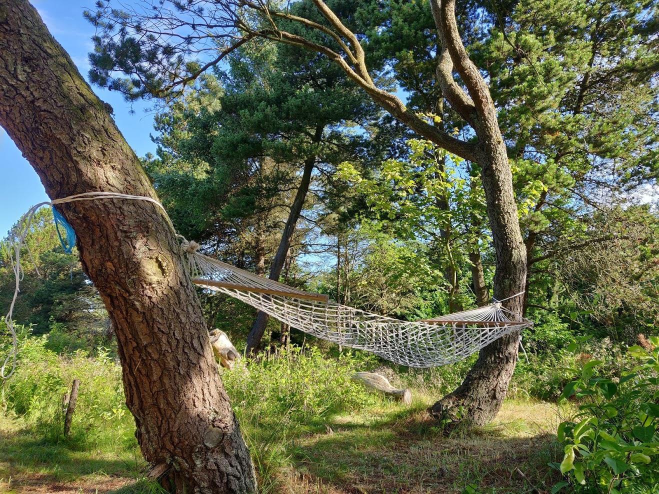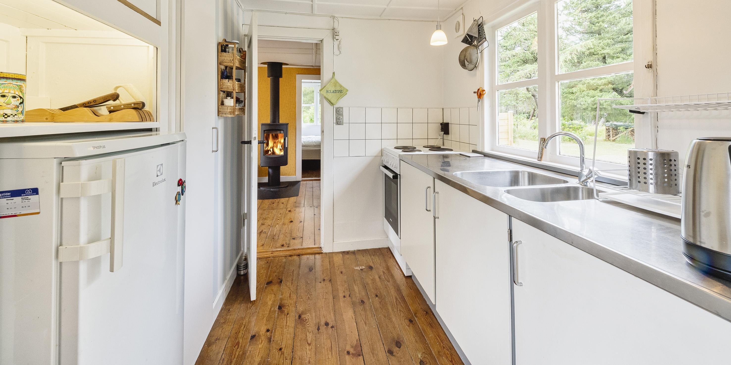 Idyllisch gelegene Waldhütte aus den 60´ern für 4 Personen ausgestattet. Das Ferienhaus trägt den Namen ”Solsikke” und ist für naturverbundene Gäste gedacht, da es in der Ausstattung primitiv und sehr einfach gehalten ist. Das Naturgrundstück ist ca. 2700 qm gross und bietet Ihnen gelegentlich ein nichteinsehbares Grundstück durch die grosszügige Bepflanzung von Bäumen und Büschen. Es liegt am Ende einer Sackgasse. Der Strand ist ca. 2 Km vom Ferienhaus entfernt. Das ganze Ferienhaus, ausser dem Bad und dem Eingangsbereich, ist mit einem Holzfussboden ausgestattet. Im Wohnbereich steht eine Ecktischgruppe mit einem alten Holztisch, ein grosses Klavier, interessant für Musiker, denn das Klavier ist funktionstücktig und einem Kamin. Das Ferienhaus hat kein Fernsehgerät, aber es verfügt über einen Internetanschluss (W-Lan 500/500 Mbit und SafeSurf). Der Kamin ist die Wärmeversorgung im Ferienhaus. Es gibt zwei kleine Schlafbereiche: DB + 3B - mit jeweils einem ¾ Dobbelbett. Ein von die Doppelbetten hat eine zusätzliche Länge von 220 cm. In dem einem Schlafzimmer befindet siche auch zusätzlich ein Etagenbett. Vom Eingangsbereich, gelangen Sie zur linken Seite in die Durchgangsküche. Der Küchenbereich verfügt über einen Herd mit Backofen und einem Kochfeld mit Platten und einem Kühlschrank, der ein kleines Gefrierfach enthält. Eine Kaffemaschine ist auch vorhanden, allerdings gibts hier im Küchenbereich kein warmes Wasser. Zur rechten Seite des Eingangsberiches kommen Sie in das Badezimmer. Badezimmer mit Dusche und Eingangsbereich wurde 2023 renoviert. Die Heizkörper sind elektrische Ölheizkörper. Angrenzend an dem Naturgrundstück haben Sie zwei Zugänge zu dem Fahrrad- und Fussweg von Vejers Strand nach Grærup Strand. Hier fahren keine Autos. Es ist nur ein Wanderweg für Fahrräder und Fussgänger, ideal um die Natur- und Tierwelt auf Ihrem Spaziergang zu beobachten. Auf dem Naturgrundstück befindet sich ein kleiner Schuppen (der ist privat) aber, der einen überdachten Vorbau hat. Hier können Sie geschützt die Sonne und die Ruhe geniessen. Einfach Erholung pur. Der Holzofen dient als Wärmequelle im Ferienhaus, ergänzt durch einen elektrischen Ölradiator. Das Badezimmer mit Dusche und Hauswirtschaftsraum wurden im Jahr 2023 renoviert und mit Luftsolarkollektoren ausgestattet. Es sind keine Haustiere erlaubt. Es stehen Ihnen 2 Parkplätze am Anfang des Grundstückes zur Verfügung. Beim Eingangsbereich befindet sich ein kleiner Terrassenbereich, der auch etwas geschützt durch einen Holzzaun ist.