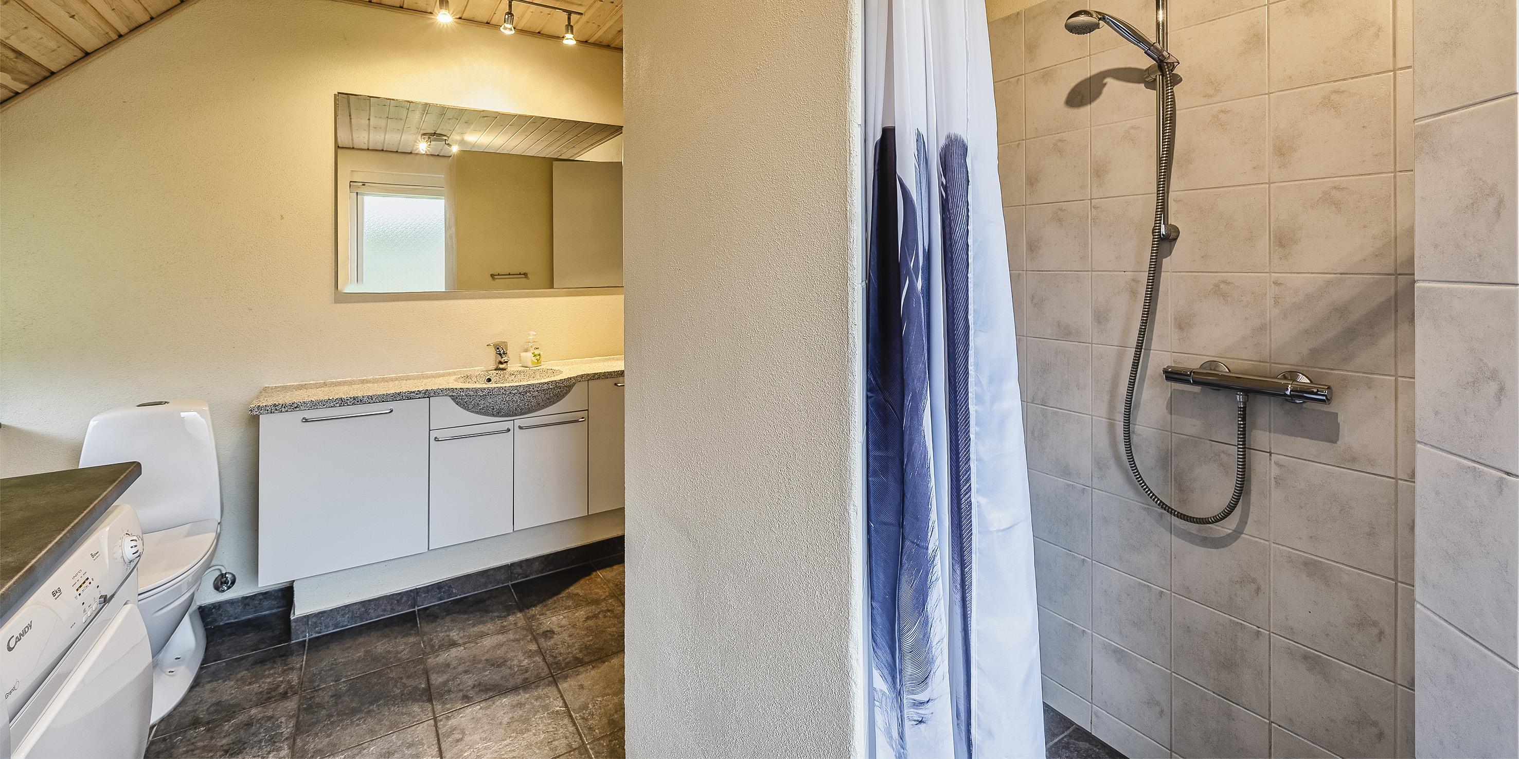 Badezimmer mit Toilette, Dusche und Waschbecken
