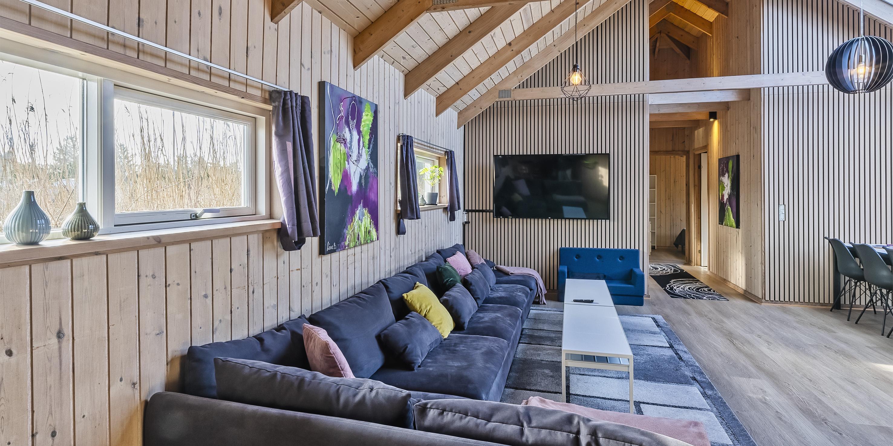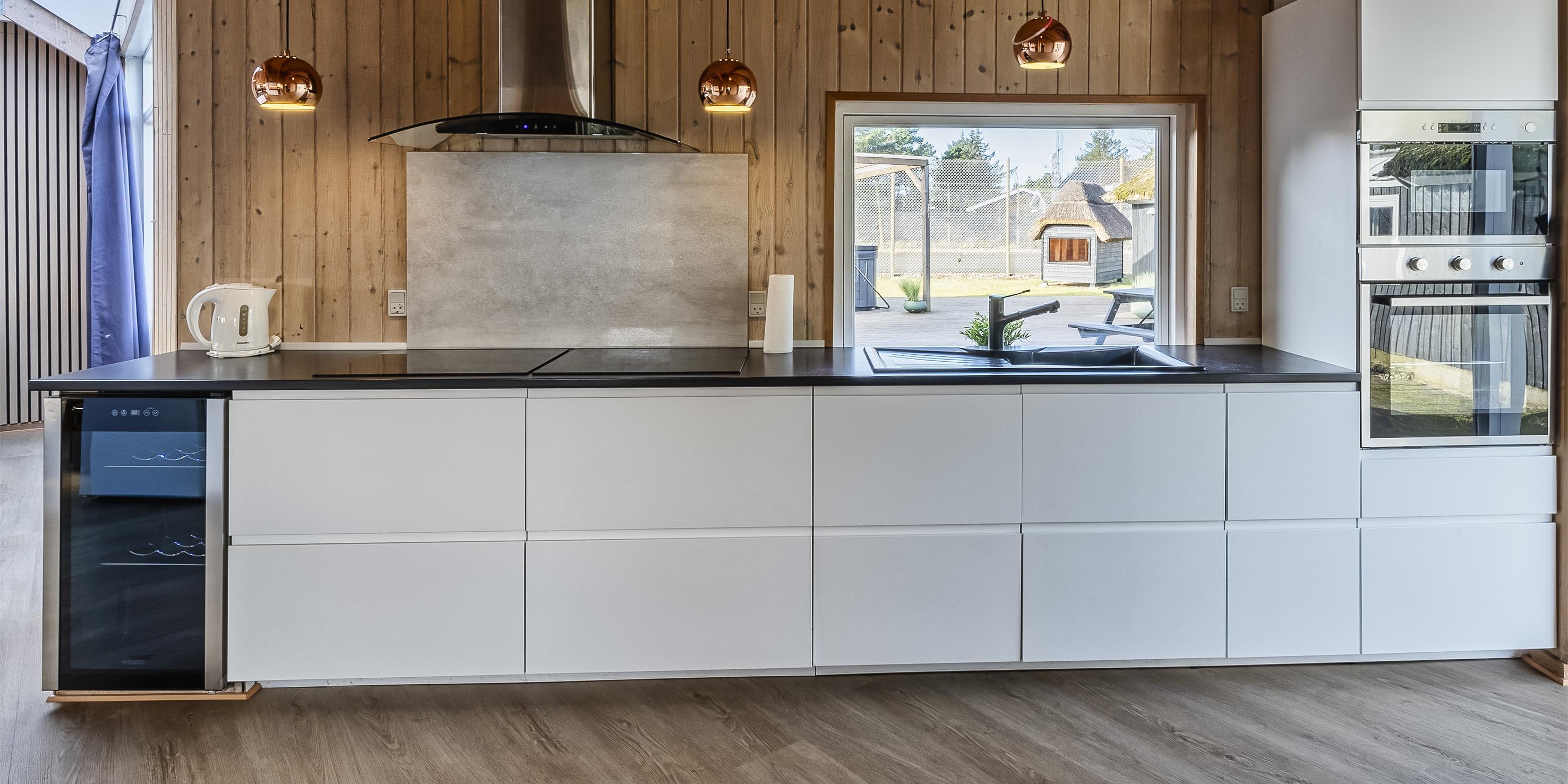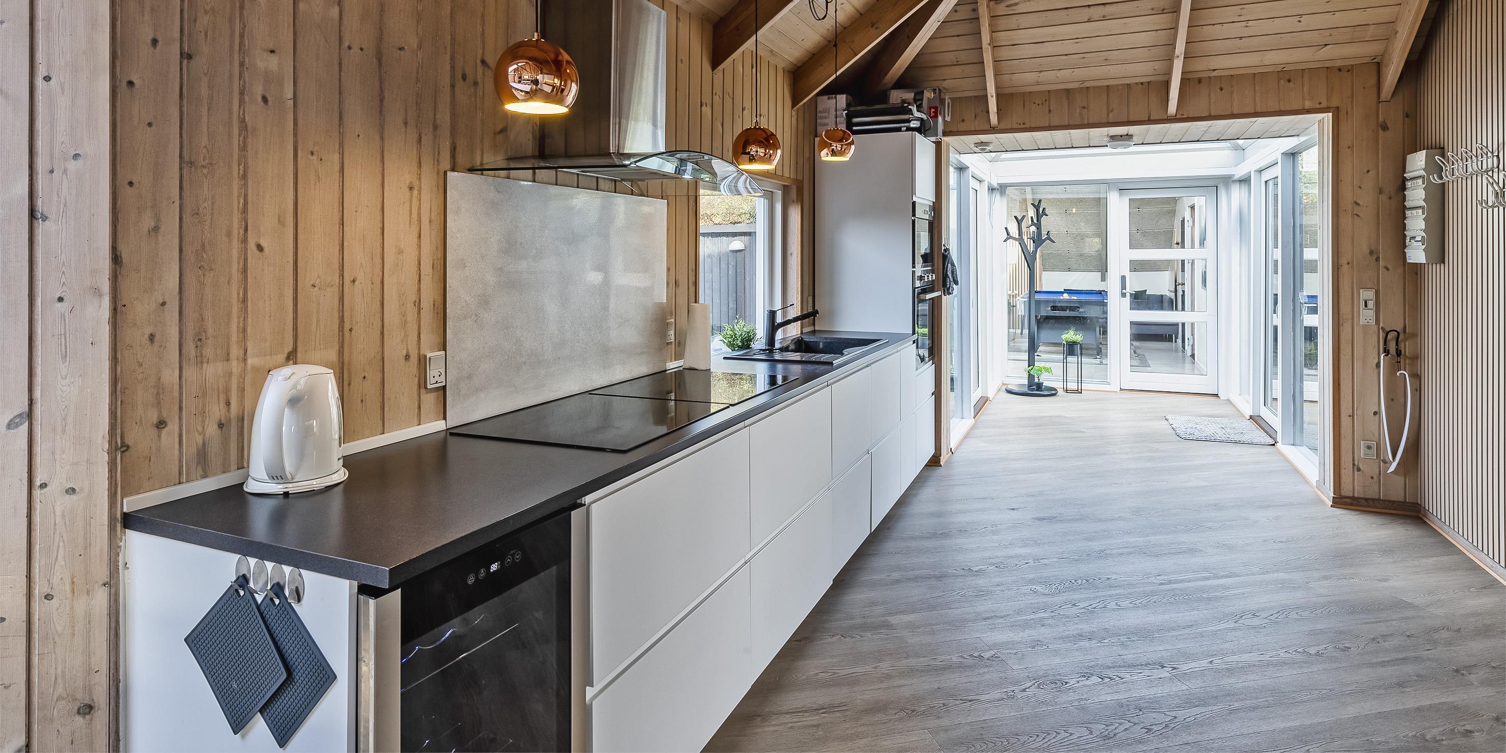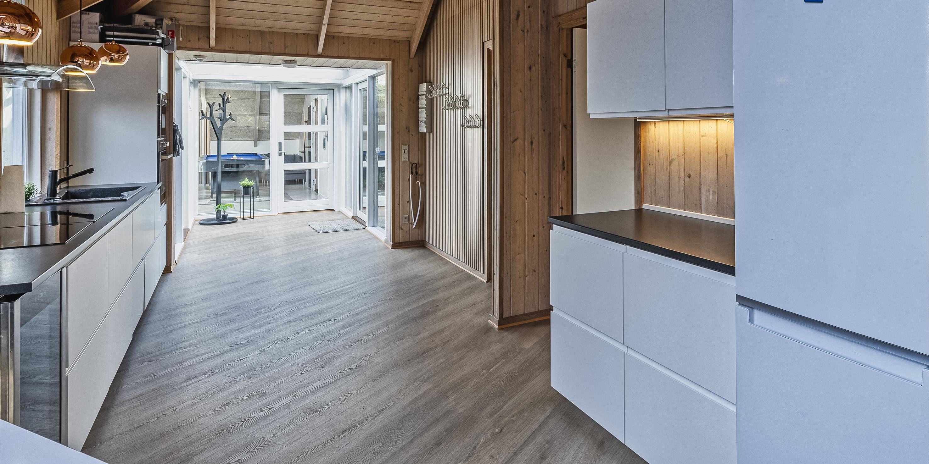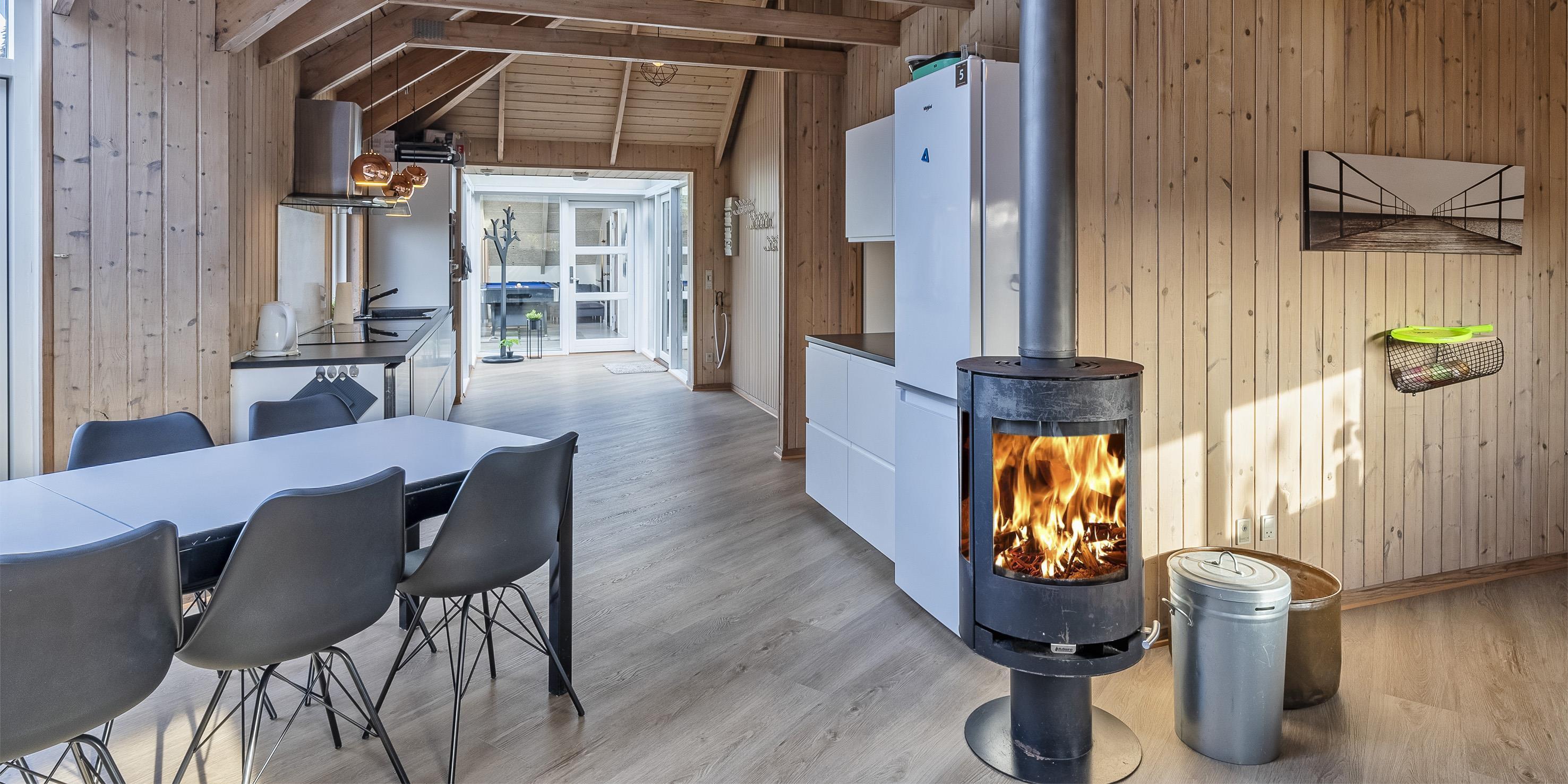 Das Ferienhaus ist 1988 erbaut worden und bekam in 2020 eine totale Renovierung. 8 Schlafzimmer: DB + DB + DB + DB + DB + DB + DB + DB. Bodenbereiche sind mit einer hellen Bodenfliese ausgestattet, bis auf die Schlafräume, die sind mit einem Teppichboden verlegt. Dieses grosse Sommerhaus ist in einem Haupthaus und Nebenhaus aufgeteilt. Im Haupthaus befinden sich fünf der Schlafzimmer und alle sind mit einem Doppelbett ausgestattet. Ebenso ist hier der grosse Wohn- und Essbereich. Dieser ist grosszügig und bietet genügend Sitzmöglichkeiten auf einem gemütlichen Modulsofa an. In der Wohnabteilung ist der Kamin aufgestellt. Dieser gibt der Räumlichkeit einen besonderen Flair. In den Abendstunden kann man dann das Lodern der Flammen beobachten dazu ein Gläschen Wein und in gemütlicher Runde kann dann nach Lust und Laune geplaudert werden. Auf dem grossen Flachbildschirm empfangen Sie auch deutsche Fernsehprogramme, Smart TV und eine Play-Station 3 steht auch bereit. Einen Aussgang zur grossen neuen Holzterrasse haben sie hier vom Wohn- und Essbereich. Es befindet sich eine Warmepumpe im Ferienhaus. Mit dieser Warmepumpe haben sie die Möglichkeit die Stromkosten zu senken, denn die Warmepumpe ist energiesparend. Gegenüber der Sitzmöglichkeit ist der Essbereich. Die zwei Esstische und Stühle befinden sich genau vor der Terrassentür. Hier haben sie einen Aussgang zur schönen neuen Holzterrasse. Durch die grosse Fensterpartie erscheint der Essbereich hell und freundlich. An den beiden Esstischen können alle Gäste auf einmal Ihr Mittagessen geniessen. Angrenzend zum Wohn- und Essbereich befindet sich dann der offene Küchenbereich. Die Küche verfügt über eine moderne Einbauküche, die keine Wünsche übrig lässt. Sie ist mit einem Induktionsherd, einem Backofen in arbeitshöhe, einer Mikrowelle, einer Geschrirrspülmaschine und einer Kühl- und Gefrierrkombination ausgestattet. Desweiteren befindet sich ein kleiner separater Getränkekühlschrank am Ende der Einbauküche. Ein neues Badezimmer mit Fussbodenheizung befindet sich in den Bereichen der Schlafzimmer. Dieses ist mit einem WC, einem Handwaschbecken und einer Dusche ausgestattet. Auch der Fussboden des Wohn- und Essbereichs, samt der Küchenbereich ist mit einer Fussbodenheizung verlegt worden.