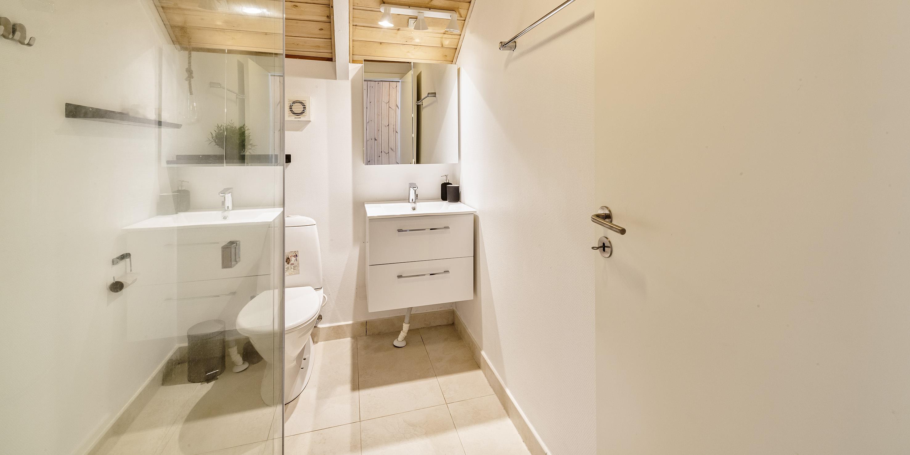 Badezimmer mit Toilette, Dusche und Waschbecken