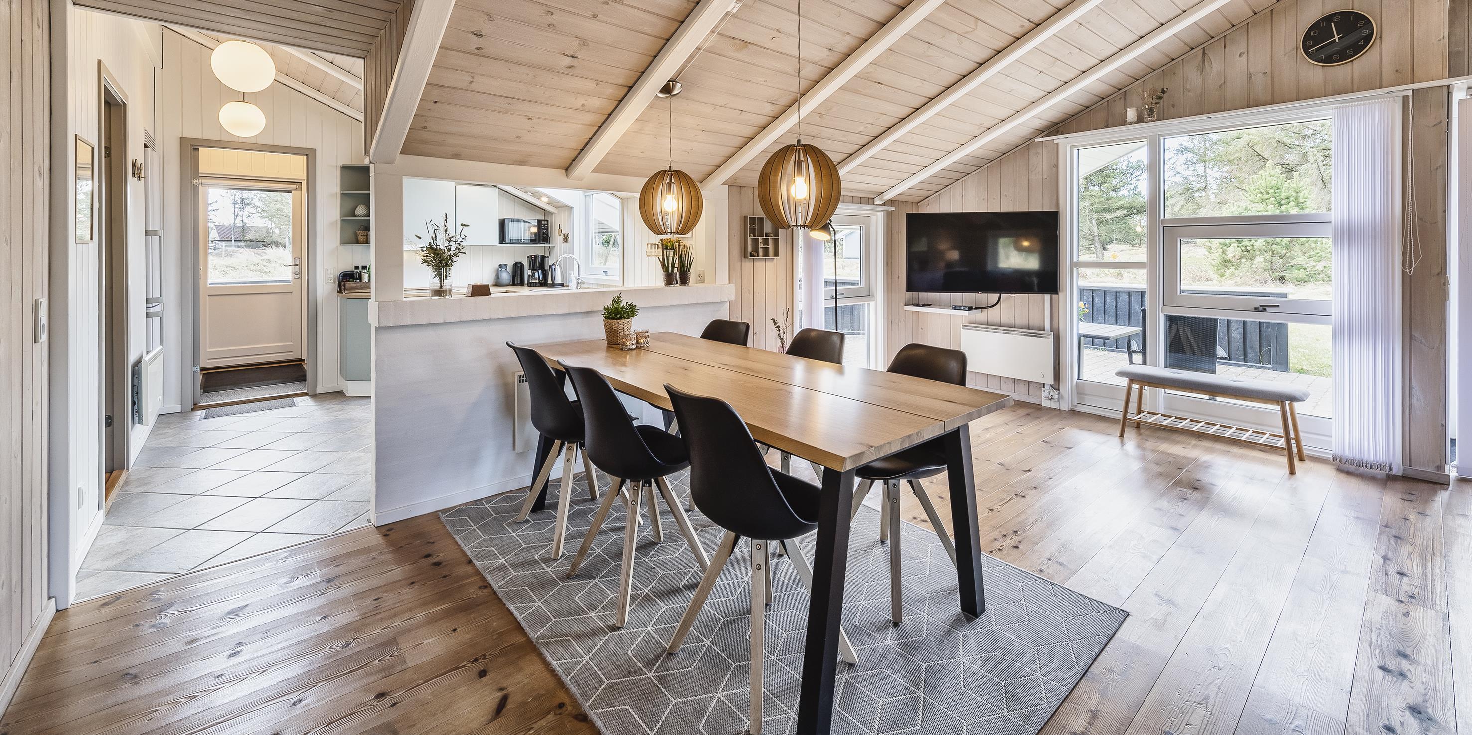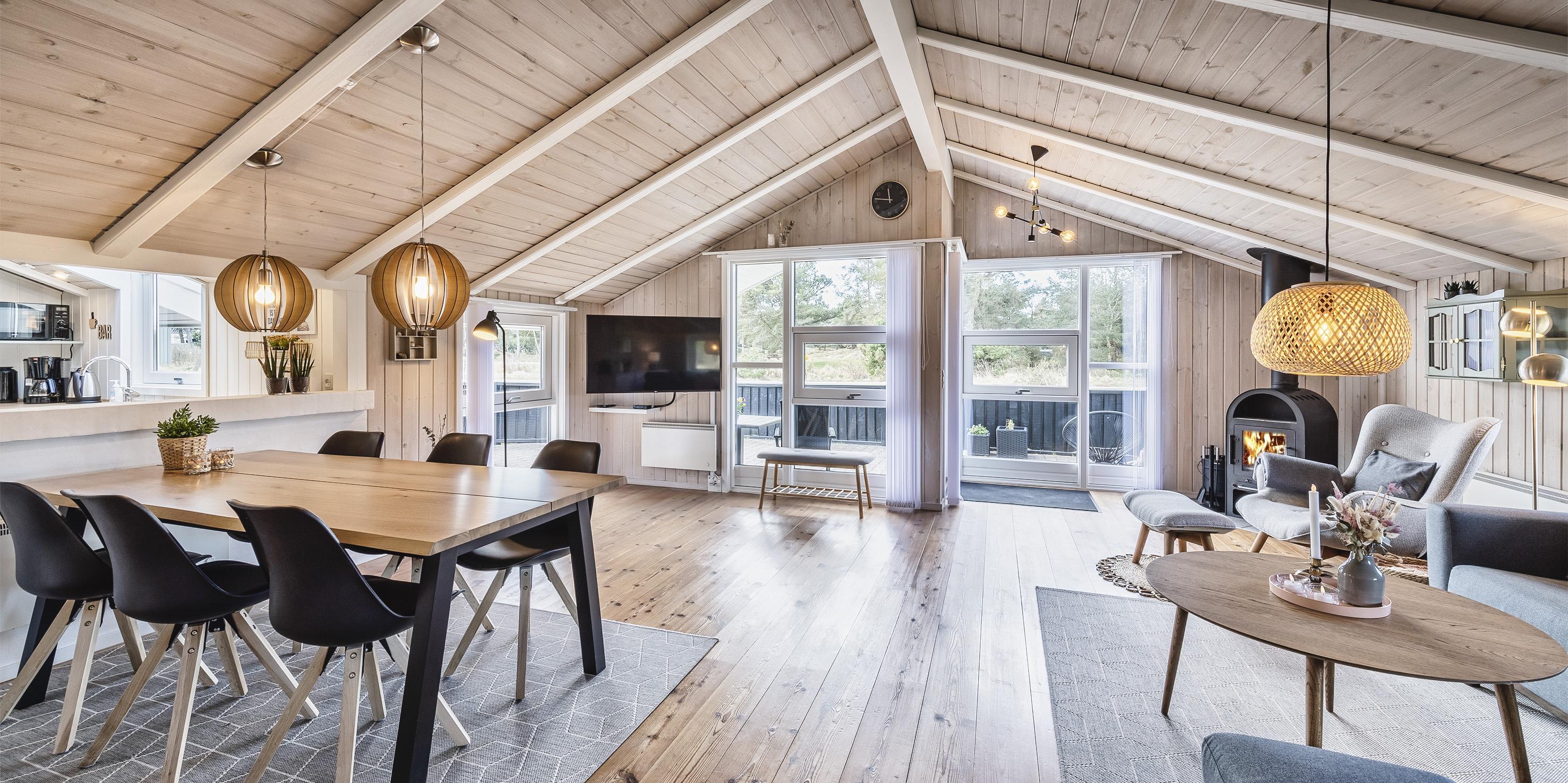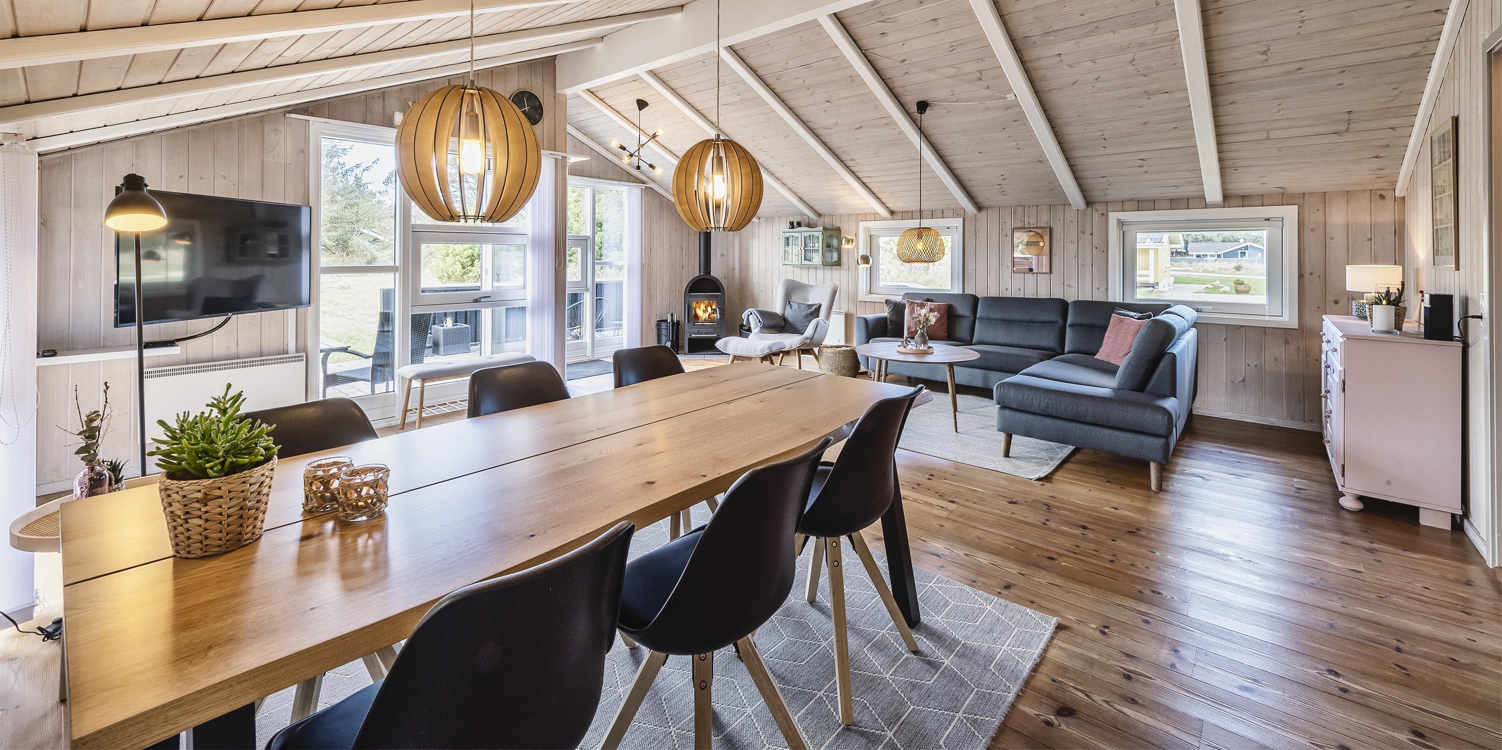 Wunderschönes und geschmackvoll eingerichtetes Ferienhaus auf einem großen offenen Grundstück gelegen. Hier zum Grundstück kommen oftmals die Rehe und Hirsche zu den Ferienhäusern und lieben es von den Gästen mit Obst und Gemüse verwöhnt zu werden. Das Ferienhaus ist für 6 Personen ausgestattet und der Strand liegt ca. 1,5 Km vom Ferienhaus entfernt. Der Wohn- und Essbereich ist mit einem hübschen Holzfußboden ausgestattet. Ein Kamin sorgt für angenehme Wärme und die dänische Gemütlichkeit. Das deutsche Fernsehprogramm empfangen Sie über eine Parabolantenne. Chromecast und Radio. Der Küchenbereich ist zum Essbereich hin offen gehalten und verfügt über einen Herd mit Cerankochfeld, einem Backofen, einer Geschirrspülmaschine, eine Kühl- und Gefrierrkombination und einer Mikrowelle. Über dem Handwaschbecken befindet sich ein Oberlicht und eine Fussbadenheizung befindet sich ebenfalls im Küchenbereich. Von hier strahlt viel Helligkeit in den Bereich. Es gibt ein Gästebad mit einem WC und einem Handwaschbecken. Das normale große Badezimmer verfügt über ein WC, ein Handwaschbecken, eine Dusche, eine Sauna und einen Whirlpool. Eine Waschmaschine und ein Trockner stehen im Hause zur Benutzung bereit. Es gibt insgesamt drei Schlafzimmer im Ferienhaus: DS + DS + 2S. In allen Schalfzimmern gibt es neue Continentalbetten. Zwei Schlafzimmer verfügen über je einem Doppelbett und das Dritte verfügt über zwei Einzelbetten. Auf der großen teilweise geschlossenen Terrasse bieten sich viele Möglichkeiten an, wie zum Beispiel Platz für einen Liegestuhl um Ihr Sonnenbad zu geniessen. Es steht den Gästen ein Weber-Kohlegrill zur Verfügung. Bitte nach dem Gebrauch gereinigt wieder zurückstellen. Das Ferienhaus verfügt über einen Internetanschluss (W-Lan). Es sind keine Haustiere erlaubt. Rauchen ist nicht erlaubt! Auf dem Grundstück befindet sich ein Schaukelstativ und einen Sandkasten für die kleinen Gäste. Das Ferienhaus wurde 2000 erbaut.