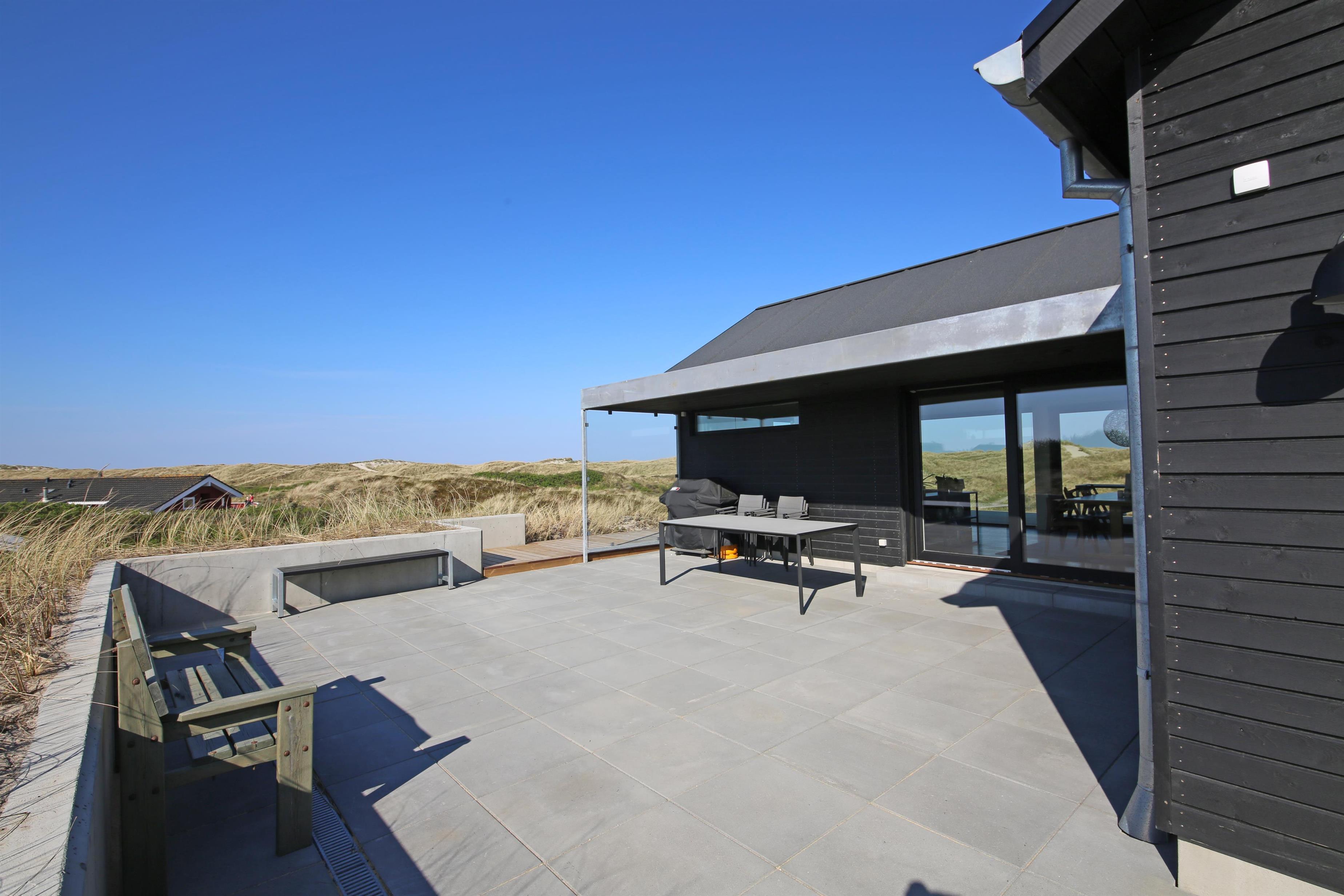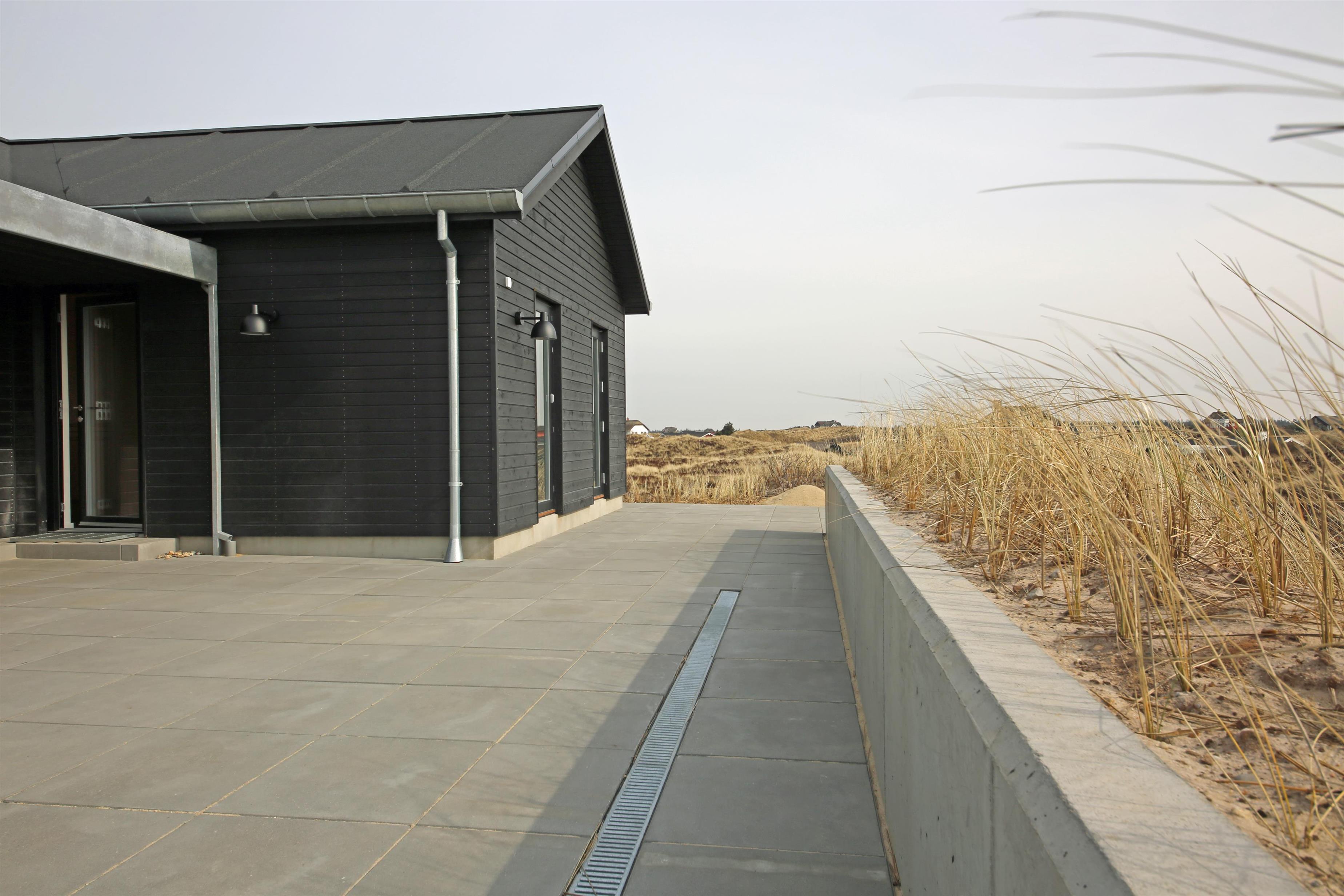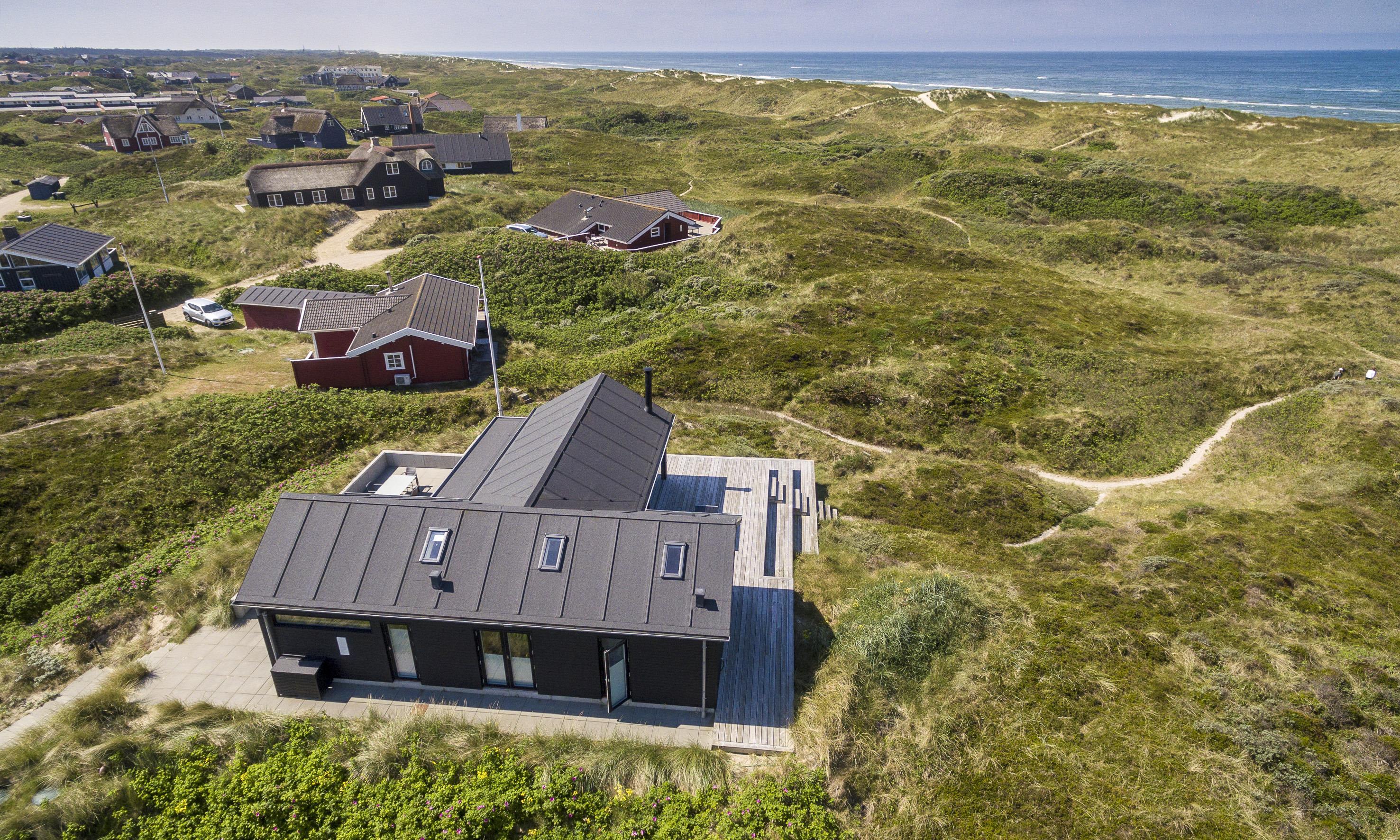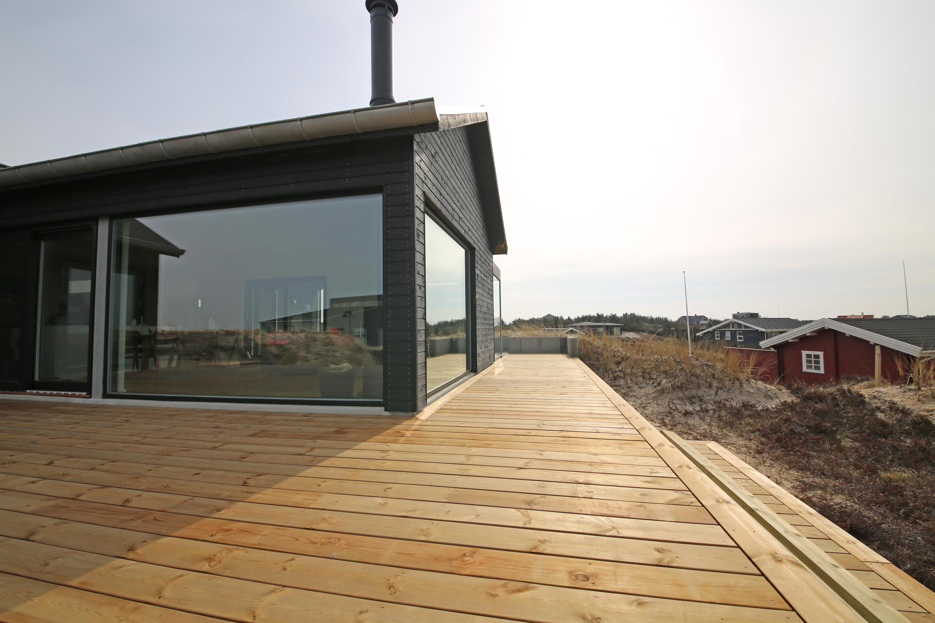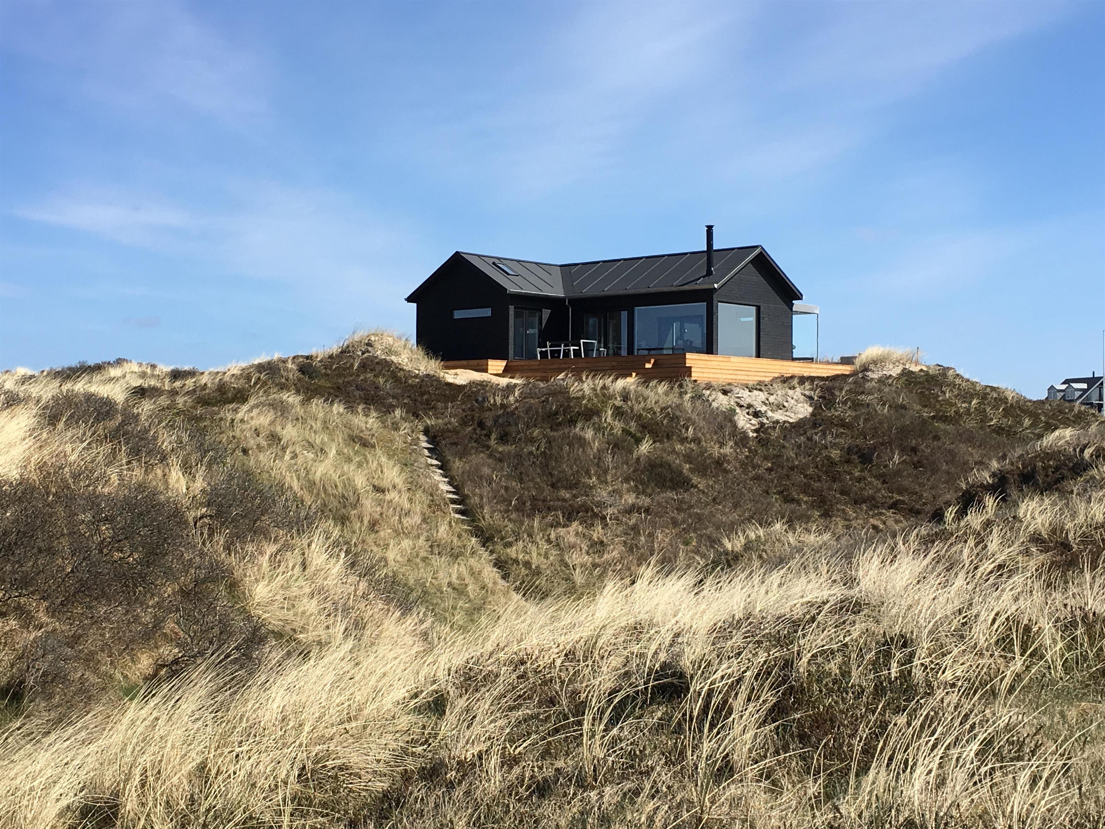 Neubauferienhaus/Energiesparhaus in bevorzugter Wohngegend von Vejers Strand, auf einer Düne gelegen und mit Panoramablick Richtung Meer. Das Ferienhaus ist für 6 Personen ausgestattet und sehr modern eingerichtet. Über die Dünenkette gelangen Sie auf direktem Wege zum Strand, der nur ”Sage und Schreibe” 100 Meter entfernt ist. Der Wohnbereich ist mit dem Essbereich und der Küche verbunden und komplett offen gehalten. Das komplette Ferienhaus ist hell und freundlich gestaltet. Zwischen zwei großen Fensterfronten befindet sich der Kamin. Der Blick auf den gezündeten Kamin von der Sitzgruppe und aus den Fenstern ist einfach nur traumhaft, besser kann es nicht sein. Das deutsche Fernsehprogramm empfangen Sie über Stofa, daher sind es nur 5-8 Kanäle die Sie empfangen können. Google Chromecast. Eine Playstation 4 steht für die Bewohner des Hauses zur Verfügung. Die Küche beinhaltet einen Herd mit Cerankochfeld, einen Backofen in Arbeitshöhe, eine Geschirrspülmaschine, einer Mikrowelle und einer Kühl- und Gefrierkombination. Der Essbereich ist großzügig und bietet ausreichend Platz für alle an. Das gesamte Ferienhaus ist mit einem Laminatfußboden ausgestattet, außer die Bereiche der Bäder, Küche und des Eingangsbereich, diese sind gefliest. Eine Fußbodenheizung ist im ganzen Ferienhaus verlegt. Es gibt zwei Bäder im Ferienhaus. Beide sind mit je einem WC, einem Handwaschbecken und einer Dusche ausgestattet. Sie finden insgesamt drei Schlafzimmer im Haus: DB + DB + 2B. Eine schöne große Terrasse führt rund ums Haus, teilweise ist es eine Holzterrasse und teilweise mit Steinfliesen verlegt, wobei auch ein kleiner Teil direkt am Ferienhaus überdacht ist. Ein Gasgrill steht zur Benutzung zur Verfügung. Für Gas muss der Mieter selbser sorgen. Das Ferienhaus verfügt über einen Internetanschluss (W-Lan). Desweiteren stehen eine Waschmaschine und ein Trockner zur Verfügung, ebenfalls ein kleiner Schuppen. Das Rauchen im Ferienhaus ist nicht erlaubt. Es sind keine Haustiere erlaubt. Das Ferienhaus ist in 2016 erbaut worden.