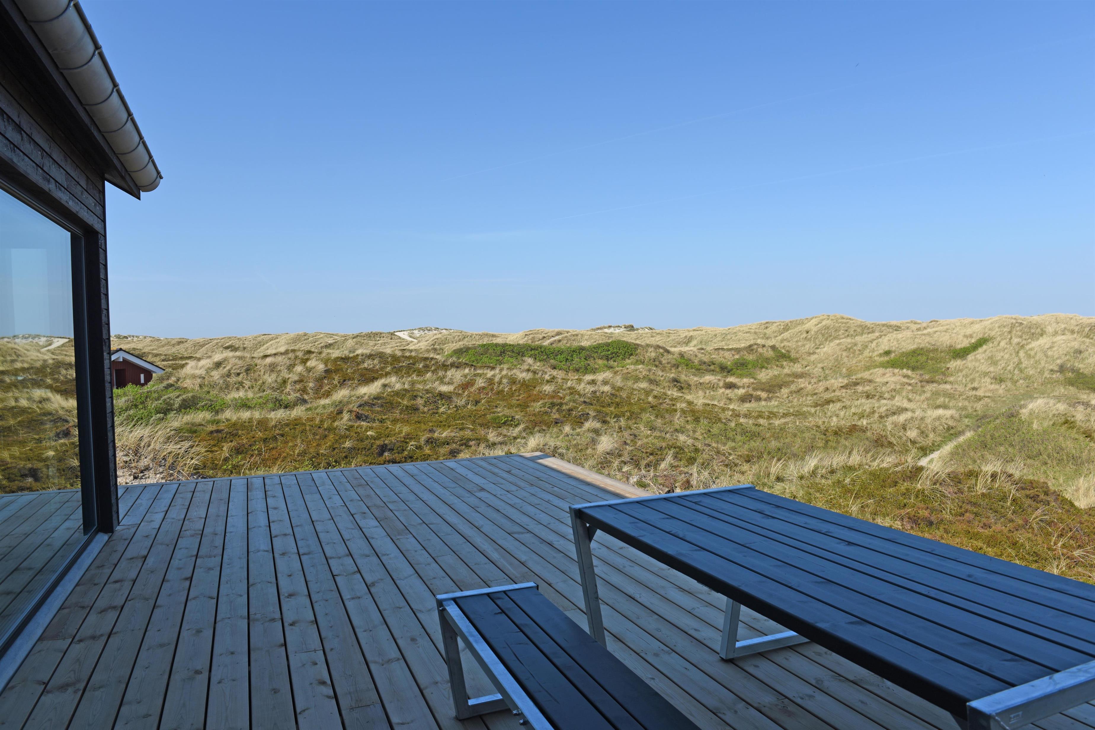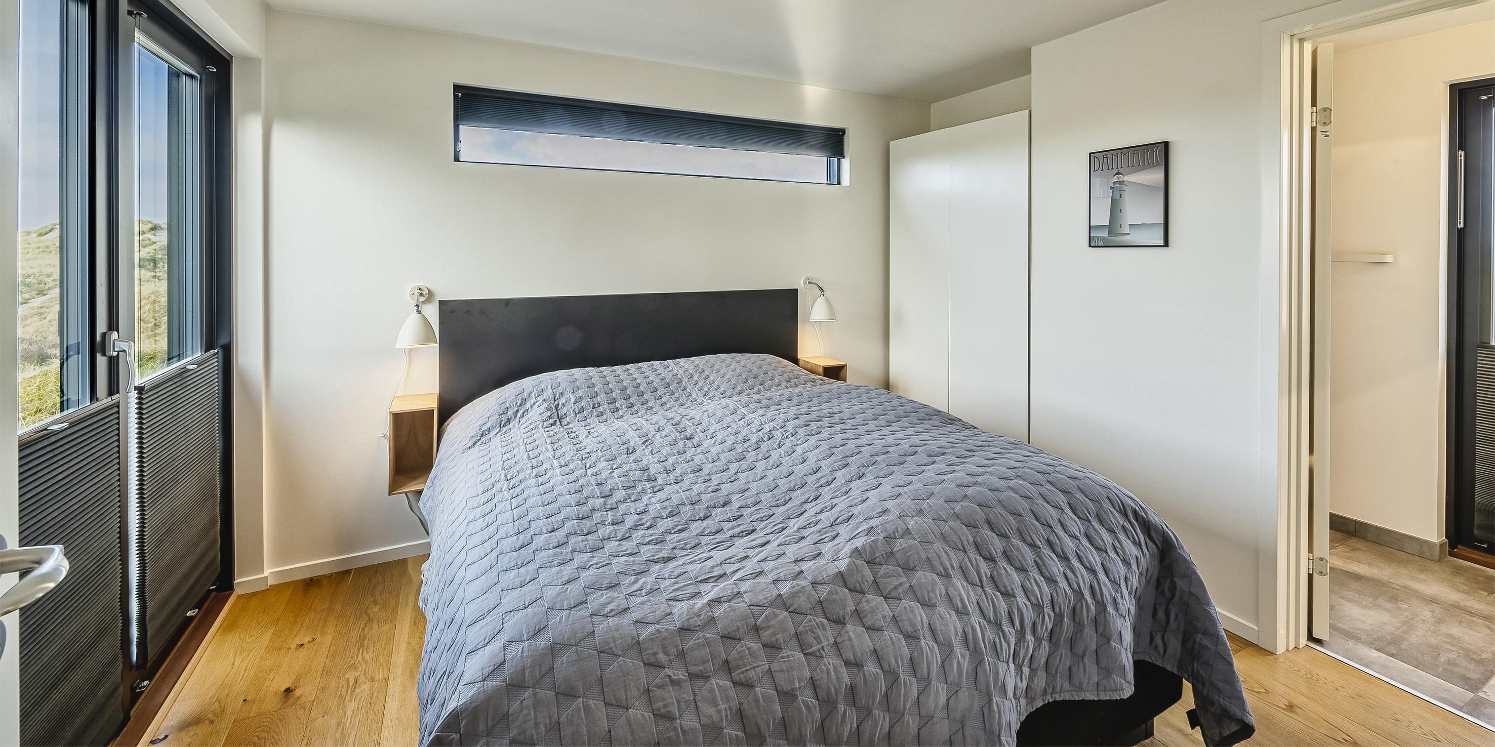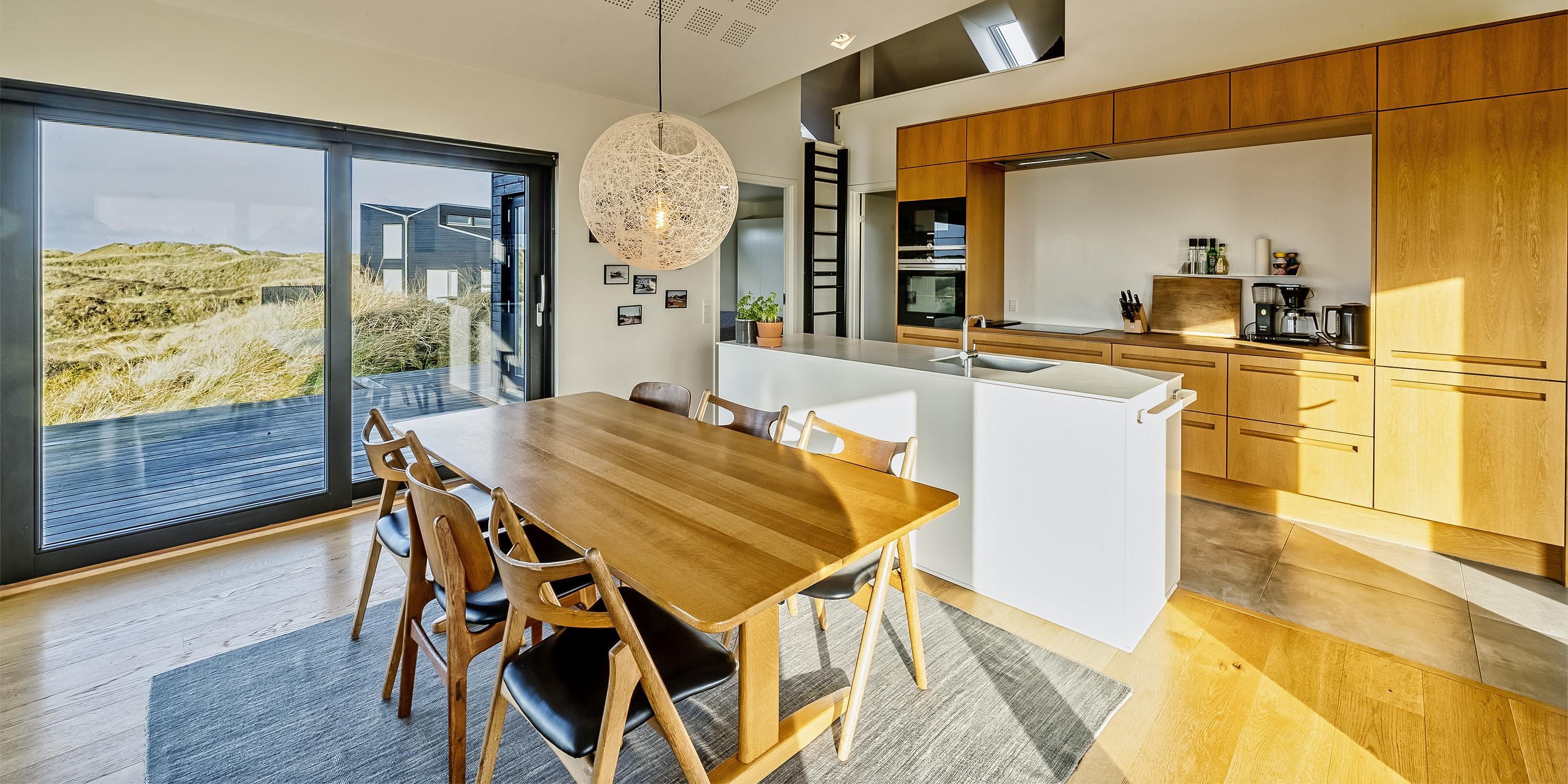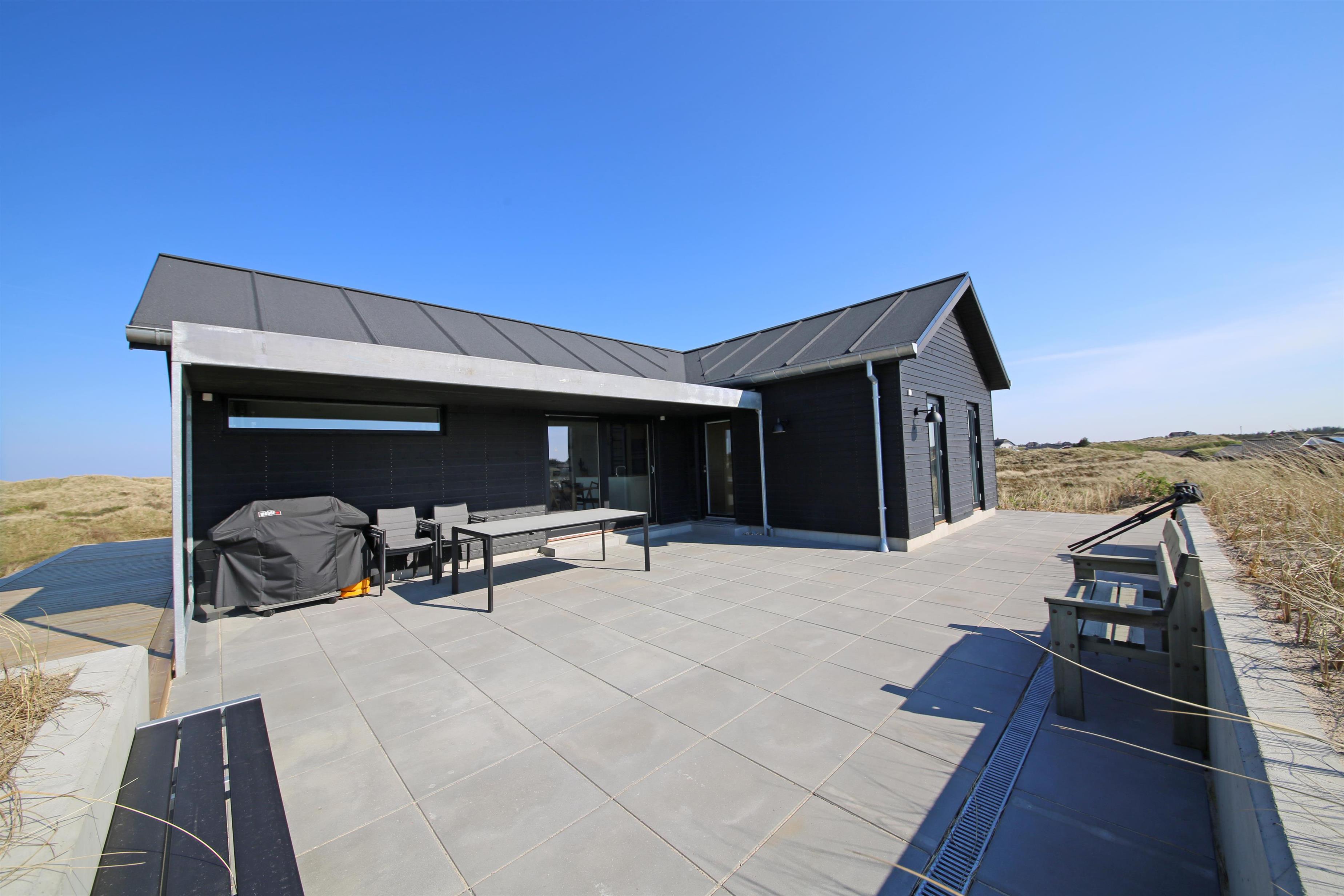 Neubauferienhaus/Energiesparhaus in bevorzugter Wohngegend von Vejers Strand, auf einer Düne gelegen und mit Panoramablick Richtung Meer. Das Ferienhaus ist für 6 Personen ausgestattet und sehr modern eingerichtet. Über die Dünenkette gelangen Sie auf direktem Wege zum Strand, der nur ”Sage und Schreibe” 100 Meter entfernt ist. Der Wohnbereich ist mit dem Essbereich und der Küche verbunden und komplett offen gehalten. Das komplette Ferienhaus ist hell und freundlich gestaltet. Zwischen zwei großen Fensterfronten befindet sich der Kamin. Der Blick auf den gezündeten Kamin von der Sitzgruppe und aus den Fenstern ist einfach nur traumhaft, besser kann es nicht sein. Das deutsche Fernsehprogramm empfangen Sie über Stofa, daher sind es nur 5-8 Kanäle die Sie empfangen können. Google Chromecast. Eine Playstation 4 steht für die Bewohner des Hauses zur Verfügung. Die Küche beinhaltet einen Herd mit Cerankochfeld, einen Backofen in Arbeitshöhe, eine Geschirrspülmaschine, einer Mikrowelle und einer Kühl- und Gefrierkombination. Der Essbereich ist großzügig und bietet ausreichend Platz für alle an. Das gesamte Ferienhaus ist mit einem Laminatfußboden ausgestattet, außer die Bereiche der Bäder, Küche und des Eingangsbereich, diese sind gefliest. Eine Fußbodenheizung ist im ganzen Ferienhaus verlegt. Es gibt zwei Bäder im Ferienhaus. Beide sind mit je einem WC, einem Handwaschbecken und einer Dusche ausgestattet. Sie finden insgesamt drei Schlafzimmer im Haus: DB + DB + 2B. Eine schöne große Terrasse führt rund ums Haus, teilweise ist es eine Holzterrasse und teilweise mit Steinfliesen verlegt, wobei auch ein kleiner Teil direkt am Ferienhaus überdacht ist. Ein Gasgrill steht zur Benutzung zur Verfügung. Für Gas muss der Mieter selbser sorgen. Das Ferienhaus verfügt über einen Internetanschluss (W-Lan). Desweiteren stehen eine Waschmaschine und ein Trockner zur Verfügung, ebenfalls ein kleiner Schuppen. Das Rauchen im Ferienhaus ist nicht erlaubt. Es sind keine Haustiere erlaubt. Das Ferienhaus ist in 2016 erbaut worden.