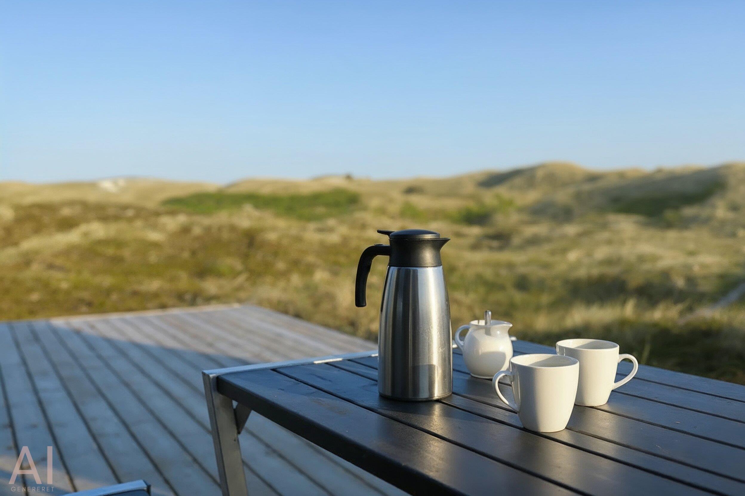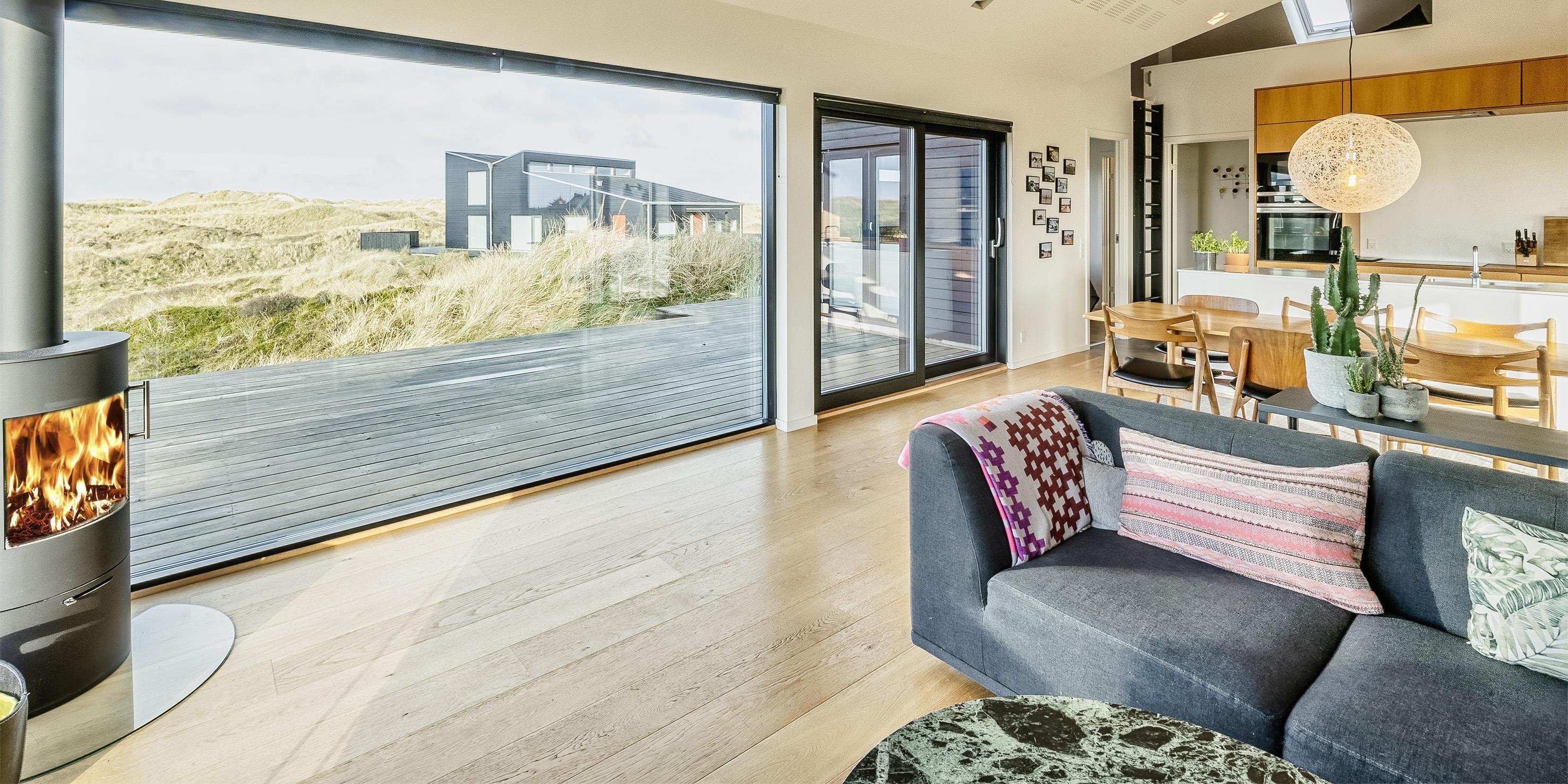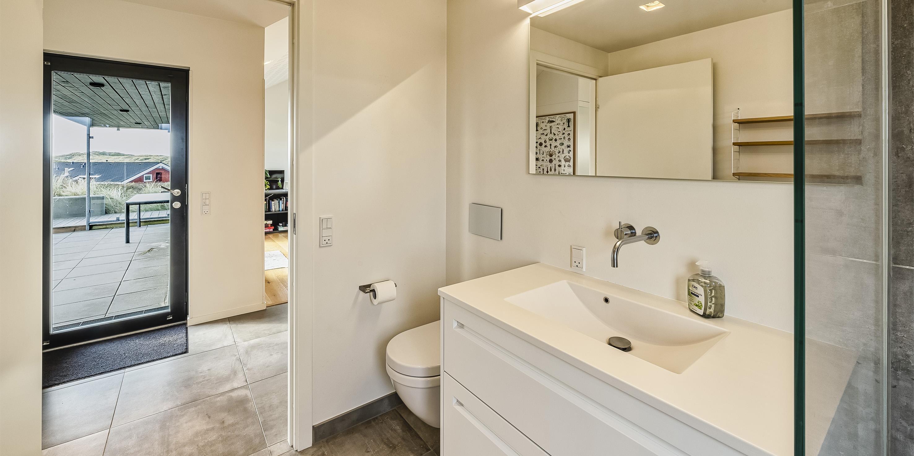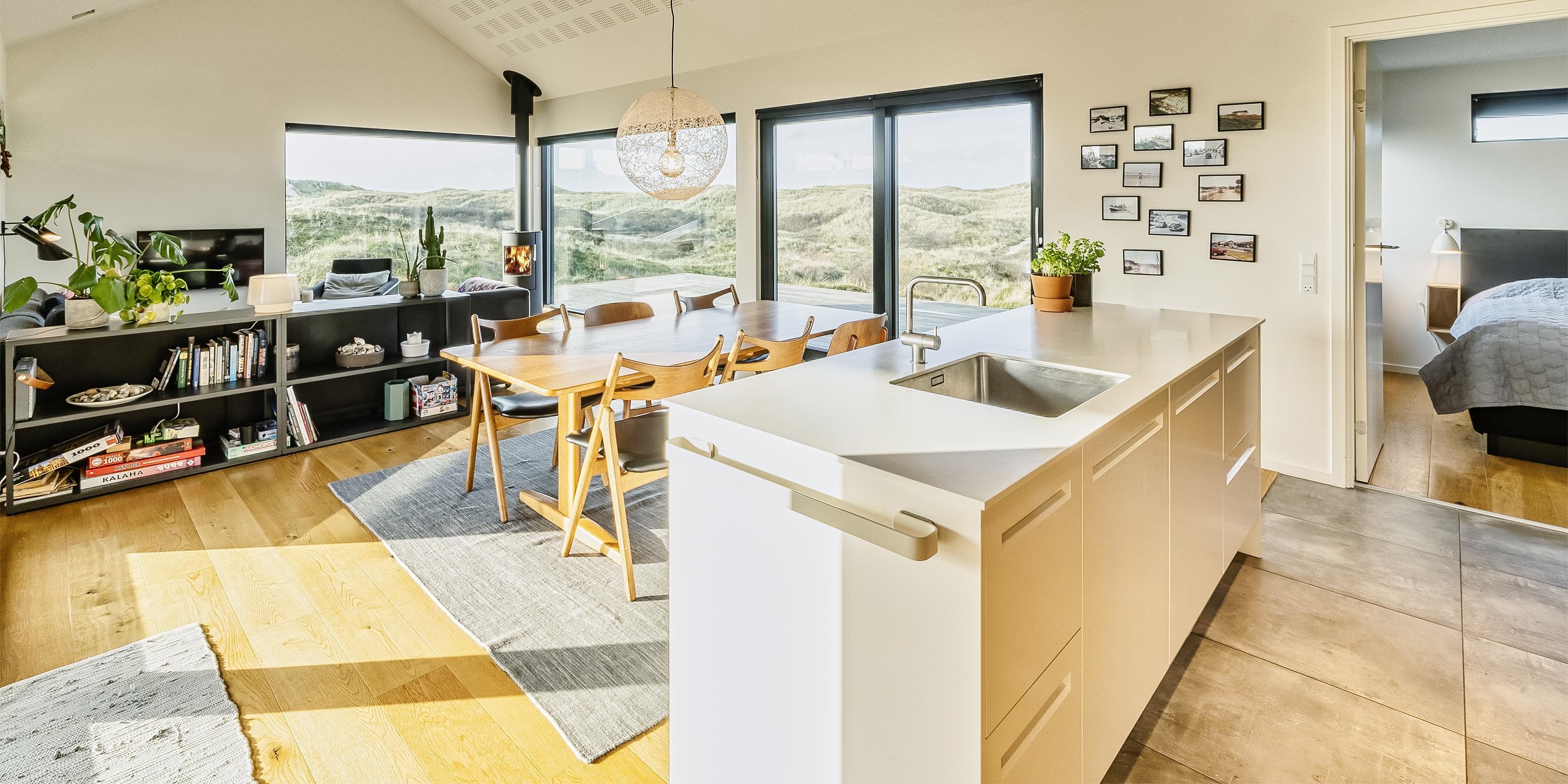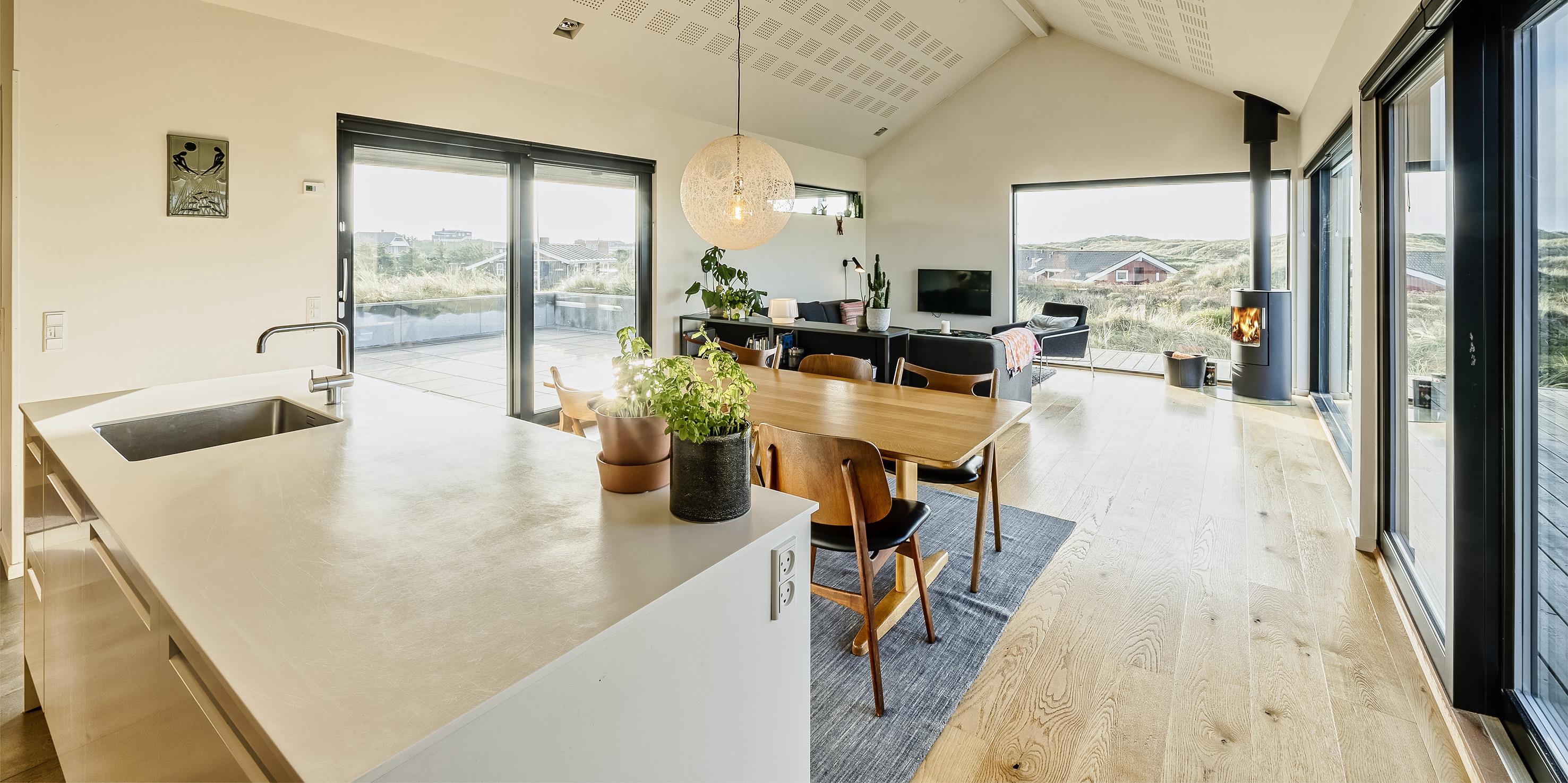 Neubauferienhaus/Energiesparhaus in bevorzugter Wohngegend von Vejers Strand, auf einer Düne gelegen und mit Panoramablick Richtung Meer. Das Ferienhaus ist für 6 Personen ausgestattet und sehr modern eingerichtet. Über die Dünenkette gelangen Sie auf direktem Wege zum Strand, der nur ”Sage und Schreibe” 100 Meter entfernt ist. Der Wohnbereich ist mit dem Essbereich und der Küche verbunden und komplett offen gehalten. Das komplette Ferienhaus ist hell und freundlich gestaltet. Zwischen zwei großen Fensterfronten befindet sich der Kamin. Der Blick auf den gezündeten Kamin von der Sitzgruppe und aus den Fenstern ist einfach nur traumhaft, besser kann es nicht sein. Das deutsche Fernsehprogramm empfangen Sie über Stofa, daher sind es nur 5-8 Kanäle die Sie empfangen können. Google Chromecast. Eine Playstation 4 steht für die Bewohner des Hauses zur Verfügung. Die Küche beinhaltet einen Herd mit Cerankochfeld, einen Backofen in Arbeitshöhe, eine Geschirrspülmaschine, einer Mikrowelle und einer Kühl- und Gefrierkombination. Der Essbereich ist großzügig und bietet ausreichend Platz für alle an. Das gesamte Ferienhaus ist mit einem Laminatfußboden ausgestattet, außer die Bereiche der Bäder, Küche und des Eingangsbereich, diese sind gefliest. Eine Fußbodenheizung ist im ganzen Ferienhaus verlegt. Es gibt zwei Bäder im Ferienhaus. Beide sind mit je einem WC, einem Handwaschbecken und einer Dusche ausgestattet. Sie finden insgesamt drei Schlafzimmer im Haus: DB + DB + 2B. Eine schöne große Terrasse führt rund ums Haus, teilweise ist es eine Holzterrasse und teilweise mit Steinfliesen verlegt, wobei auch ein kleiner Teil direkt am Ferienhaus überdacht ist. Ein Gasgrill steht zur Benutzung zur Verfügung. Für Gas muss der Mieter selbser sorgen. Das Ferienhaus verfügt über einen Internetanschluss (W-Lan). Desweiteren stehen eine Waschmaschine und ein Trockner zur Verfügung, ebenfalls ein kleiner Schuppen. Das Rauchen im Ferienhaus ist nicht erlaubt. Es sind keine Haustiere erlaubt. Das Ferienhaus ist in 2016 erbaut worden.