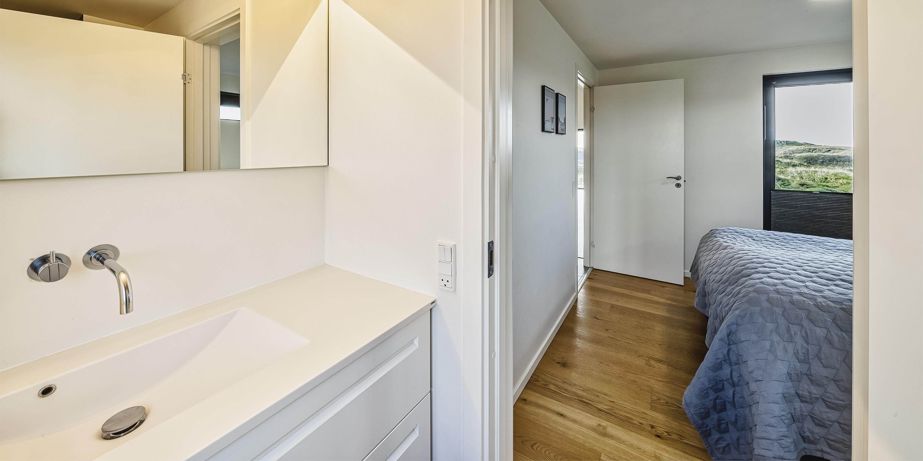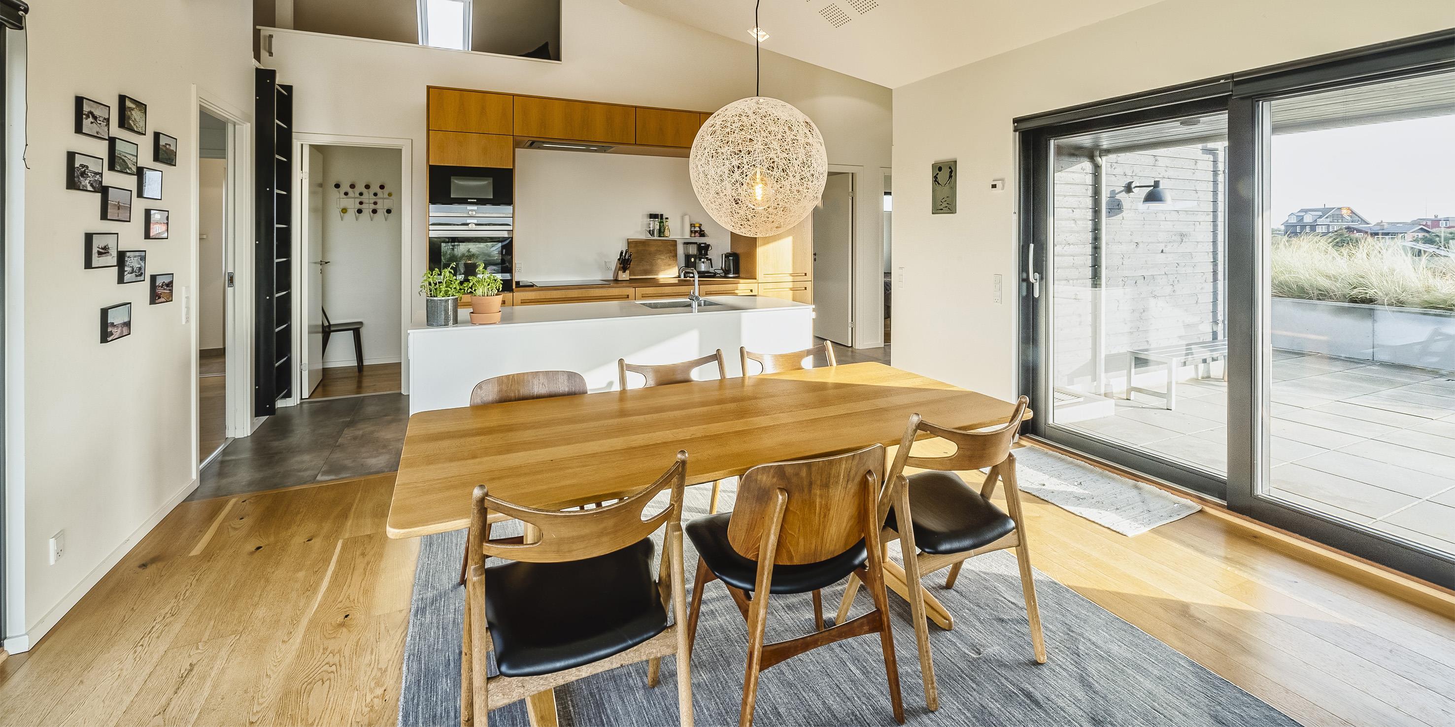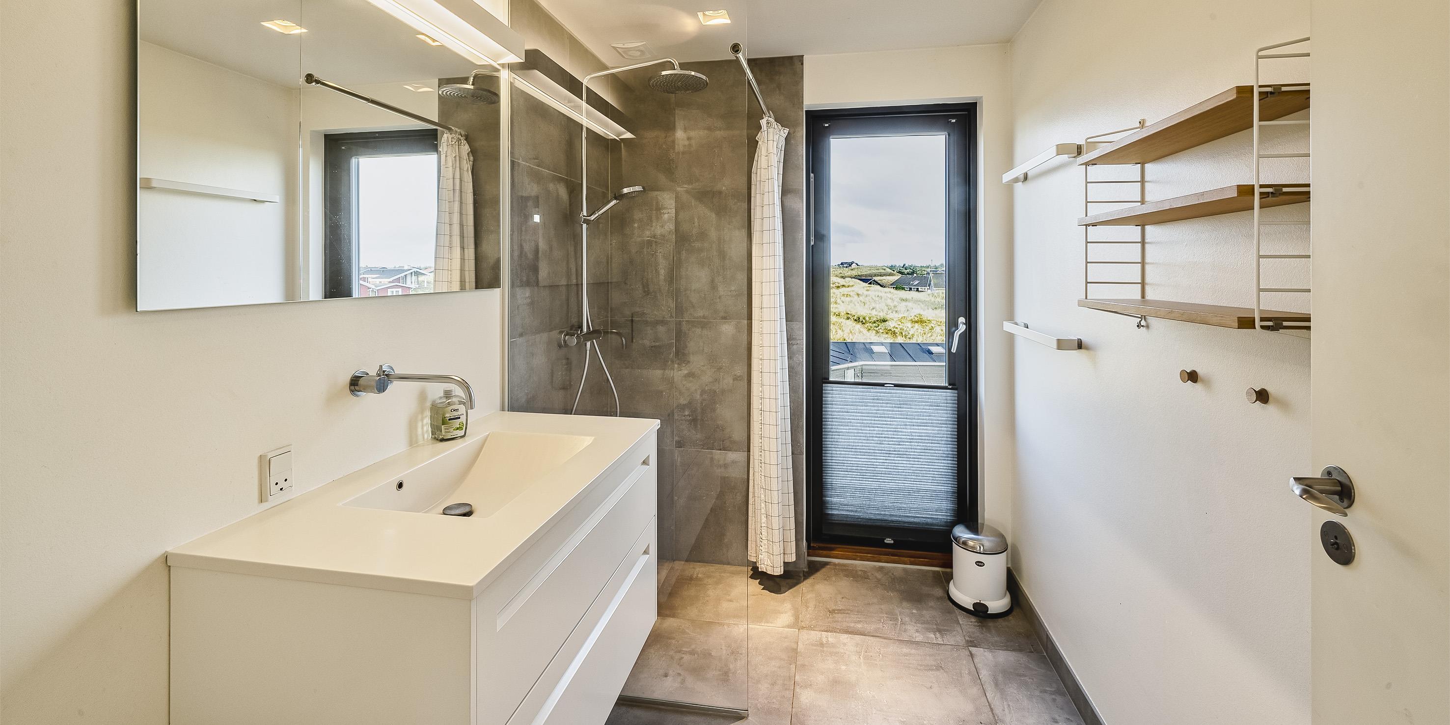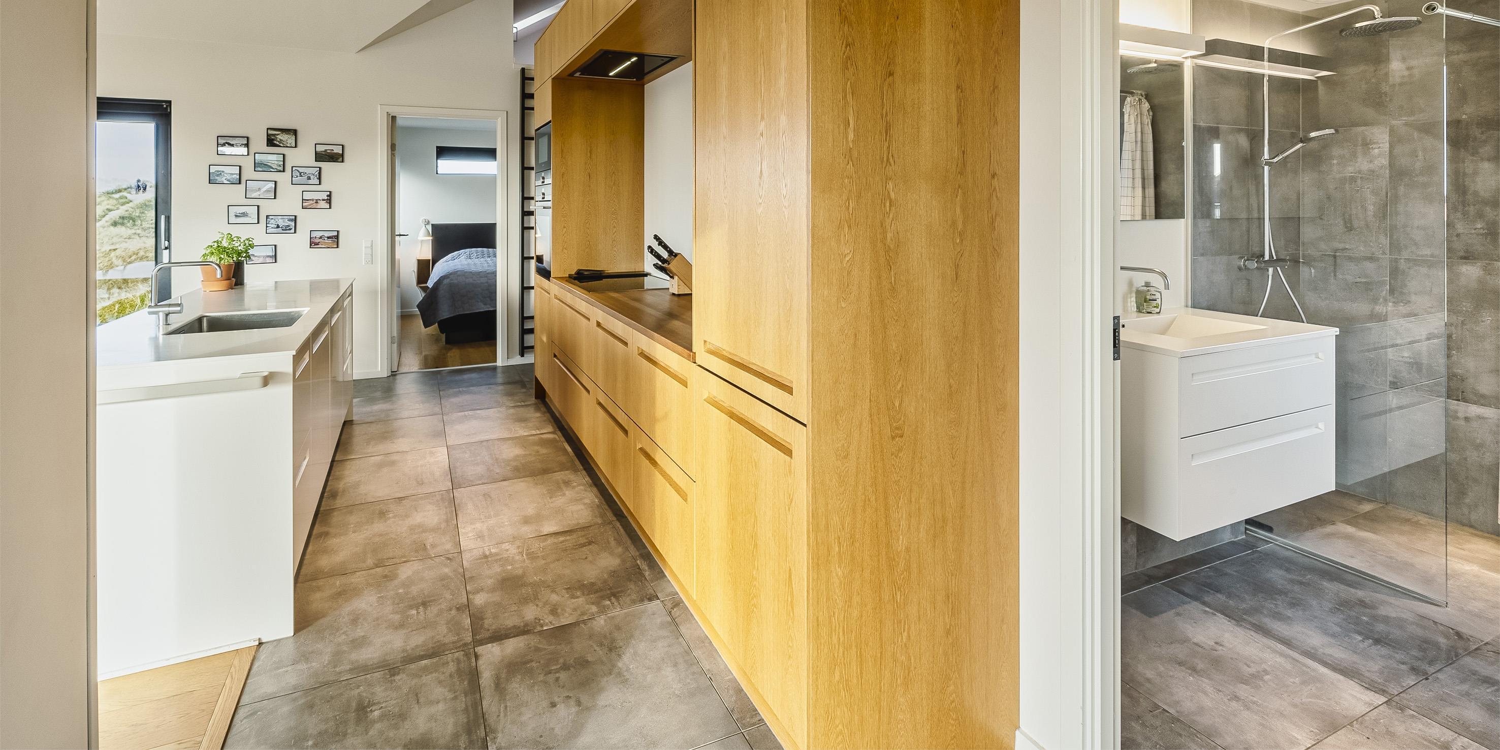Neubauferienhaus/Energiesparhaus in bevorzugter Wohngegend von Vejers Strand, auf einer Düne gelegen und mit Panoramablick Richtung Meer. Das Ferienhaus ist für 6 Personen ausgestattet und sehr modern eingerichtet. Über die Dünenkette gelangen Sie auf direktem Wege zum Strand, der nur ”Sage und Schreibe” 100 Meter entfernt ist. Der Wohnbereich ist mit dem Essbereich und der Küche verbunden und komplett offen gehalten. Das komplette Ferienhaus ist hell und freundlich gestaltet. Zwischen zwei großen Fensterfronten befindet sich der Kamin. Der Blick auf den gezündeten Kamin von der Sitzgruppe und aus den Fenstern ist einfach nur traumhaft, besser kann es nicht sein. Das deutsche Fernsehprogramm empfangen Sie über Stofa, daher sind es nur 5-8 Kanäle die Sie empfangen können. Google Chromecast. Eine Playstation 4 steht für die Bewohner des Hauses zur Verfügung. Die Küche beinhaltet einen Herd mit Cerankochfeld, einen Backofen in Arbeitshöhe, eine Geschirrspülmaschine, einer Mikrowelle und einer Kühl- und Gefrierkombination. Der Essbereich ist großzügig und bietet ausreichend Platz für alle an. Das gesamte Ferienhaus ist mit einem Laminatfußboden ausgestattet, außer die Bereiche der Bäder, Küche und des Eingangsbereich, diese sind gefliest. Eine Fußbodenheizung ist im ganzen Ferienhaus verlegt. Es gibt zwei Bäder im Ferienhaus. Beide sind mit je einem WC, einem Handwaschbecken und einer Dusche ausgestattet. Sie finden insgesamt drei Schlafzimmer im Haus: DB + DB + 2B. Eine schöne große Terrasse führt rund ums Haus, teilweise ist es eine Holzterrasse und teilweise mit Steinfliesen verlegt, wobei auch ein kleiner Teil direkt am Ferienhaus überdacht ist. Ein Gasgrill steht zur Benutzung zur Verfügung. Für Gas muss der Mieter selbser sorgen. Das Ferienhaus verfügt über einen Internetanschluss (W-Lan). Desweiteren stehen eine Waschmaschine und ein Trockner zur Verfügung, ebenfalls ein kleiner Schuppen. Das Rauchen im Ferienhaus ist nicht erlaubt. Es sind keine Haustiere erlaubt. Das Ferienhaus ist in 2016 erbaut worden.