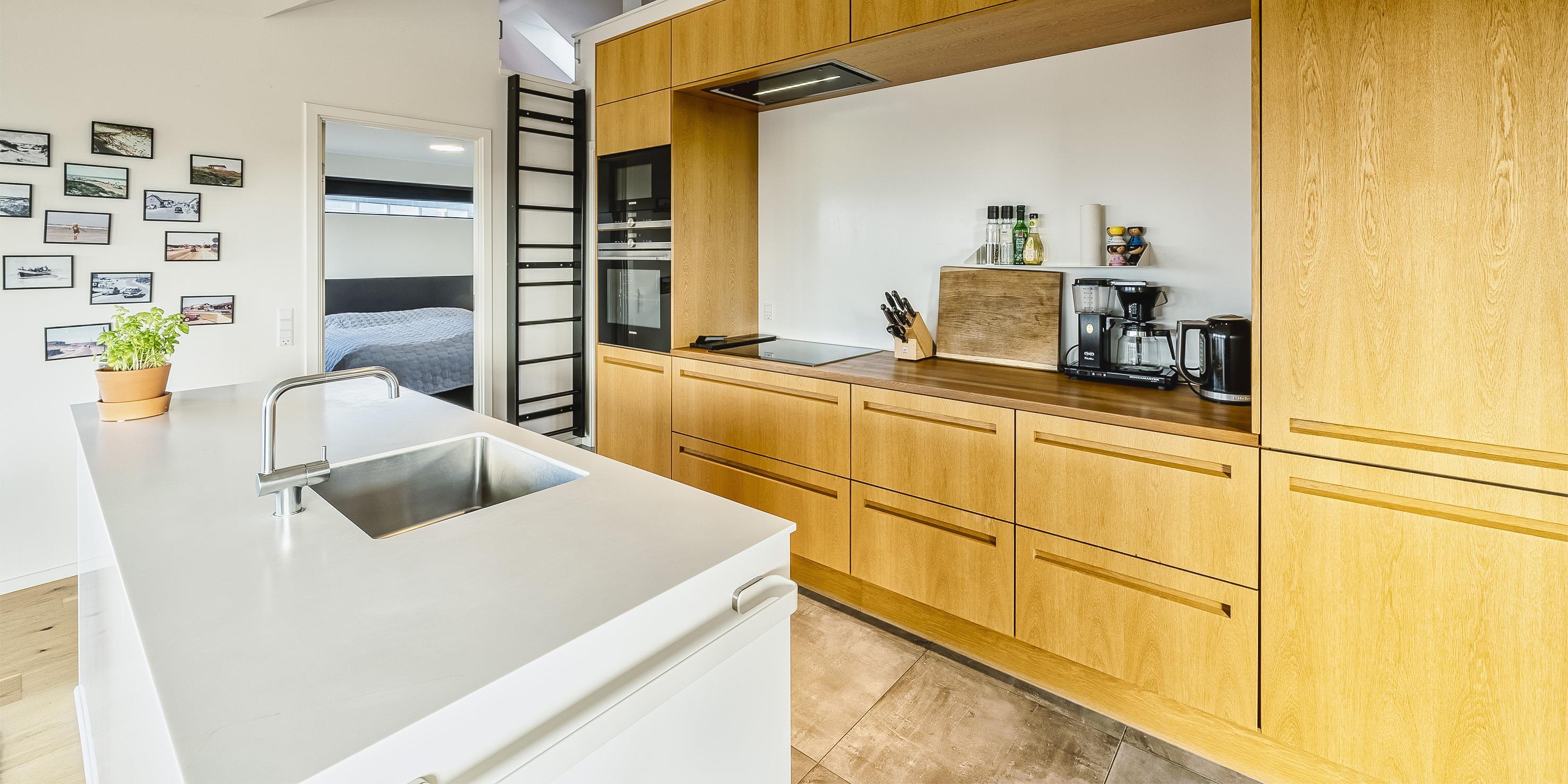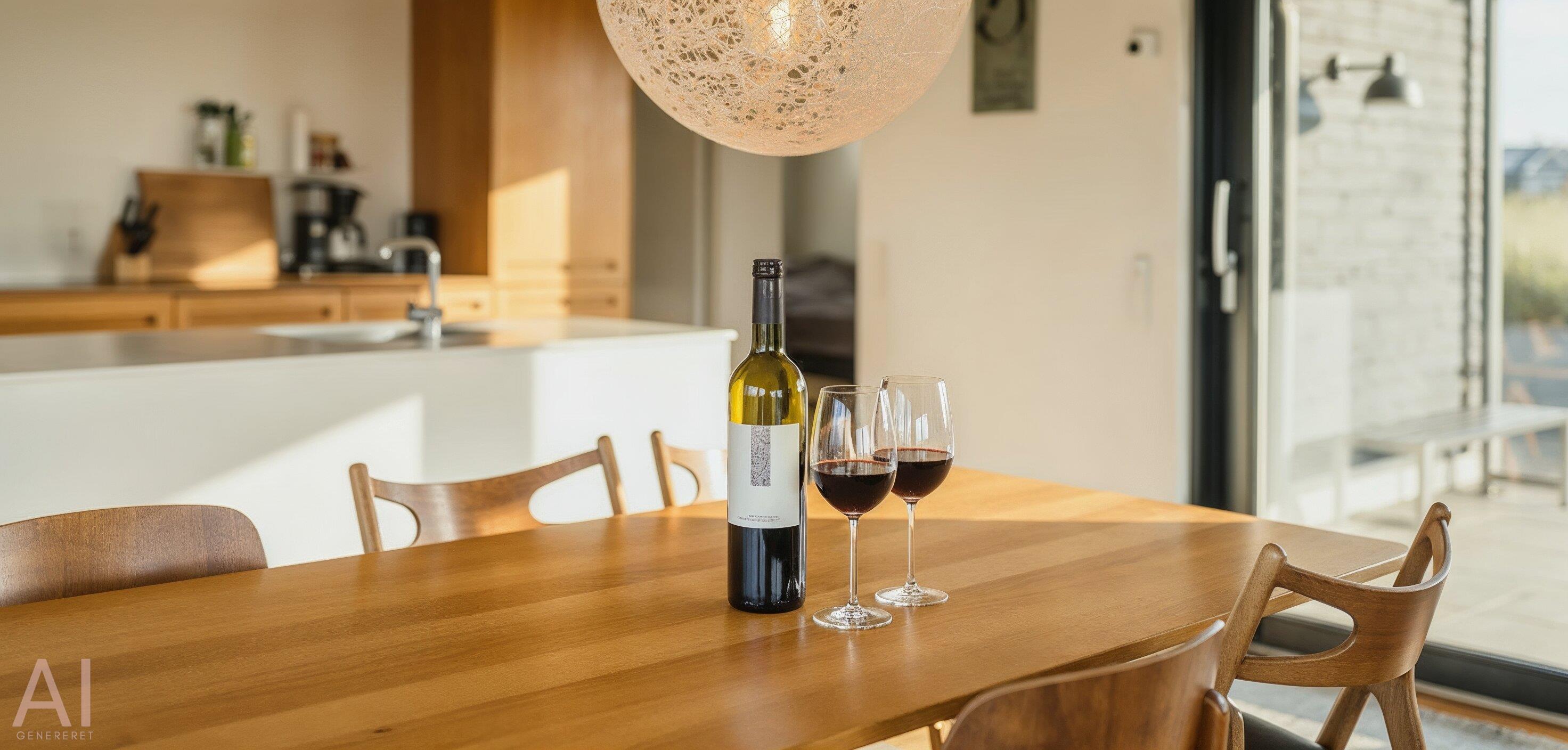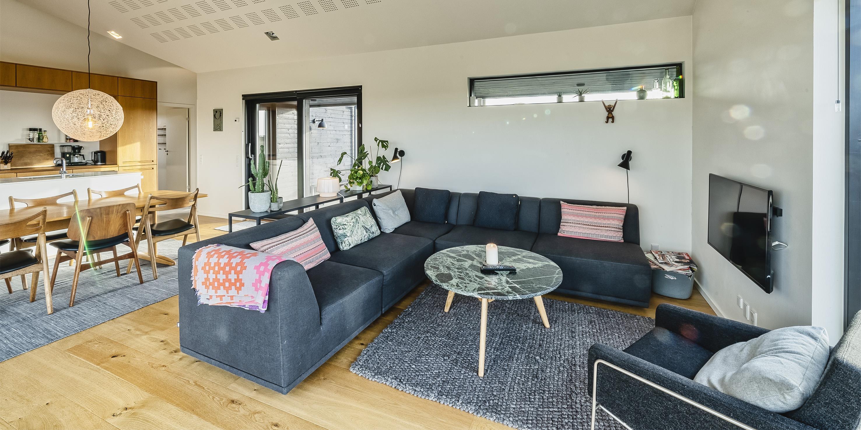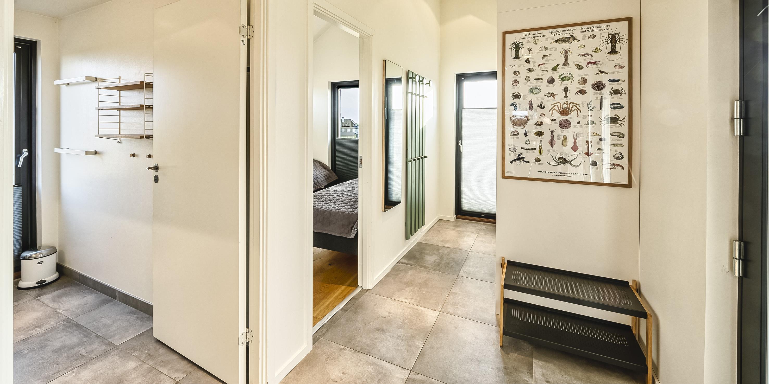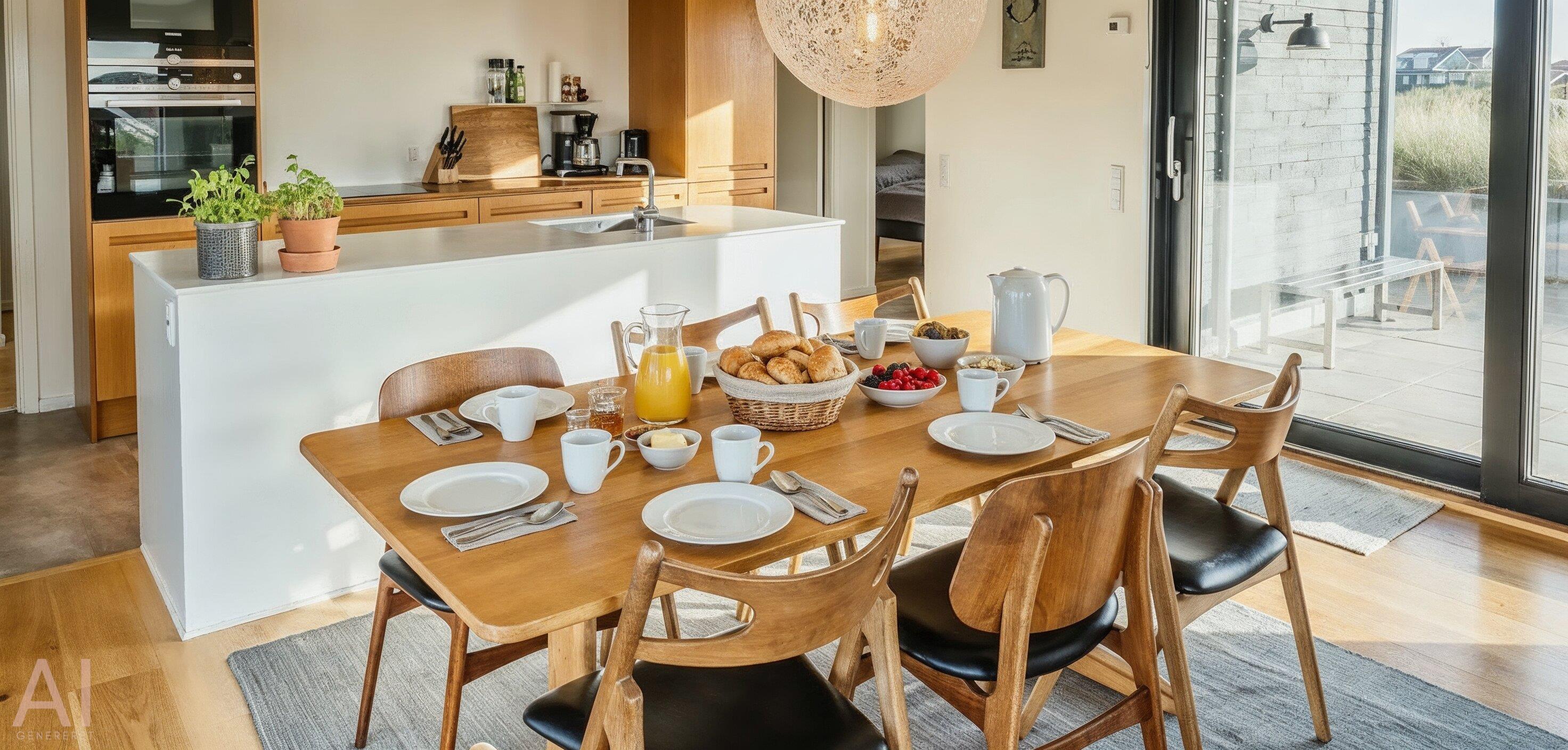 Neubauferienhaus/Energiesparhaus in bevorzugter Wohngegend von Vejers Strand, auf einer Düne gelegen und mit Panoramablick Richtung Meer. Das Ferienhaus ist für 6 Personen ausgestattet und sehr modern eingerichtet. Über die Dünenkette gelangen Sie auf direktem Wege zum Strand, der nur ”Sage und Schreibe” 100 Meter entfernt ist. Der Wohnbereich ist mit dem Essbereich und der Küche verbunden und komplett offen gehalten. Das komplette Ferienhaus ist hell und freundlich gestaltet. Zwischen zwei großen Fensterfronten befindet sich der Kamin. Der Blick auf den gezündeten Kamin von der Sitzgruppe und aus den Fenstern ist einfach nur traumhaft, besser kann es nicht sein. Das deutsche Fernsehprogramm empfangen Sie über Stofa, daher sind es nur 5-8 Kanäle die Sie empfangen können. Google Chromecast. Eine Playstation 4 steht für die Bewohner des Hauses zur Verfügung. Die Küche beinhaltet einen Herd mit Cerankochfeld, einen Backofen in Arbeitshöhe, eine Geschirrspülmaschine, einer Mikrowelle und einer Kühl- und Gefrierkombination. Der Essbereich ist großzügig und bietet ausreichend Platz für alle an. Das gesamte Ferienhaus ist mit einem Laminatfußboden ausgestattet, außer die Bereiche der Bäder, Küche und des Eingangsbereich, diese sind gefliest. Eine Fußbodenheizung ist im ganzen Ferienhaus verlegt. Es gibt zwei Bäder im Ferienhaus. Beide sind mit je einem WC, einem Handwaschbecken und einer Dusche ausgestattet. Sie finden insgesamt drei Schlafzimmer im Haus: DB + DB + 2B. Eine schöne große Terrasse führt rund ums Haus, teilweise ist es eine Holzterrasse und teilweise mit Steinfliesen verlegt, wobei auch ein kleiner Teil direkt am Ferienhaus überdacht ist. Ein Gasgrill steht zur Benutzung zur Verfügung. Für Gas muss der Mieter selbser sorgen. Das Ferienhaus verfügt über einen Internetanschluss (W-Lan). Desweiteren stehen eine Waschmaschine und ein Trockner zur Verfügung, ebenfalls ein kleiner Schuppen. Das Rauchen im Ferienhaus ist nicht erlaubt. Es sind keine Haustiere erlaubt. Das Ferienhaus ist in 2016 erbaut worden.