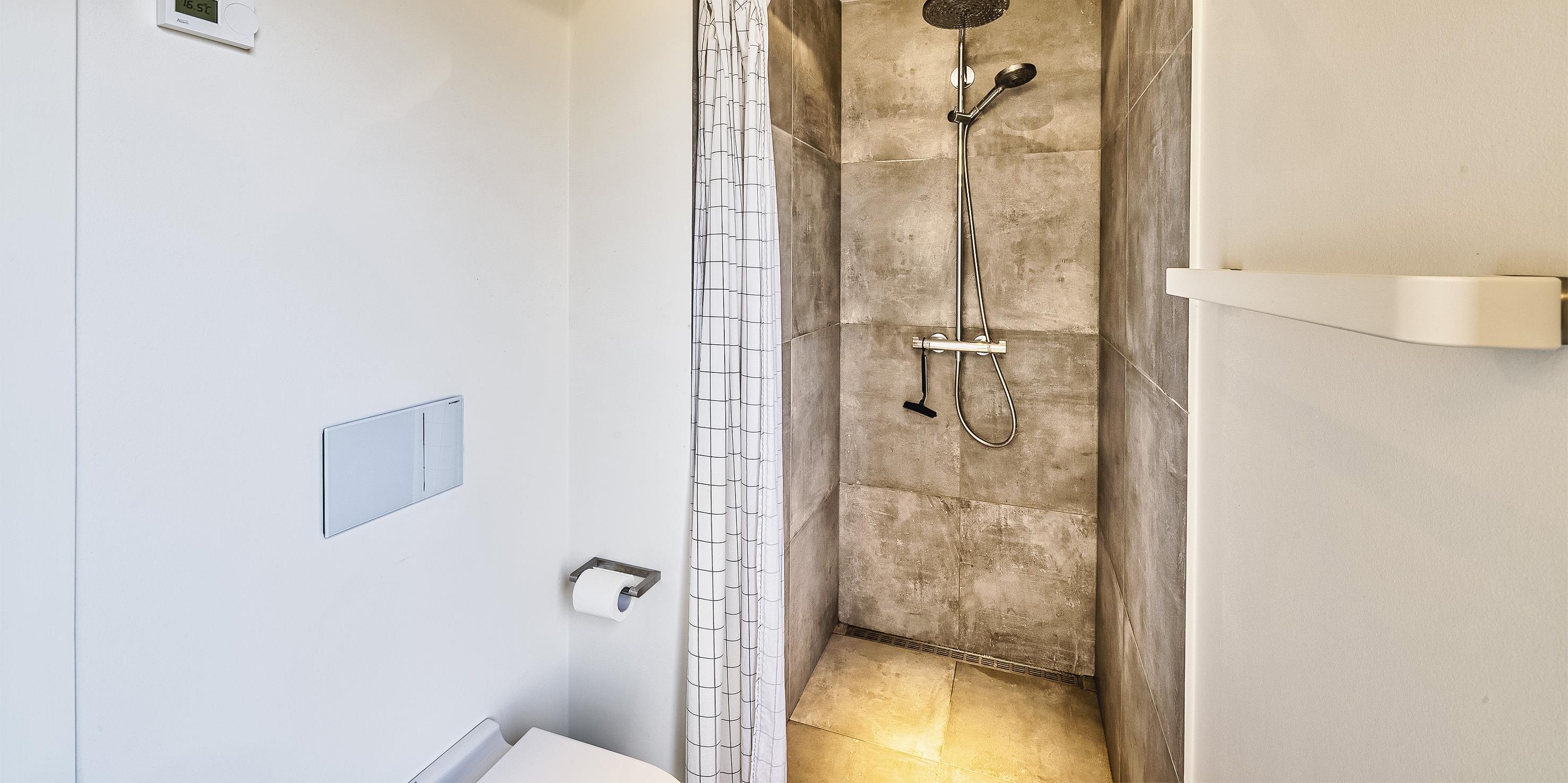 Badezimmer mit Toilette, Dusche und Waschbecken