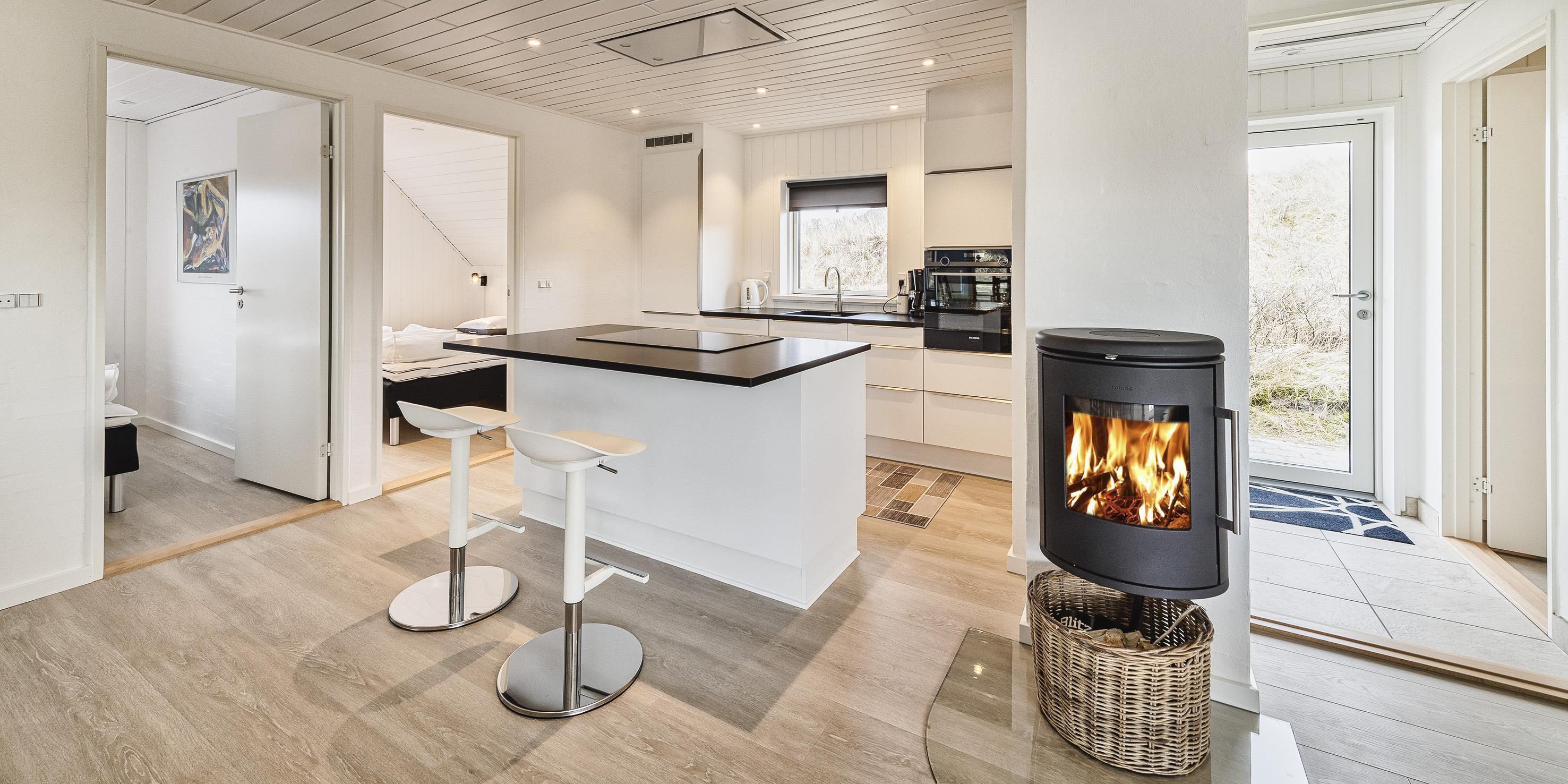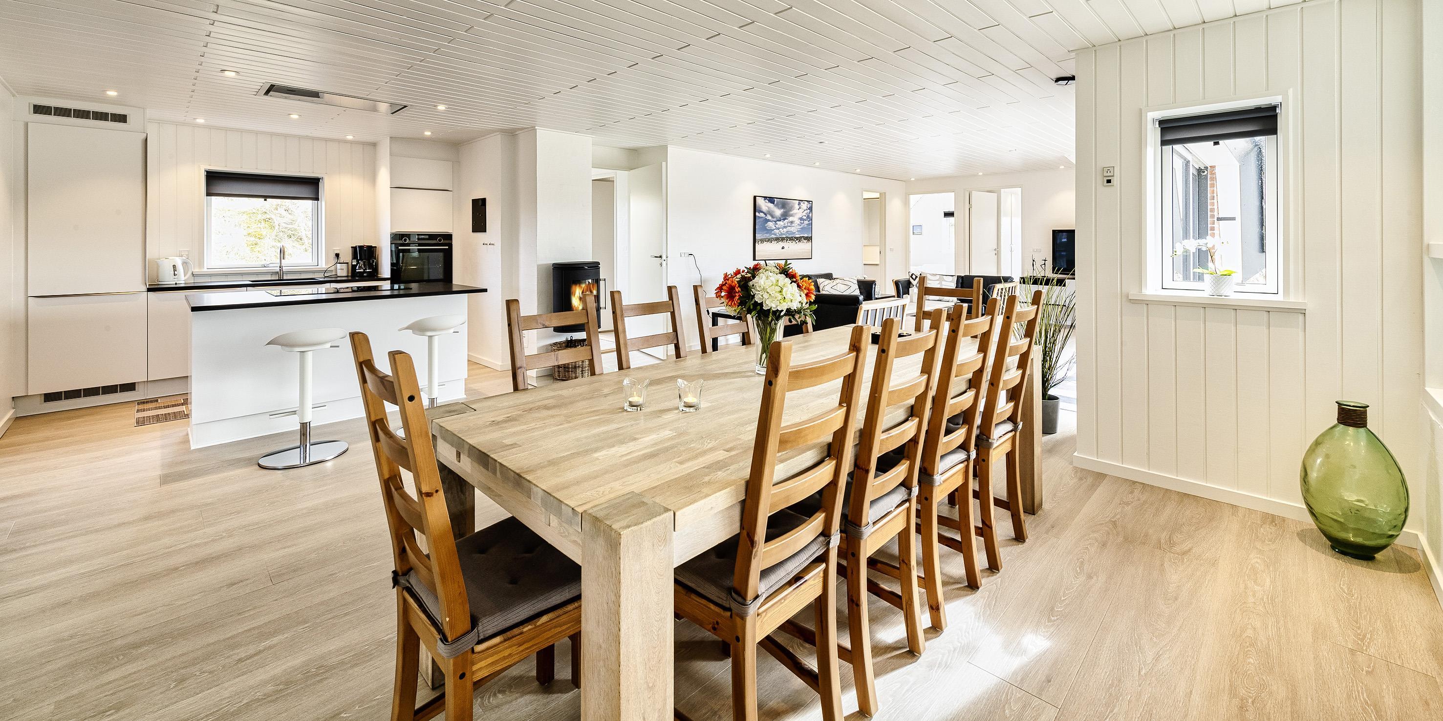 Geschmackvoll und renoviertes Poolhaus für 10 Personen, direkt auf einer Düne gelegen in Mitten einer Dünenkette. Der Bjærgevej in Vejers Strand ist eine bevorzugte Wohngegend, da der Strand sich nur 100 Meter (Dünenweg) vom Haus befindet. Das Ferienhaus ist in L-Form und in der Mitte befindet sich eine schöne gräumige Steinterrasse. Auf den zwei schönen Sonnenliegen können Sie dann den Tag geniessen. Der Wohn- und Essbreich ist mit einem schönen und hellem Lamit ausgestattet, ebenso der Küchenbereich und die Schlafzimmer. Von der gemütlichen Sitzgruppe haben Sie einen direkten Blick auf den Terrassenbereich und die Dünenkette in Richtung Strand. Gegenüber dem Esstisch befindet sich der hängende Kamin. Dieser spendet eine wohlige Wärme und Gemütlichkeit pur. Das Fernsehprogramm empfangen Sie über Stofa, daher stehen nur 5-8 deutsche Kanäle zur Verfügung. Die Essgruppe verfügt über einen grossen Holztisch und Stühle und befindet sich vor der Poolabteilung. Der Poolbereich ist mit einer grossen Fensterfront vom Ferienhaus abgeteilt und zugängig. Der Küchenbereich ist offen und sehr modern eingerichtet. Es gibt eine Kochinsel wo sich der Herd mit Induktionskochfeld und oben an der Decke eine Dunstabzugshaube befindet. Die moderne Einbauküche hat einen Backofen in arbeitshöhe, eine Geschirrspülmaschine, eine Mikrowelle und eine Kühl- und Gefrierkombination (2 Schubladen). Es gibt zwei Bäder im Ferienhaus. Beide verfügen über ein Handwaschbecken, ein WC und eine Dusche. In einem der Bäder sind die Waschmaschine und der Trockner untergebracht. Die Bäder und der Eingangsbereich sind mit Fleisen ausgestattet. In dem Flurbereich befindet sich ein Kleiderschrank. Insgesamt stehen den Gästen fünf Schlafzimmer zur Verfügung: DB + DB + DB + DB + 2B. Vier der Schlafzimmer sind mit je einem Doppelbett ausgesattet und ein Schlafzimmer verfügt über Etagenbetten (Maass 90 x 180). Der Pool hat eine Grösse von ca.7,3 x 3,3 x1,30 Meter (Længe x Breite x Tiefe) und Sie haben einen tollen Ausblick auf die Dünen wenn Sie im Pool schwimmen. Hier in der Poolabteilung befindet sich die Sauna und der Standwasser-Whirlpool ( für ca. 5 Personen) und auch Relaxliegen. Der Standwasser-Whirlpool ist ständig mit Wasser gefüllt und dann sofort bei Anreise betriebsbereit und nutzbar. Einmal die Woche kommt ein Pooltechniker vorbei und kontrolliert den Wert im Pool. Das Ferienhaus verfügt über einen Internetanschluss (W-Lan). Das Haus ist 1993 erbaut worden und in 2021 total von innen renoviert. Es max. ein Haustier erlaubt. Das Rauchen im Ferienhaus ist nicht erlaubt. Eine Parkmöglichkeit direkt am Ferienhaus ist nicht gegeben. Zum Haus gibt es einen direkten Treppenaufgang.