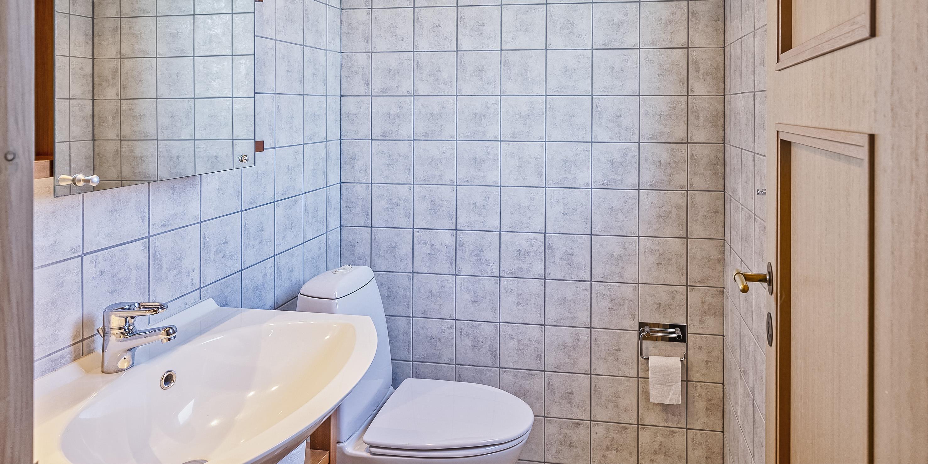Badezimmer mit Toilette, Dusche und Waschbecken