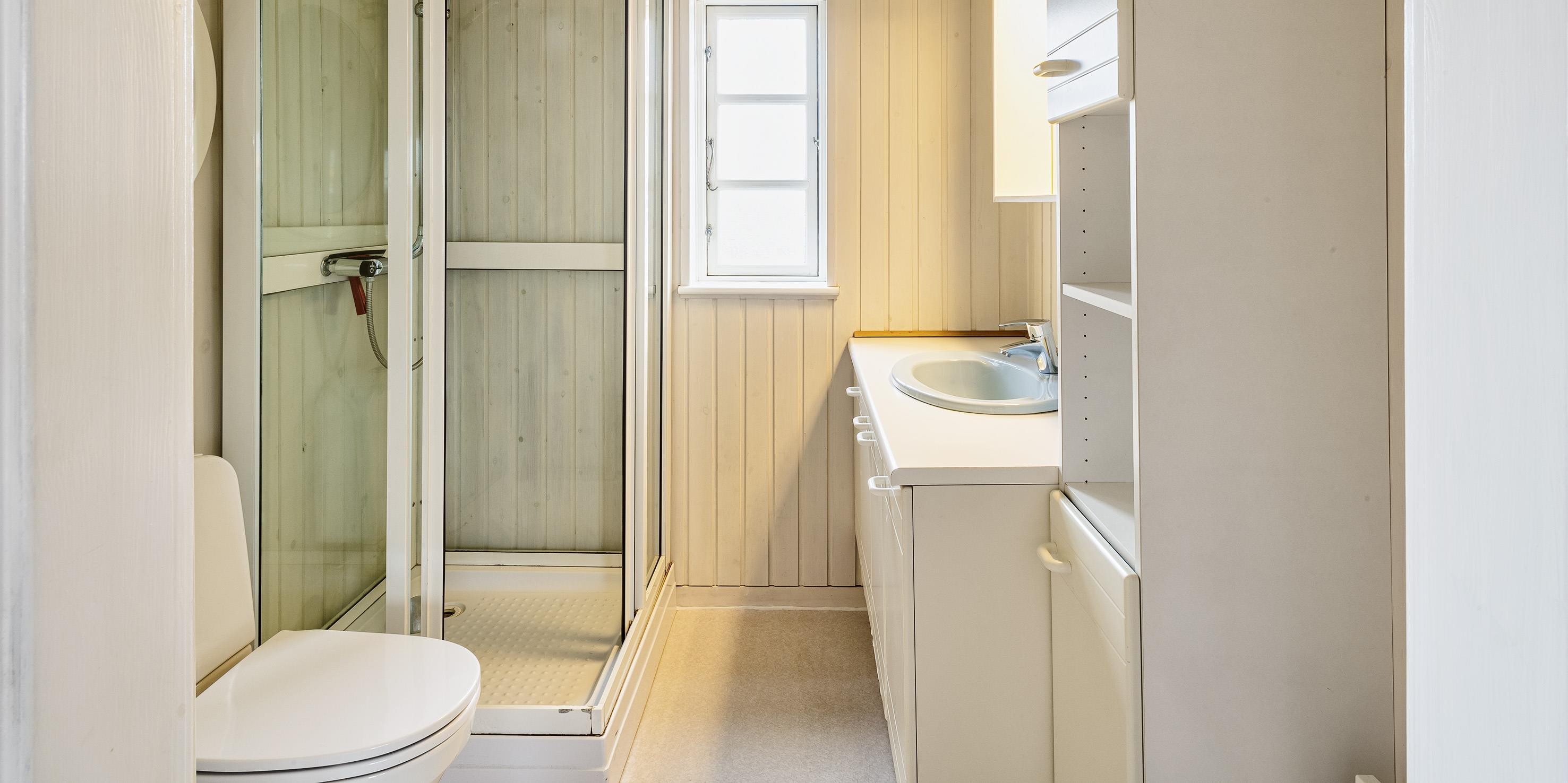 Badezimmer mit Toilette, Dusche und Waschbecken